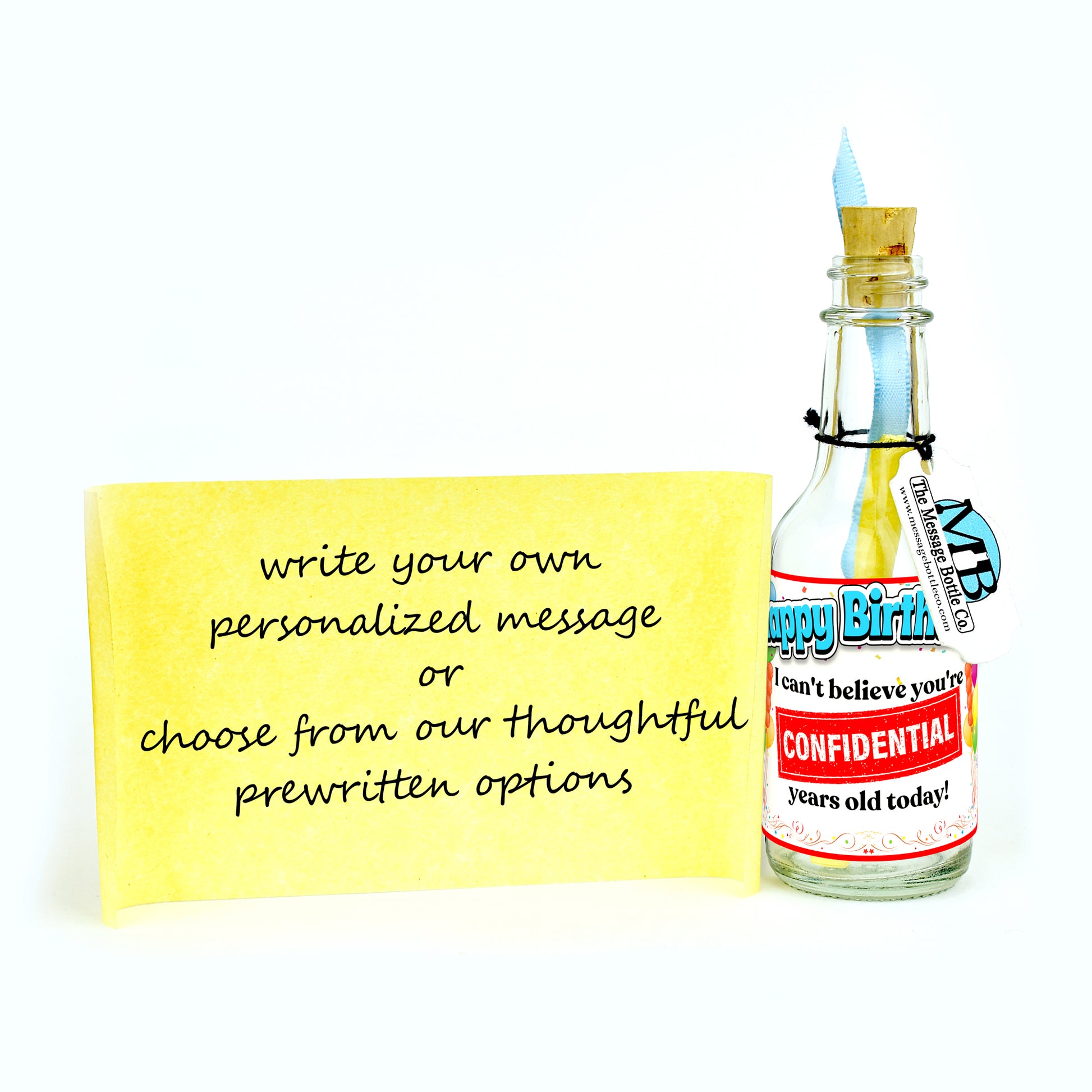 Celebrate their special day with a cheeky twist using our "A Need To Know Basis" Message Bottle. The playful message reads, "Happy Birthday, I can't believe you're [Confidential Stamp] years old," with a "Confidential" stamp covering their age—because sometimes, acknowledging the number is best left to the imagination!