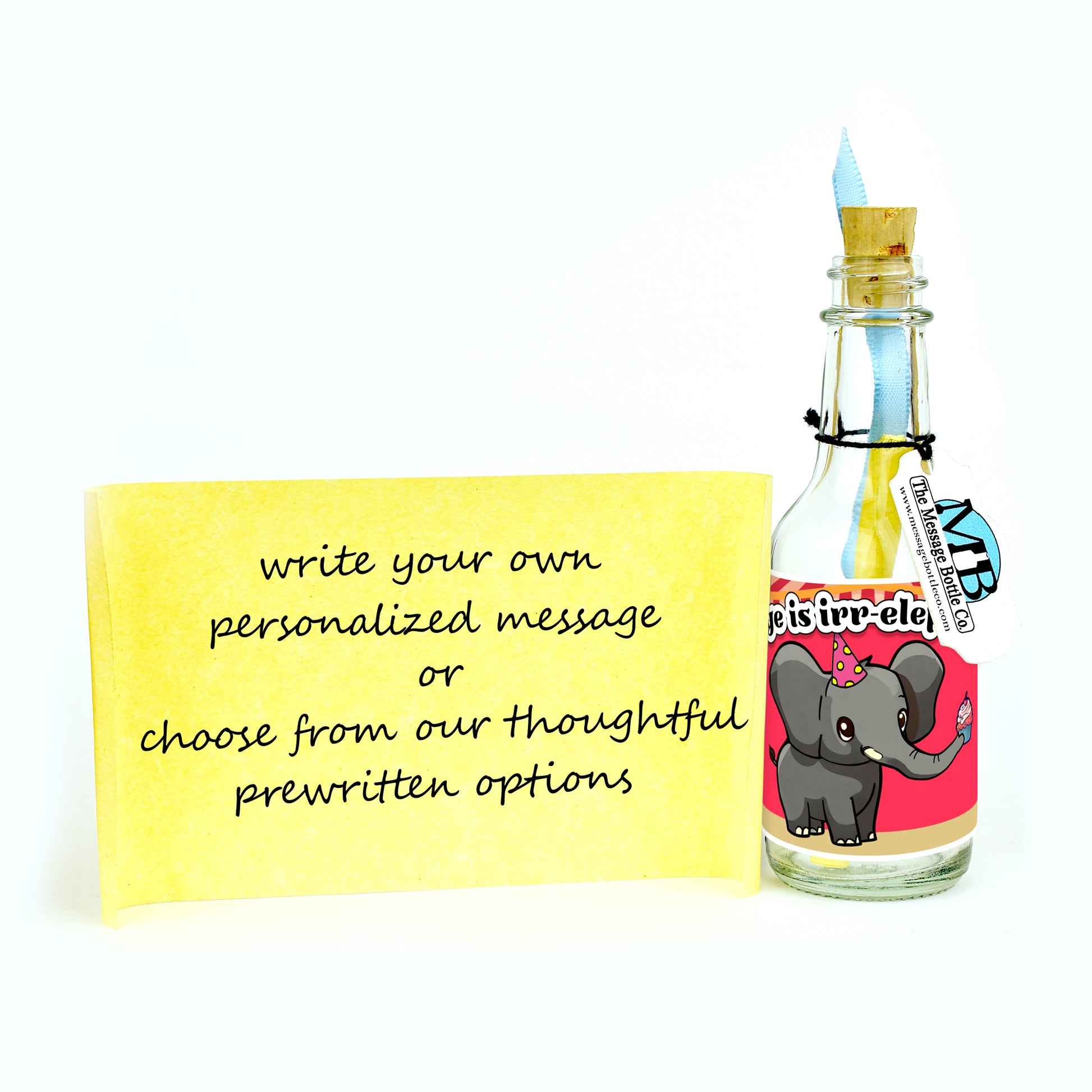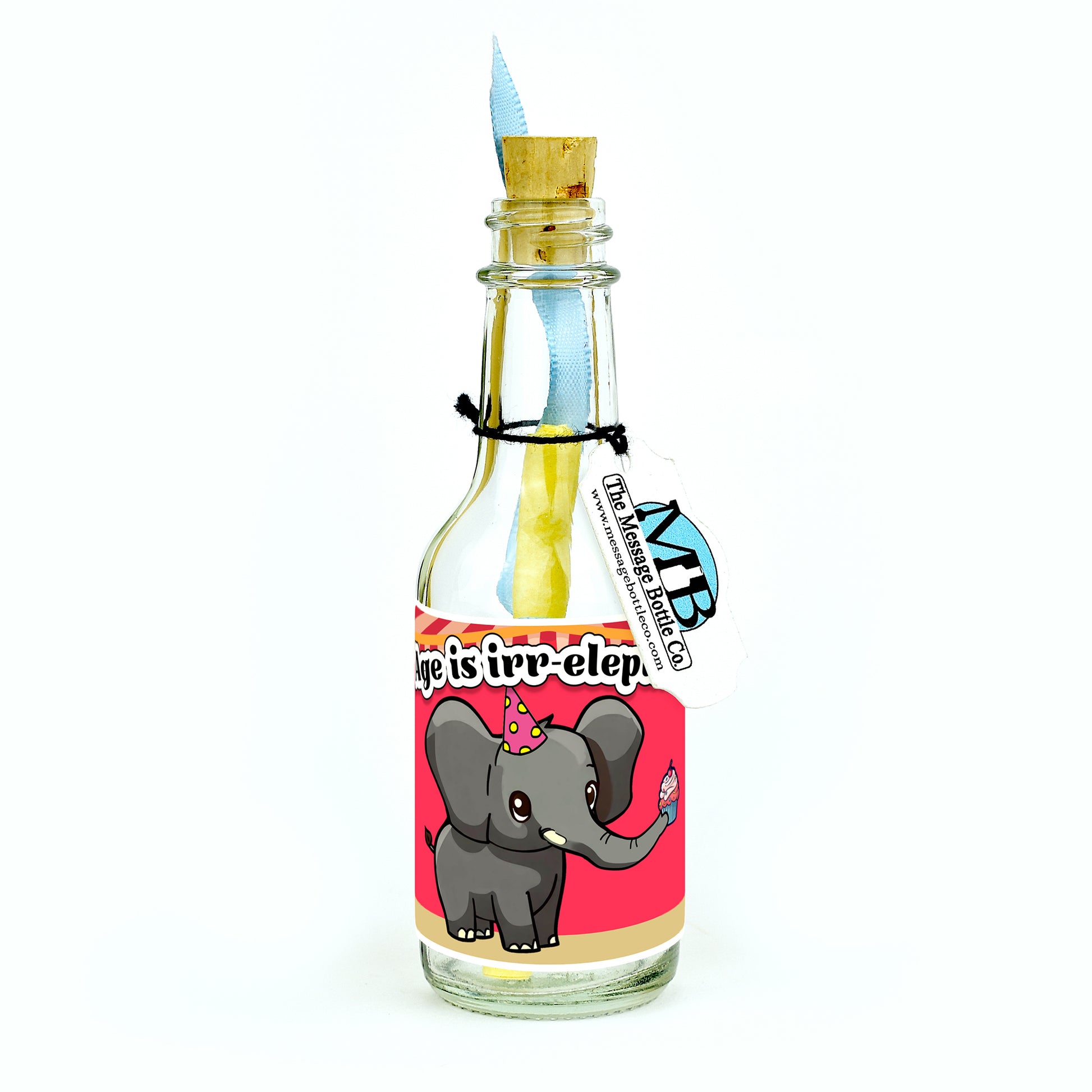 Spread joy and merriment with a trunkful of laughter using our cheerful 'Age is Irr-Elephant' Message Bottle. The playful elephant and the witty birthday message create a fun and endearing greeting that's sure to make the recipient's day extra special.