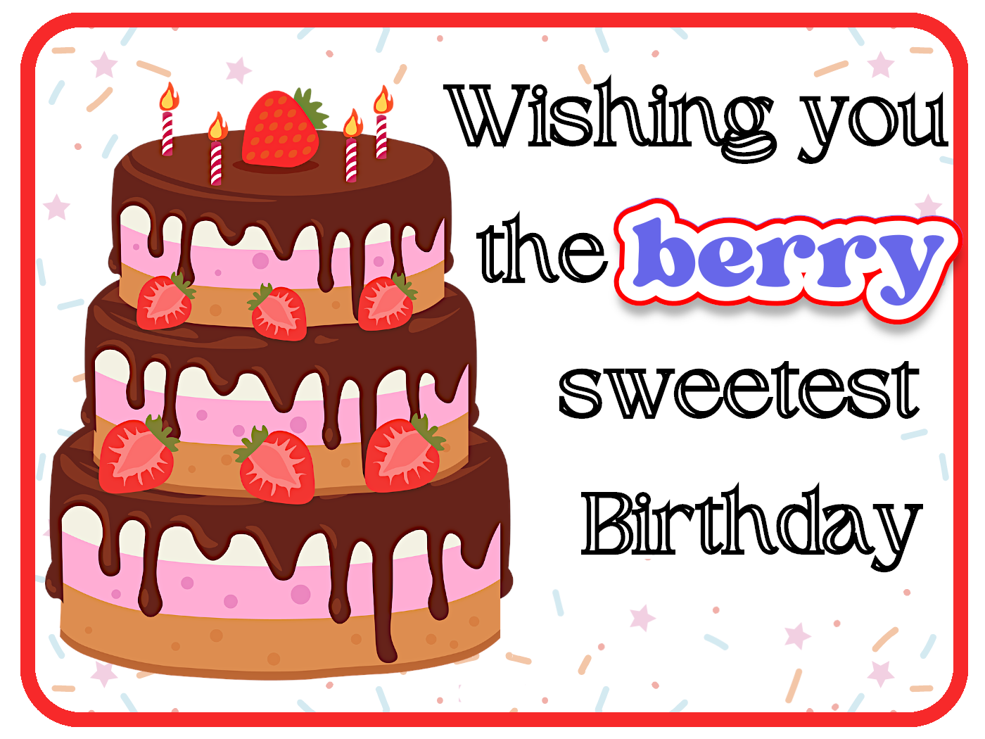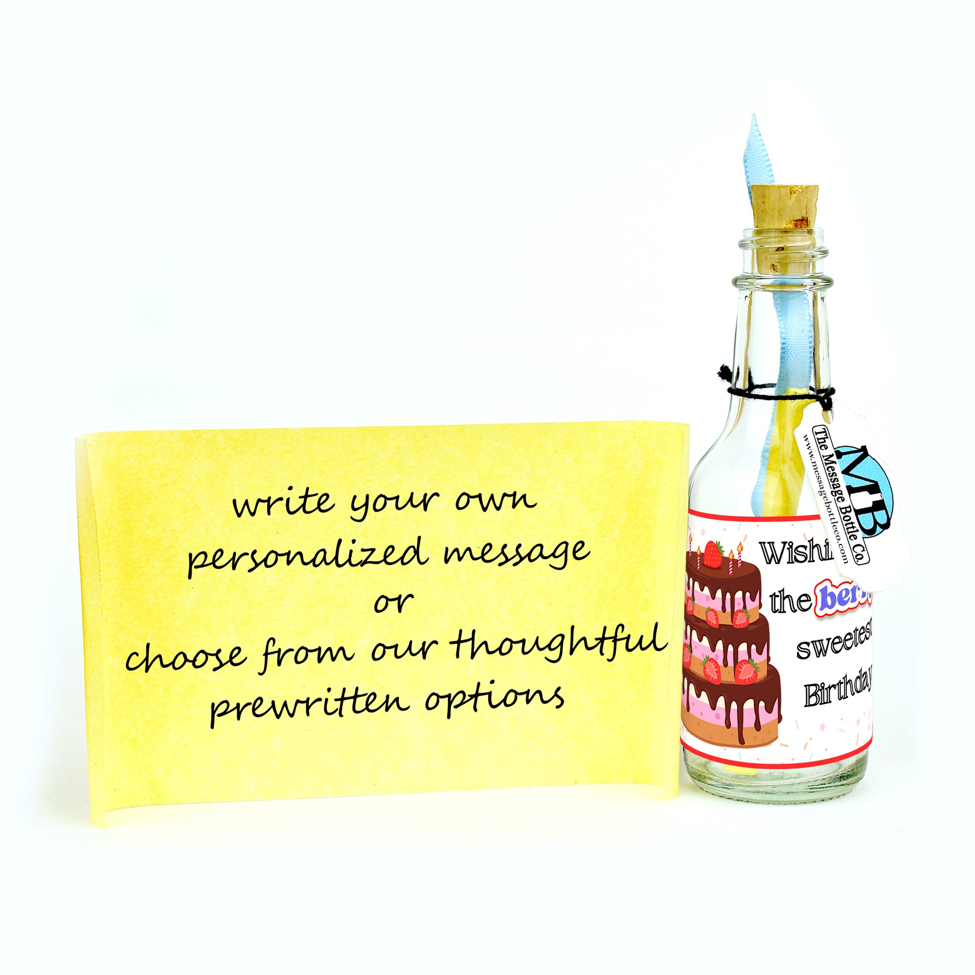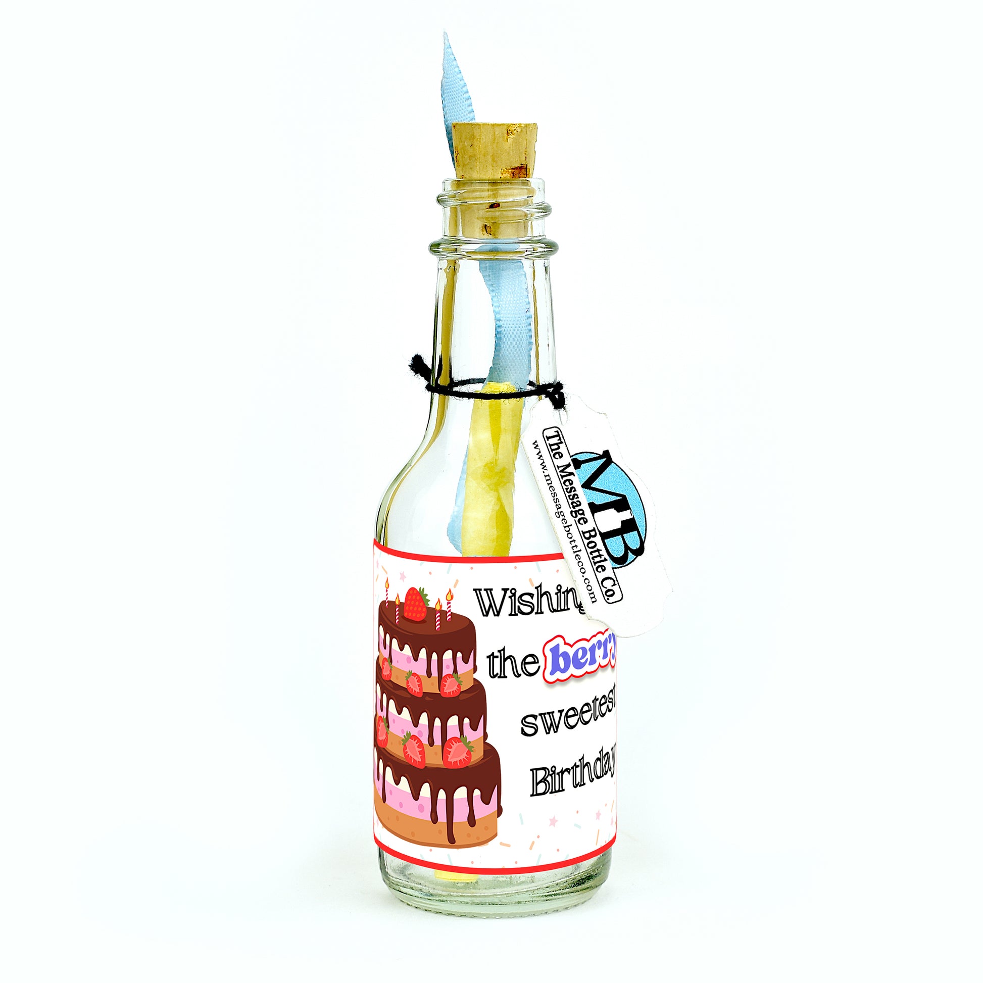 Send a deliciously sweet birthday wish with our charming "Berry Sweetest Birthday" Message Bottle. Featuring a beautifully illustrated birthday cake adorned with strawberries, this label delivers the message, "Wishing you the berry sweetest birthday" with a touch of fruity fun.