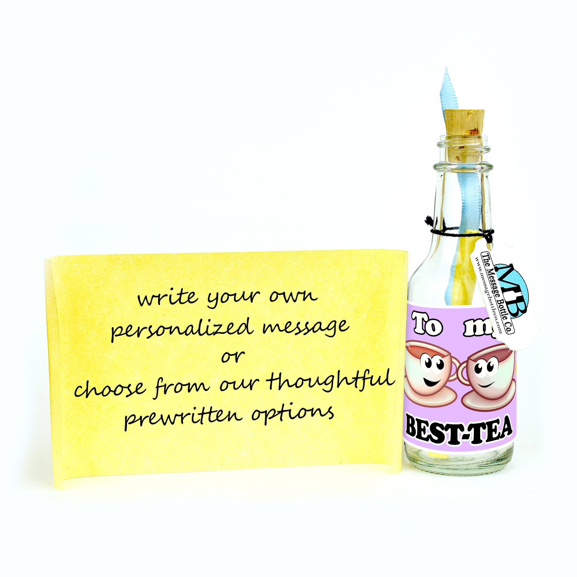 Celebrate the cherished bond of friendship on Best Friends Day with this delightful Message Bottle. Featuring two smiling cartoon cups of tea, the label reads "To my bes-tea," playfully capturing the warmth and comfort of your friendship.