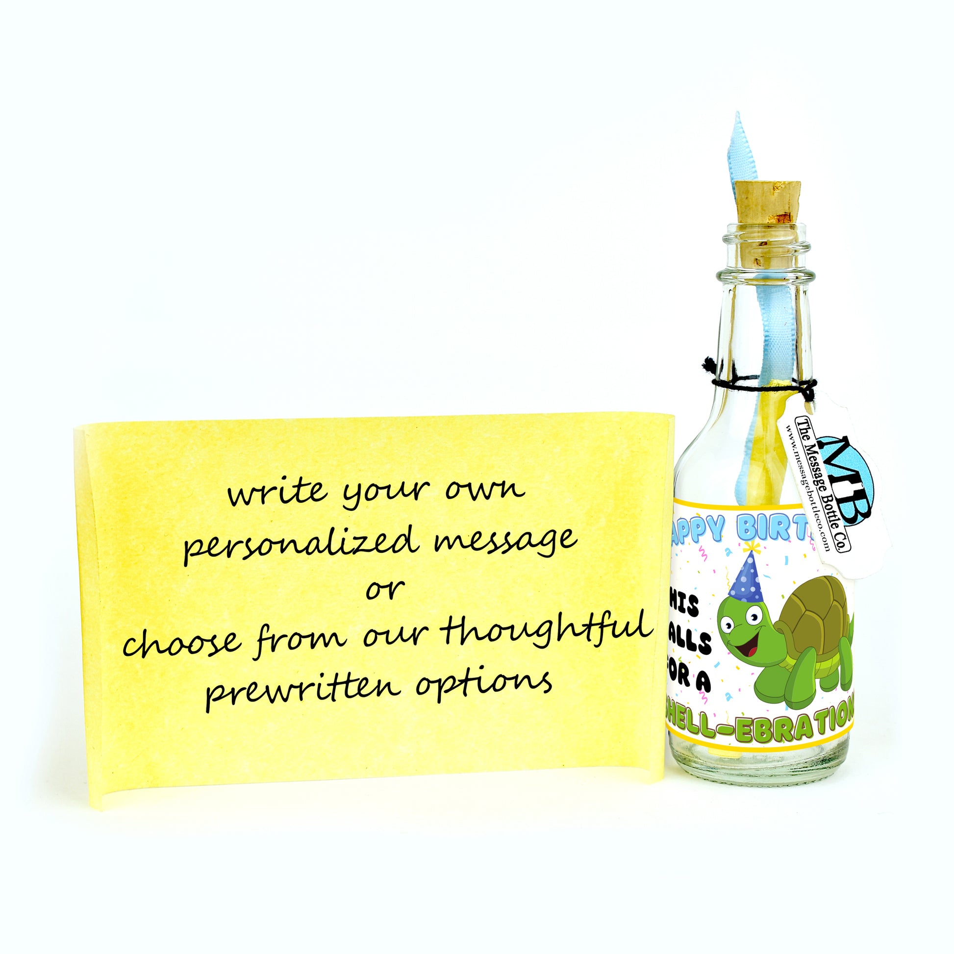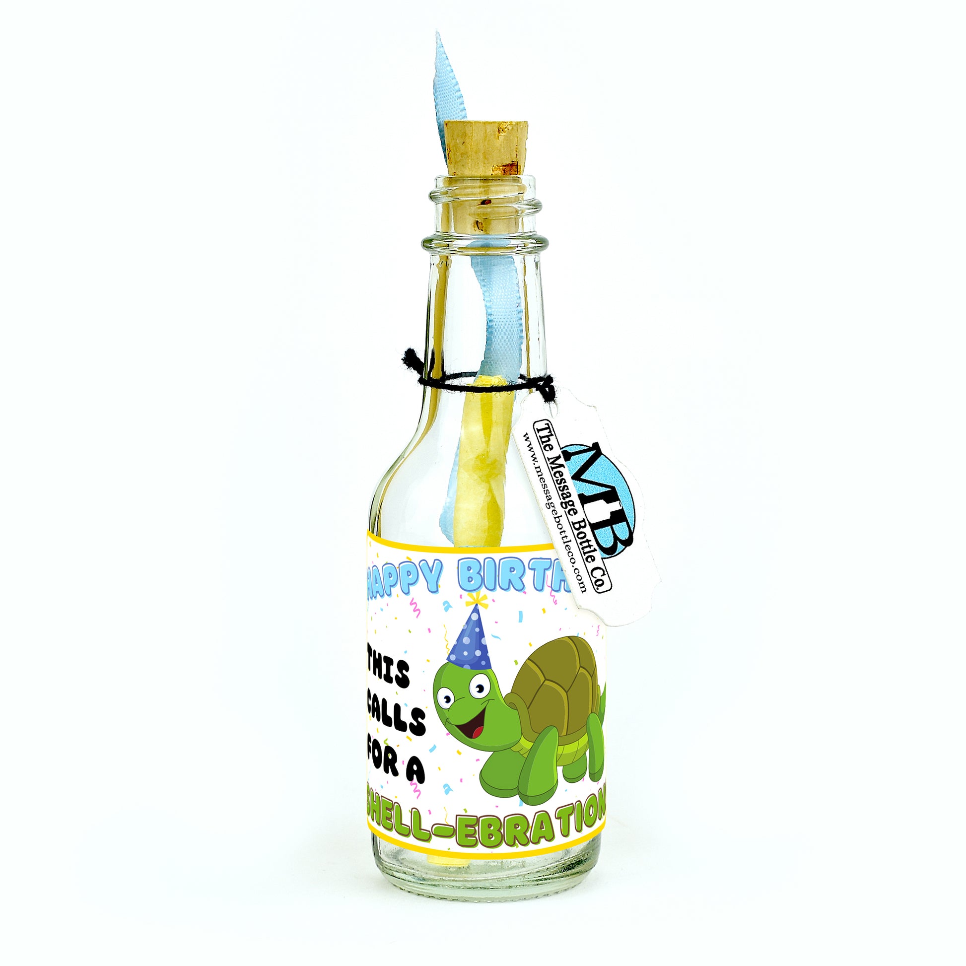 Celebrate in turtle-tastic style with our "Birthday Shell-ebration" Message Bottle! Featuring a cheerful turtle sporting a party hat, this label reads, "Happy Birthday, This calls for a shell-ebration!"—because every birthday deserves a slow and steady dose of fun