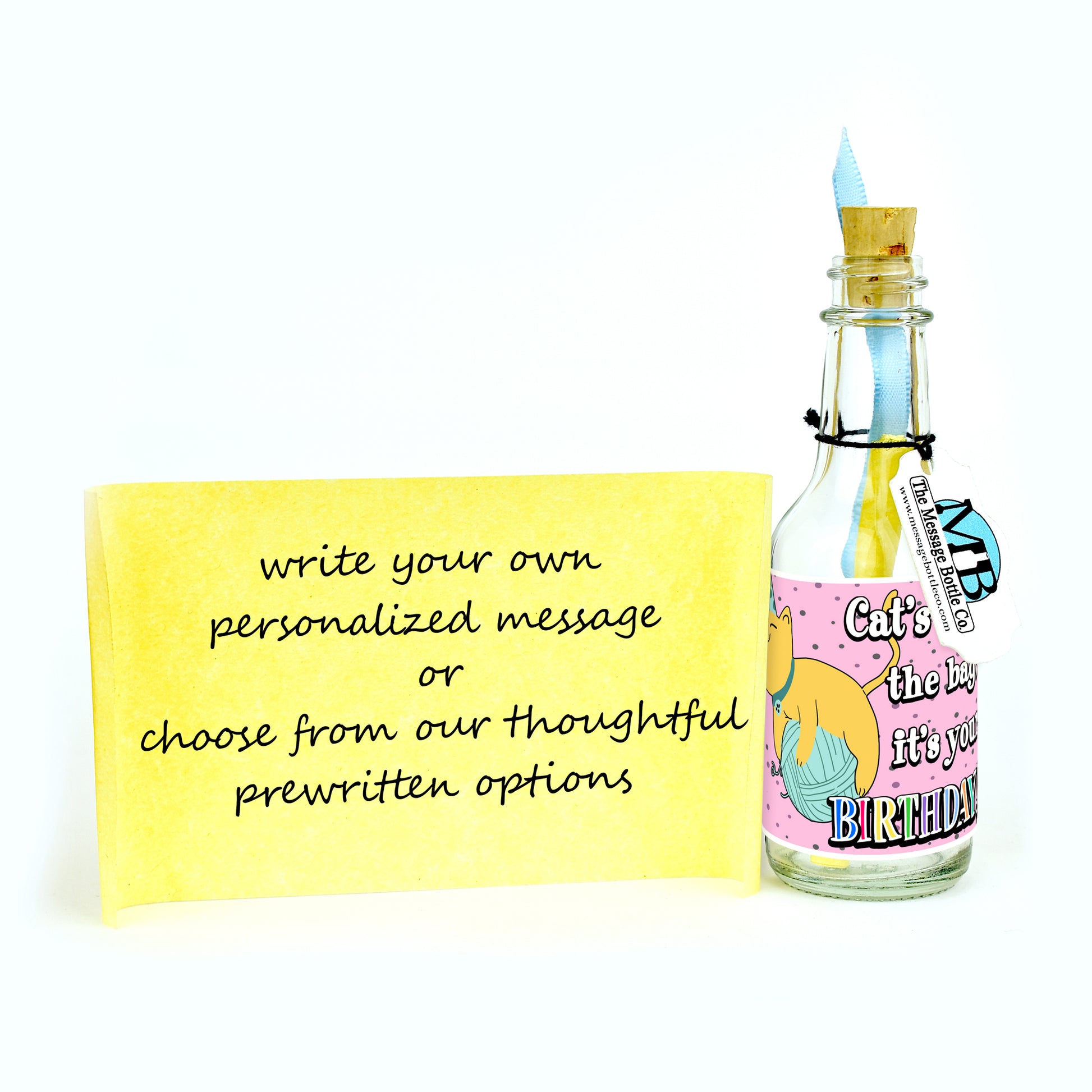 Celebrate in style with this whimsical birthday Message Bottle. The cheerful cat and the witty birthday message create a lighthearted and endearing greeting that's sure to warm their heart.