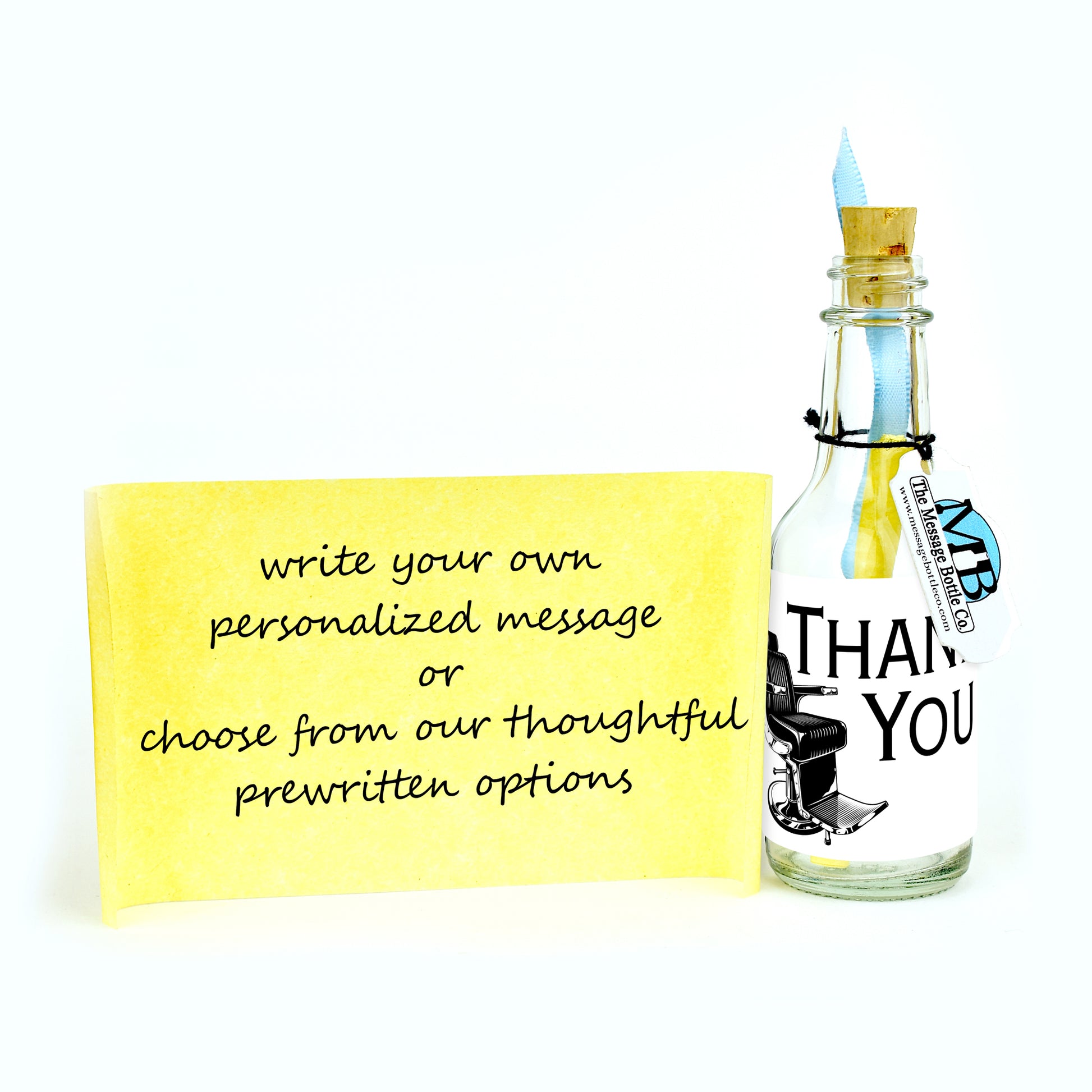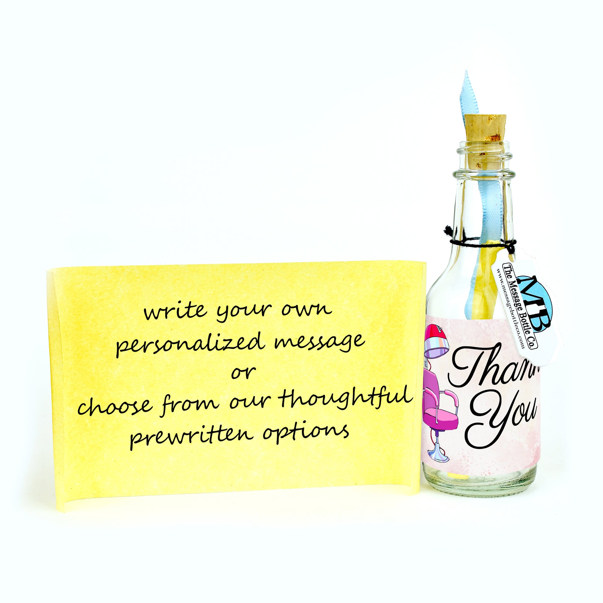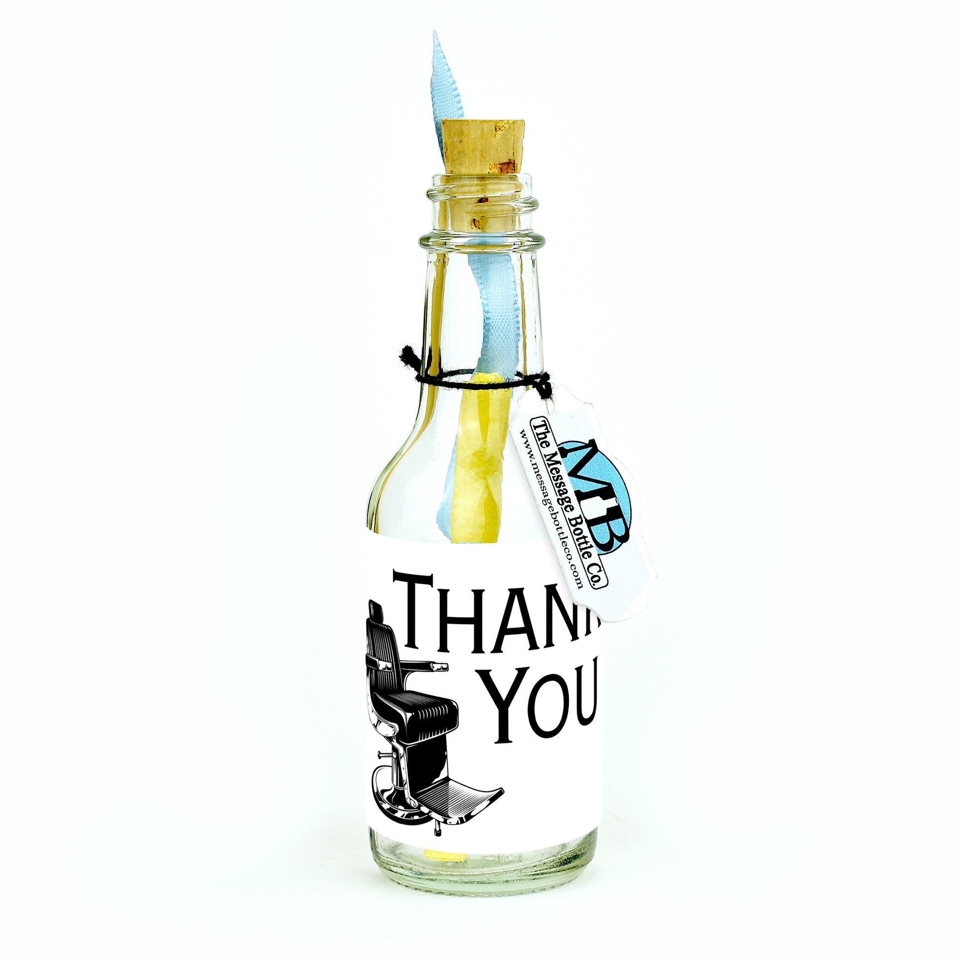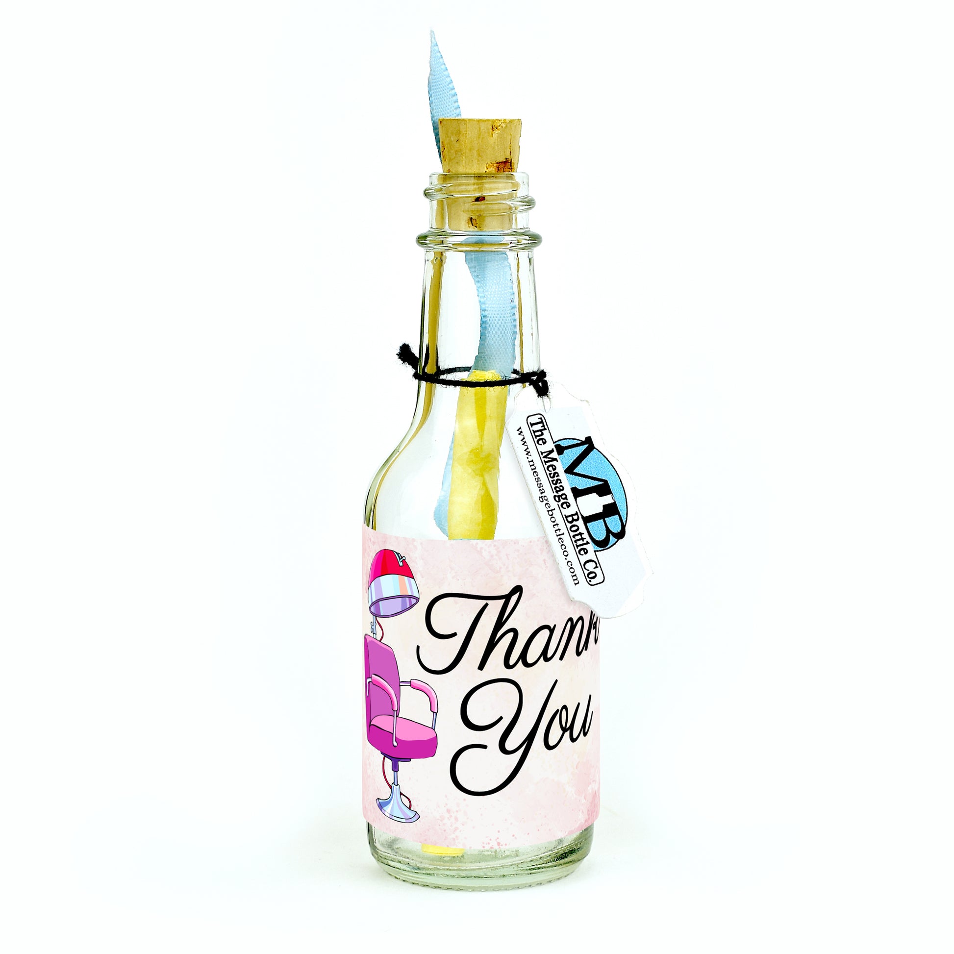 A chic celebration of appreciation, the “Chair-ished Gratitude” Message Bottle comes in two stylish variants. The first features a pink salon chair over a soft, watercolor-inspired background with loopy script reading “Thank You,” radiating feminine charm and elegance. The second showcases a sleek black leather barber chair on a crisp white background with bold, capitalized lettering, exuding modern sophistication and strength. Both designs capture the essence of salon and barber culture while conveying heartfelt thanks.
