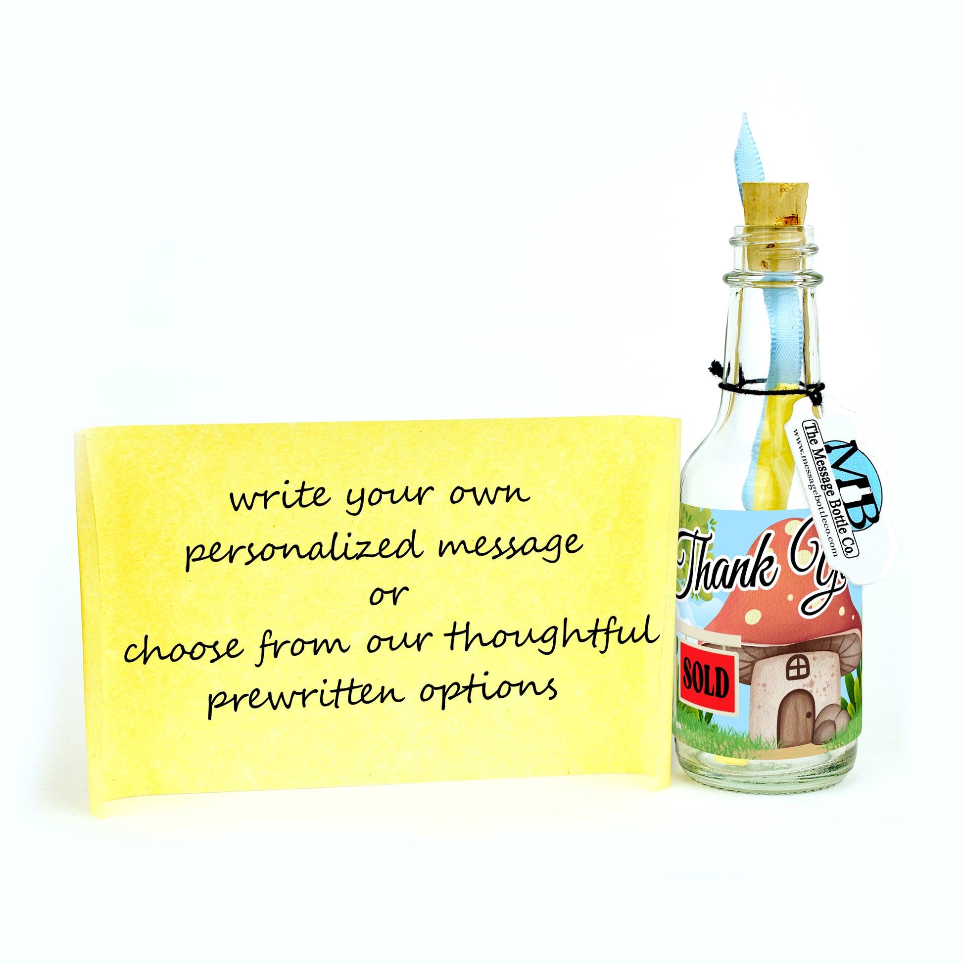 Whimsical, charming, and full of personality, the “Cozy Closing” Message Bottle features an adorable mushroom house nestled in the woods, complete with a “Sold” yard sign in front. The playful illustration radiates warmth, success, and heartfelt appreciation, making it a delightful way to celebrate both a home and the people who make your business thrive.