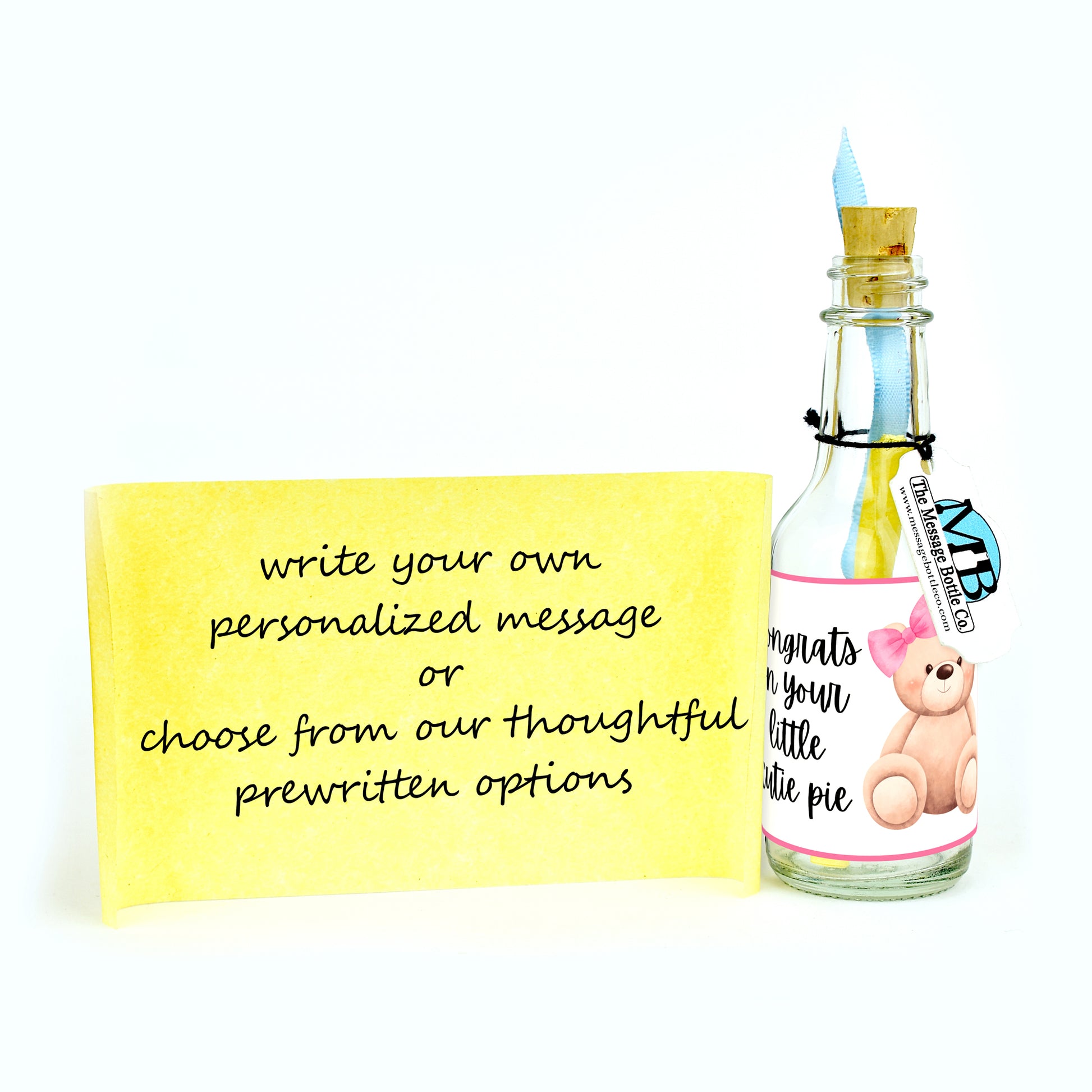 Celebrate a new arrival with our adorable "Little Cutie Pie" Congratulations Message Bottle. Featuring a cute teddy bear with a blue bow on one version and a pink bow on the other, this label warmly reads, "Congrats on your little cutie pie," making it a perfect fit for welcoming a baby boy or girl.