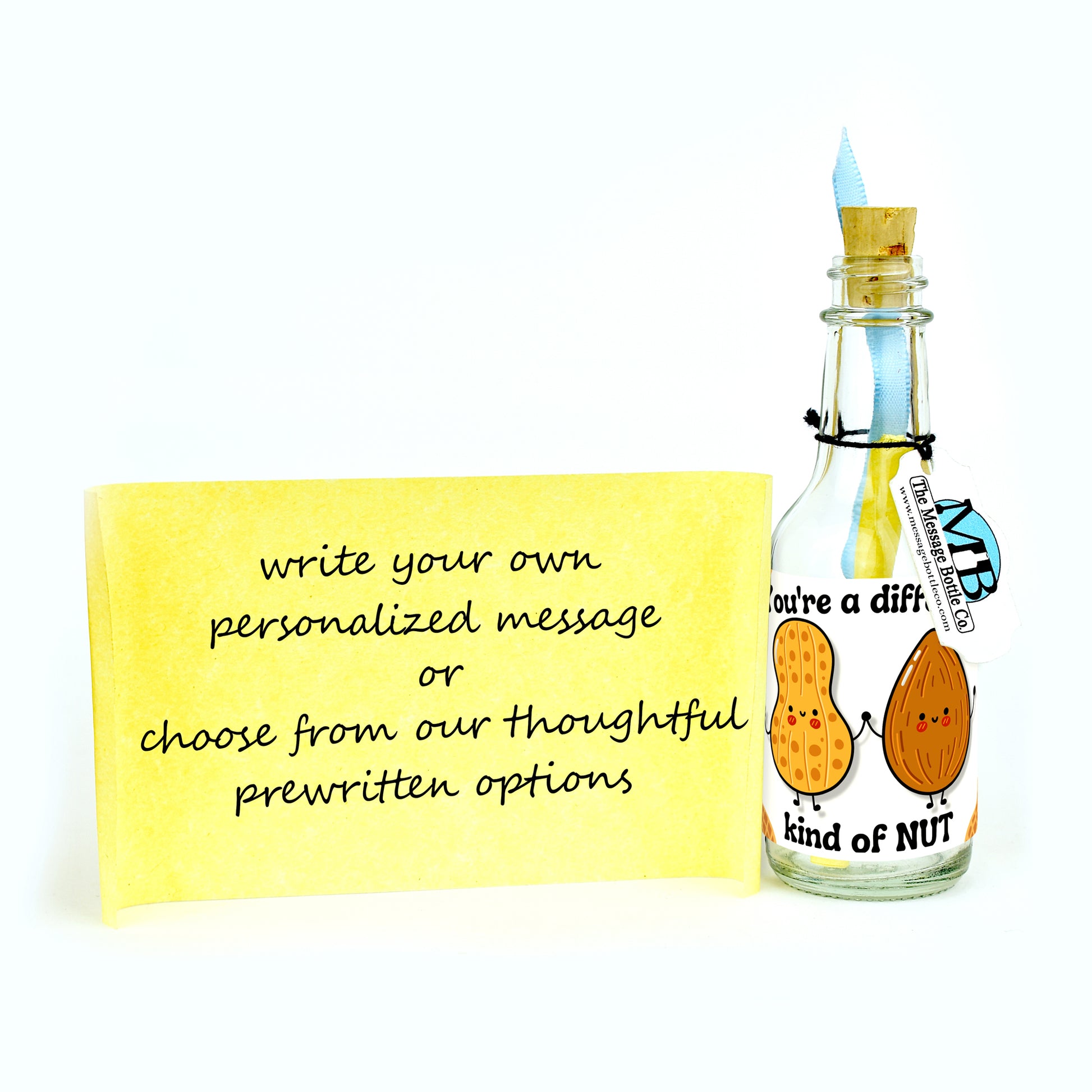 Celebrate someone’s wonderfully unique personality with our "Different Kind of Nut" Message Bottle! Featuring a cheerful almond and peanut, this quirky design adds a fun twist to a heartfelt “thinking of you” message, perfect for the special someone who always stands out.
