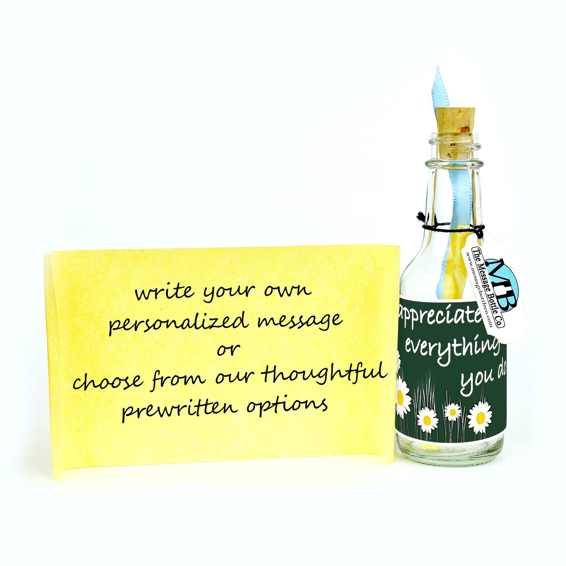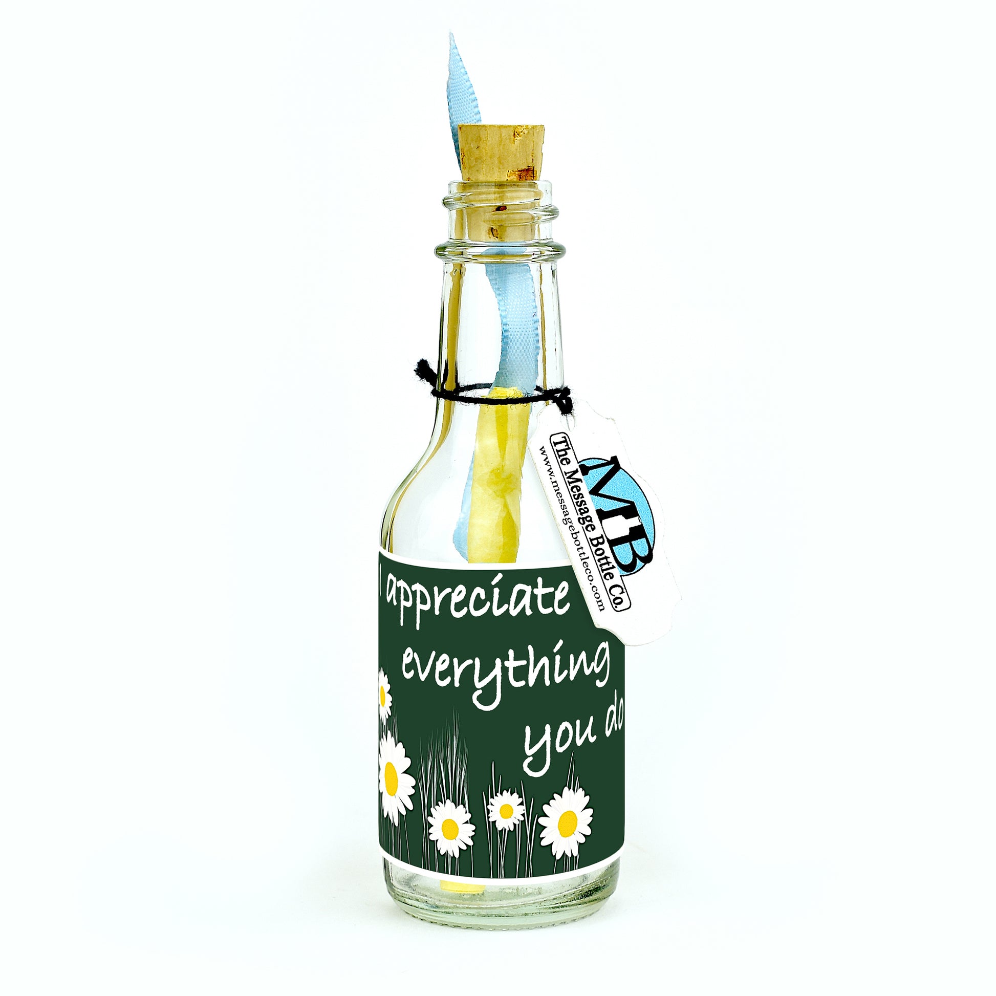 Express gratitude and admiration on Caregiver's Appreciation Day with this heartfelt Message Bottle. Featuring white flowers, the label reads "I Appreciate Everything You Do," capturing the sentiment of appreciation for the selfless care and support provided.