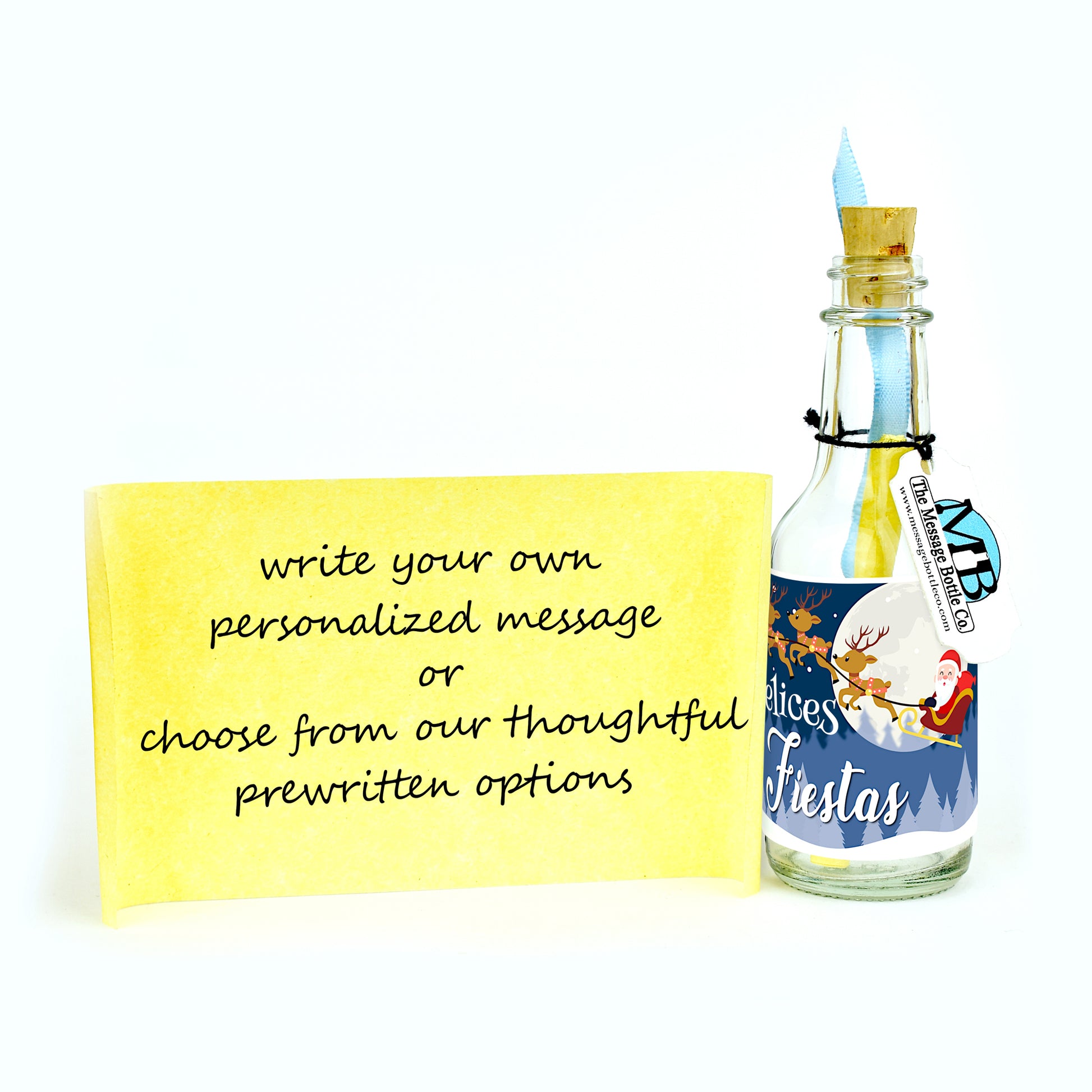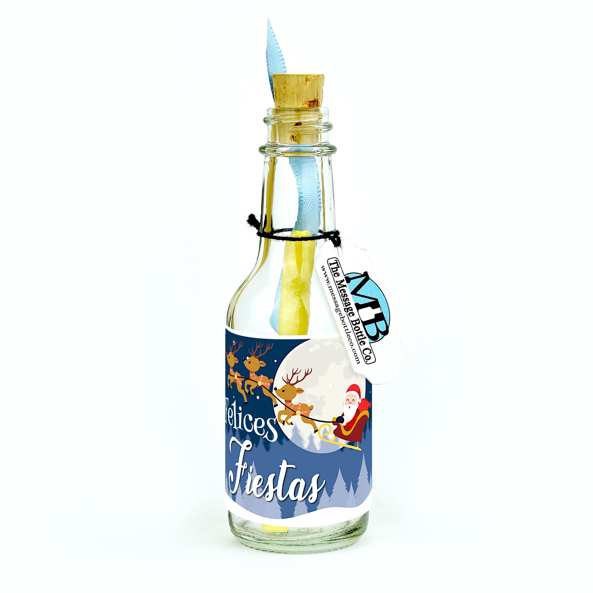 Capture the enchantment of Christmas with our festive Message Bottle adorned by a merry Santa Claus and his reindeer soaring across the moonlit sky. This delightful label reads "Felices Fiestas," extending heartfelt holiday wishes to your Spanish-speaking loved ones.