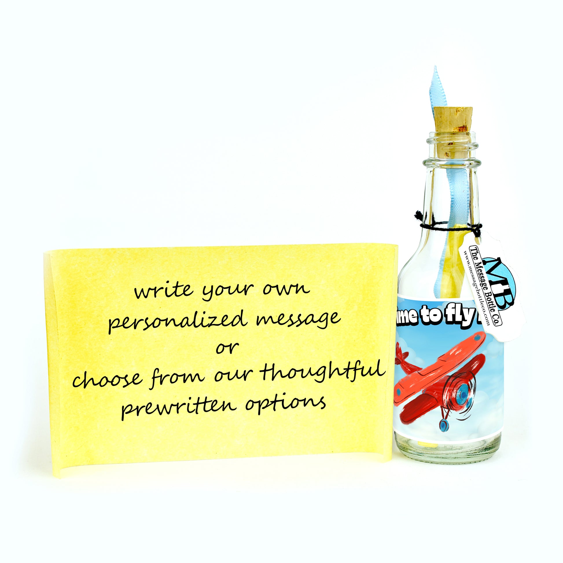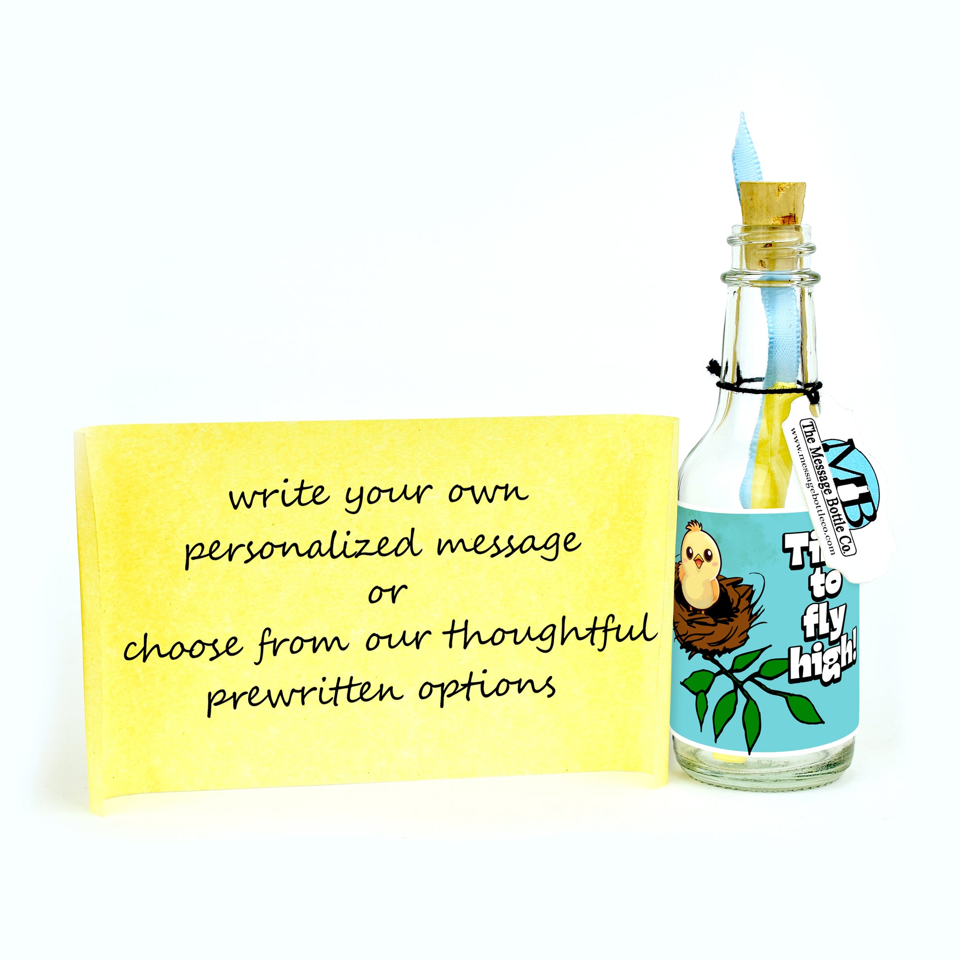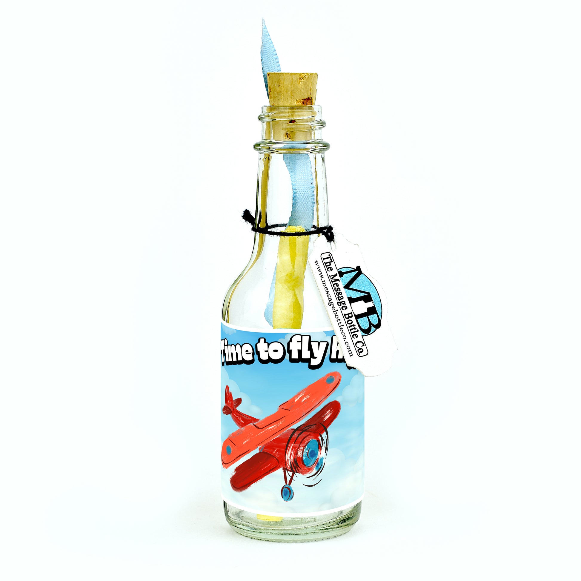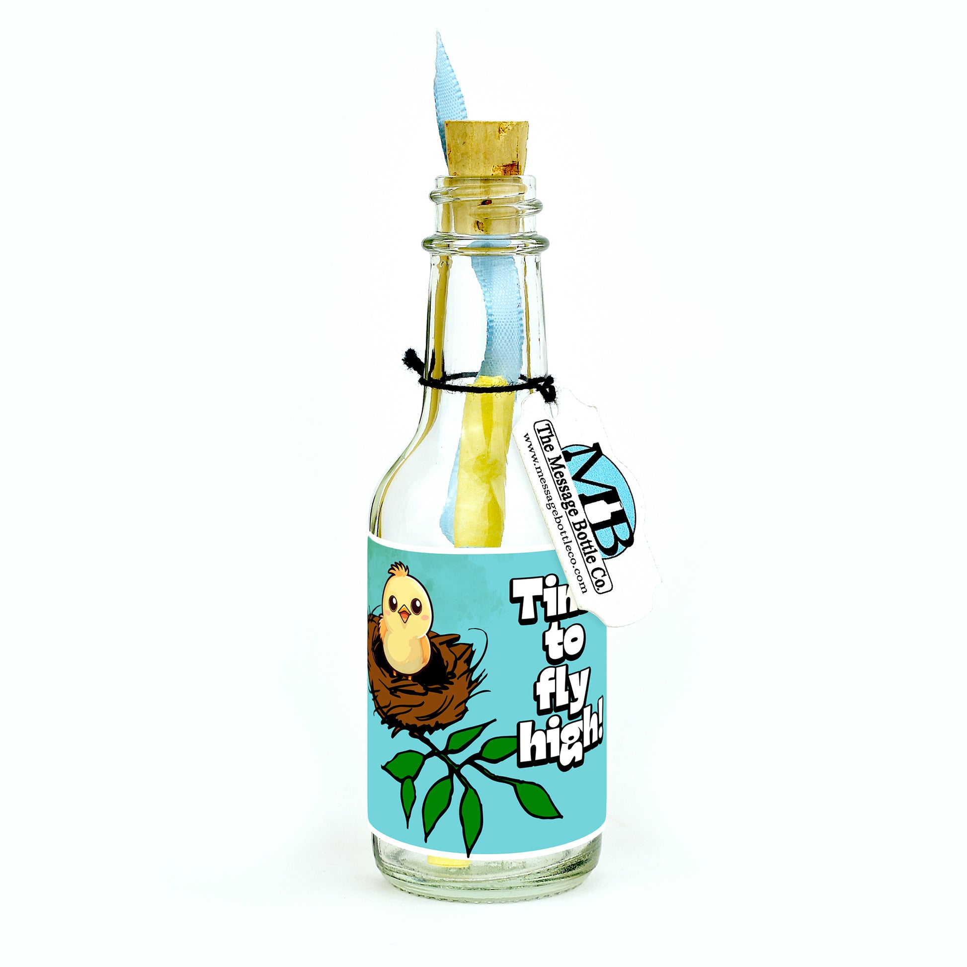 Celebrate their soaring achievement with our "Time to Fly High" Message Bottle. Available in two delightful versions, both reading "Time to fly high!"—one features a charming little bird in its nest, ready to take flight, while the other showcases a propeller airplane soaring through the sky.