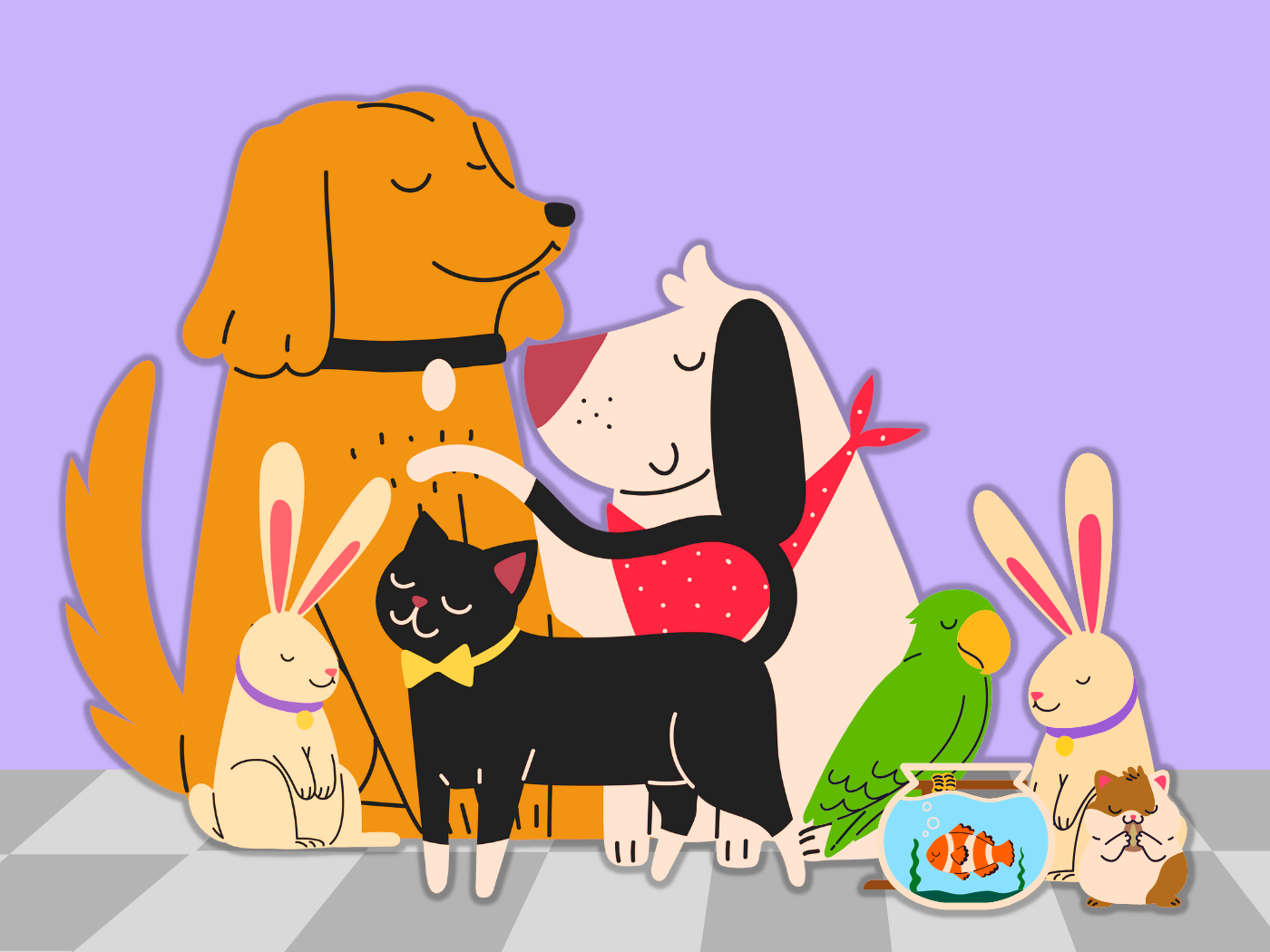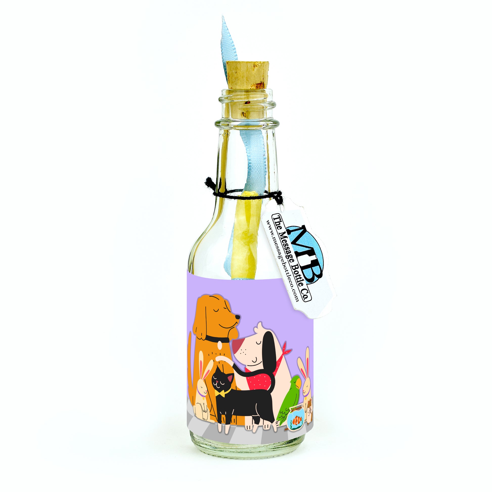 A heartwarming gathering of furry, feathered, and finned friends, the "Fur, Feathers & Fins" Message Bottle bursts with cheer. Against a soft purple backdrop, a cat, two dogs, two rabbits, a bird, a gerbil, and a fish all beam with joy - ready to deliver a message as delightful as they are.