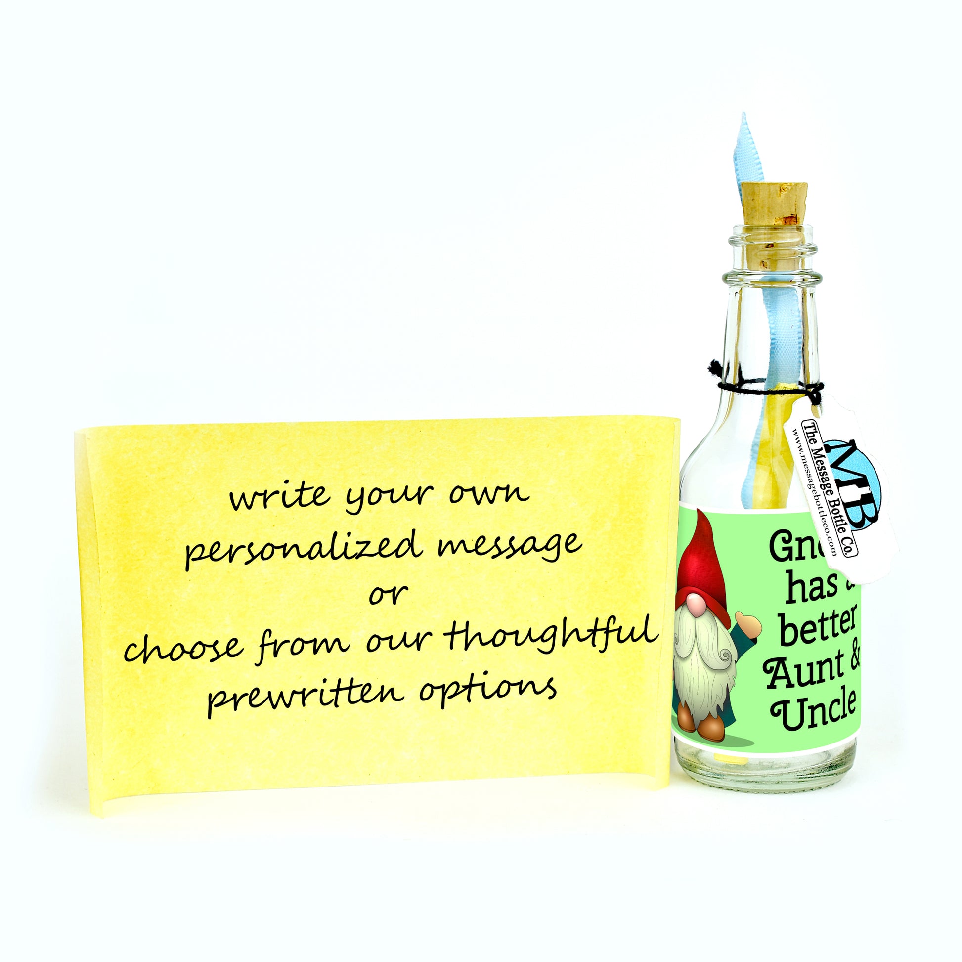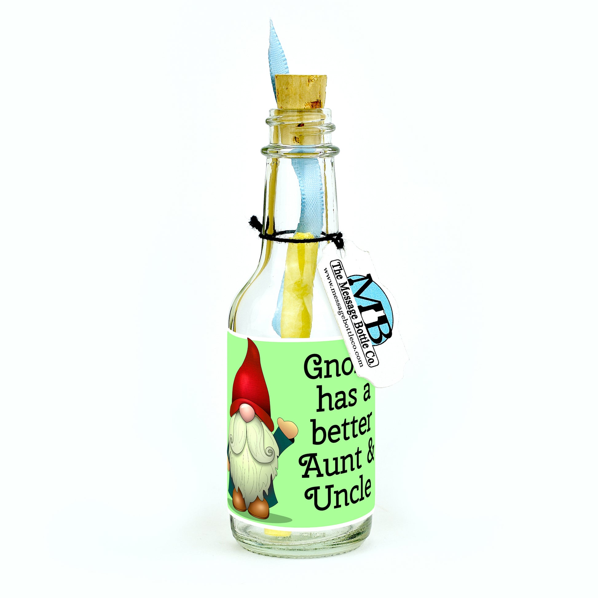 Add a touch of whimsy to Aunt's & Uncle's Day with this charming Message Bottle featuring a cute cartoon gnome. The label playfully reads "Gnome has a better Aunt & Uncle," highlighting the special bond you share and the lighthearted spirit of the occasion.