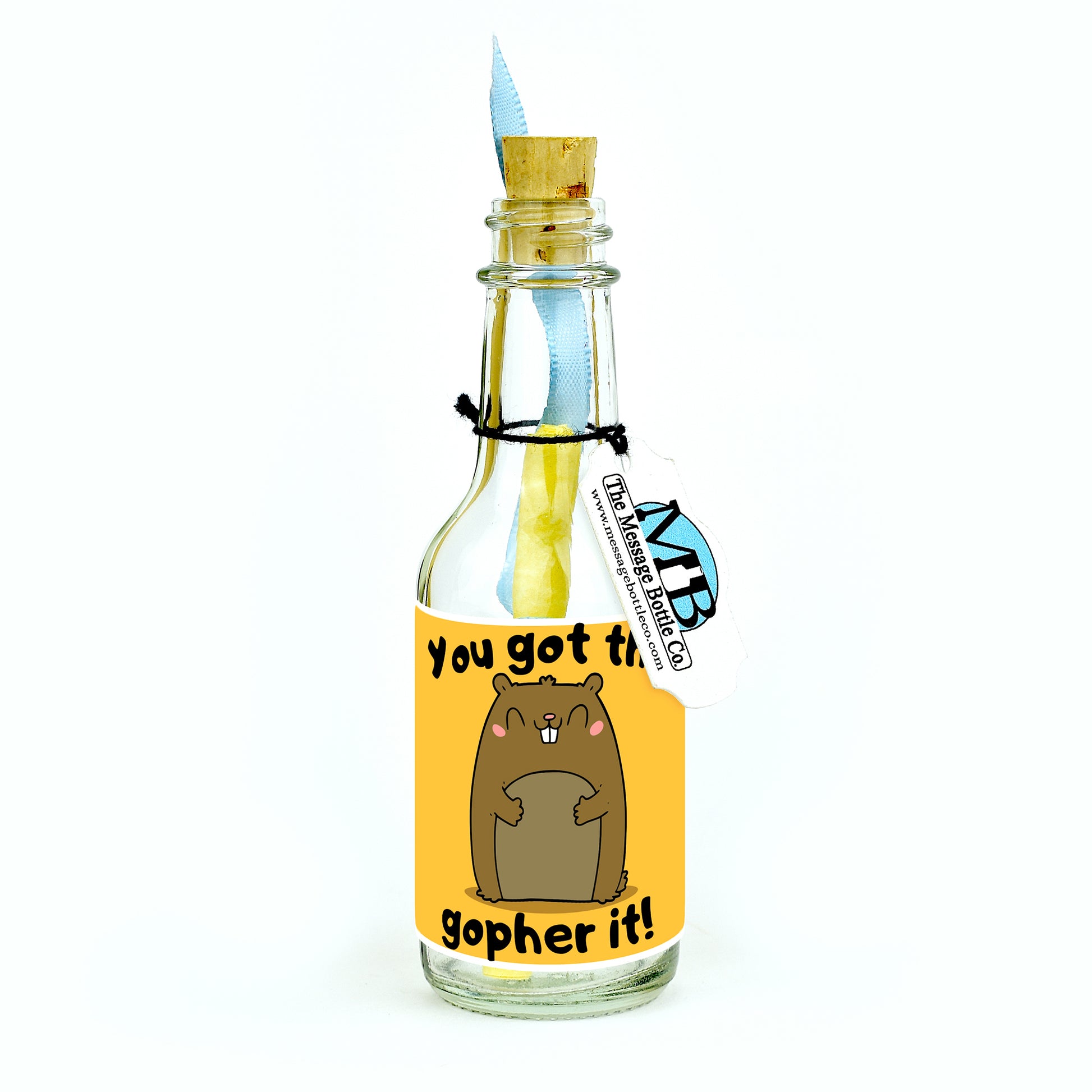 Get ready to dig deep and unearth success with our "Gopher It" Message Bottle! Featuring a charming cartoon gopher with rosy cheeks and a big smile, this delightful design encourages and supports with a playful pun: "You got this, gopher it."