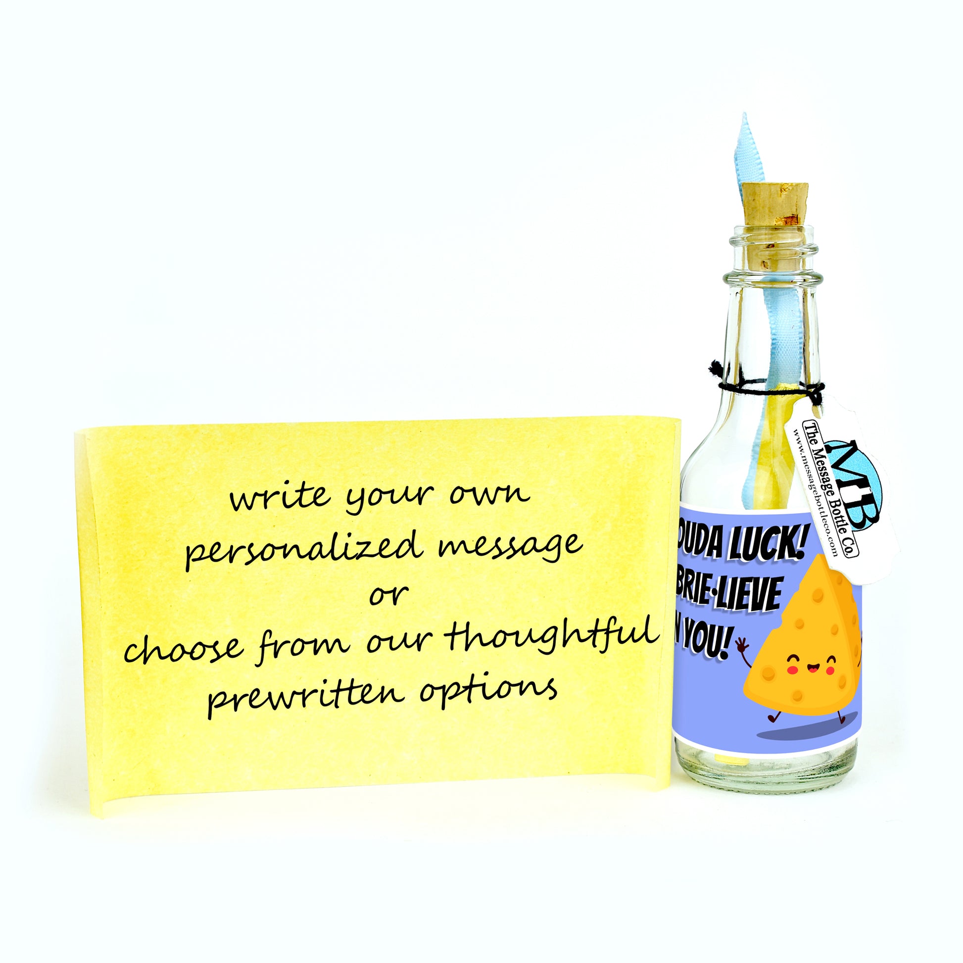 Add a slice of fun and encouragement to their day with our "Gouda Luck" Message Bottle! Featuring a gleeful wedge of cheese with an exuberant smile, this charming design delivers a double dose of cheesy humor and heartfelt support with the playful pun: "Gouda luck I Brie-lieve in you!"