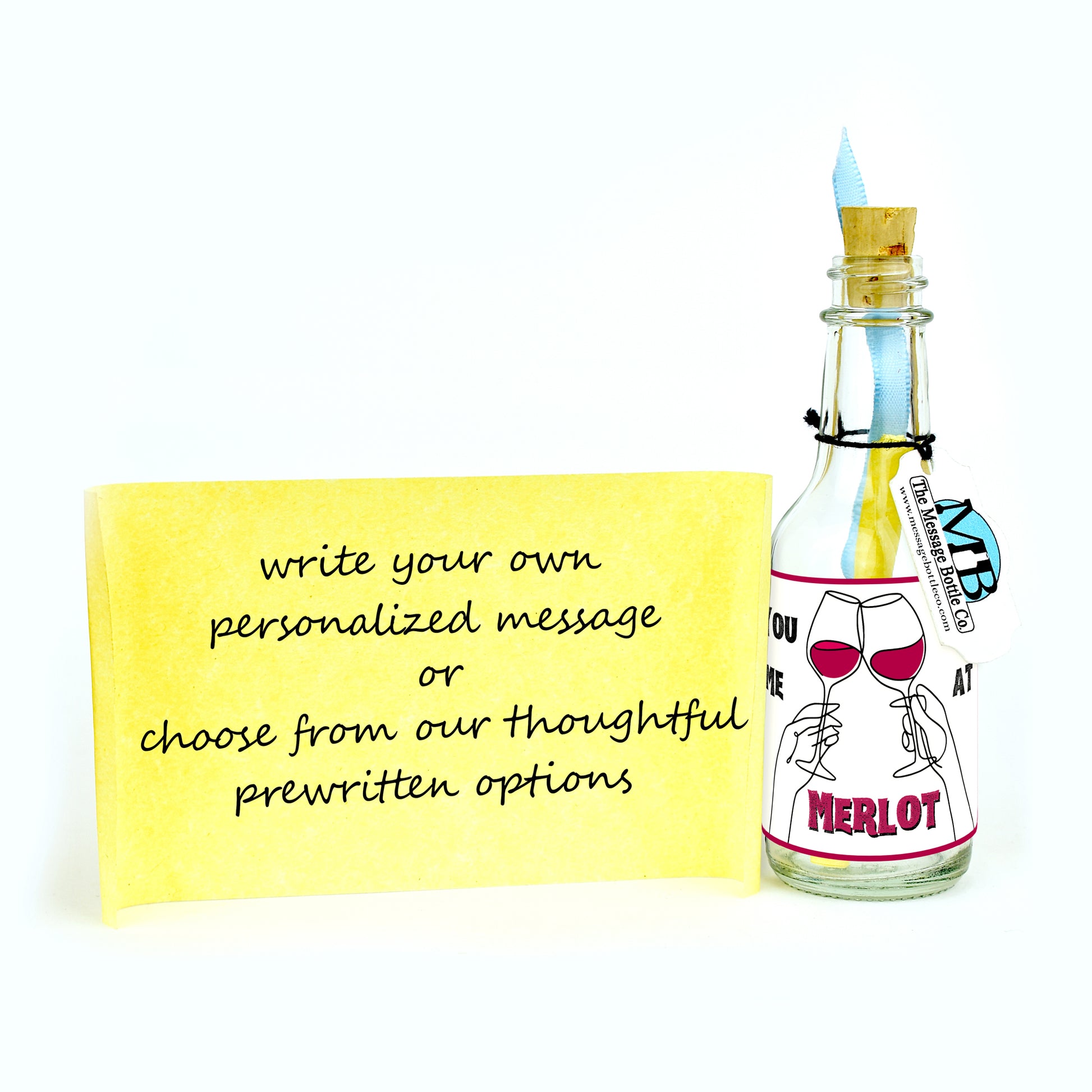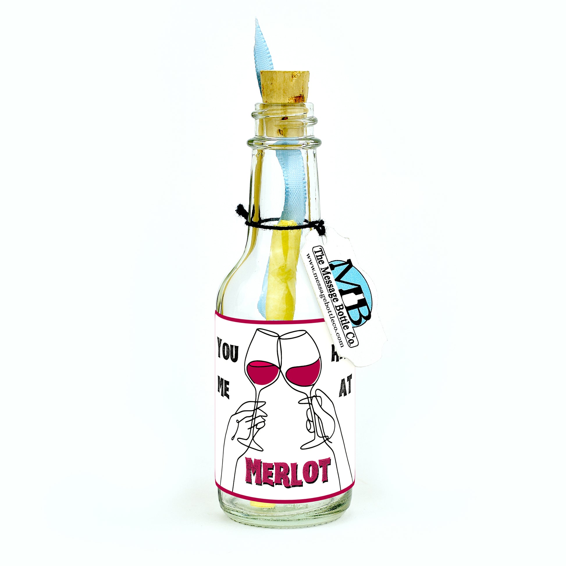 Raise a glass to friendship with our "Had Me at Merlot" Message Bottle! This design features a delicate line drawing of two arms toasting with glasses of rich red wine. The playful text captures the excitement and anticipation that a mention of wine brings to true friends who love sharing a good drink together.