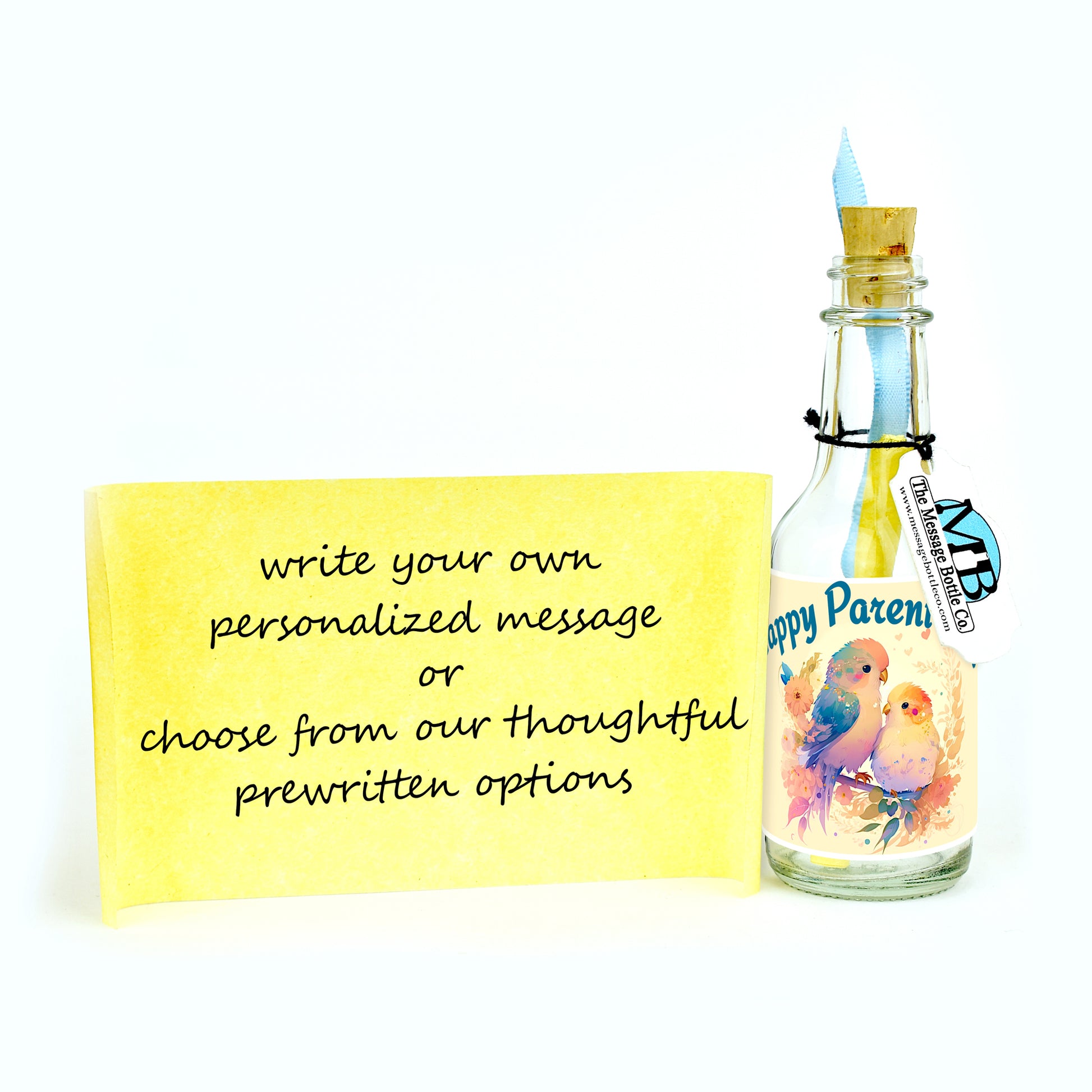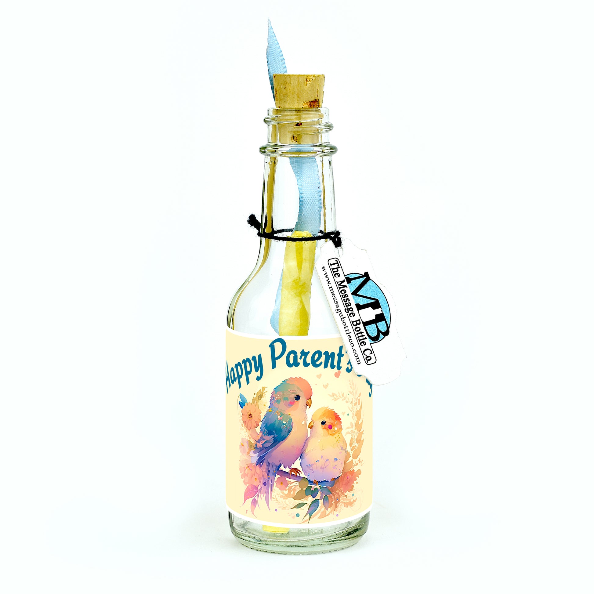 On Parent's Day, celebrate with our heartwarming Message Bottle. Featuring a colorful illustration of two birds cuddling on a branch, it simply states, "Happy Parent's Day." A heartfelt tribute to the love and togetherness you inspire.