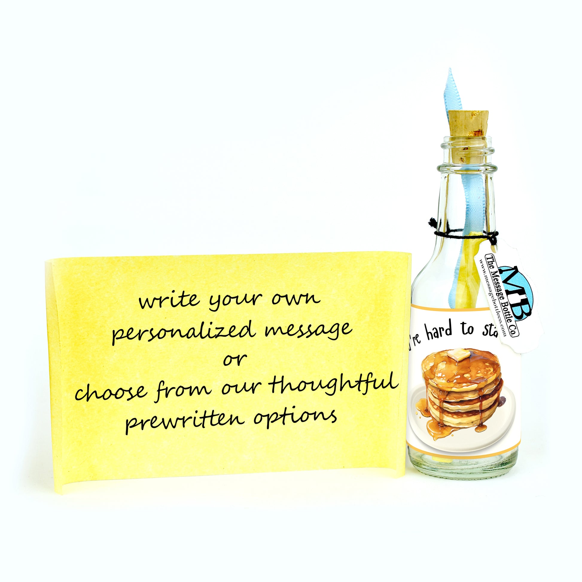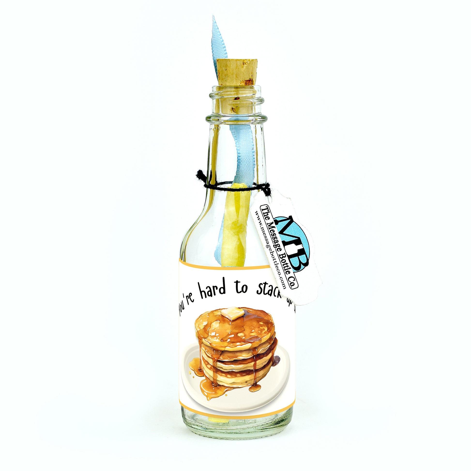 Serve up a sweet surprise with our "Hard to Stack Up To" Message Bottle! Featuring a mouthwatering illustration of a stack of fluffy pancakes drenched in syrup and topped with a pat of butter, this design is a deliciously playful way to show someone they’re truly exceptional.