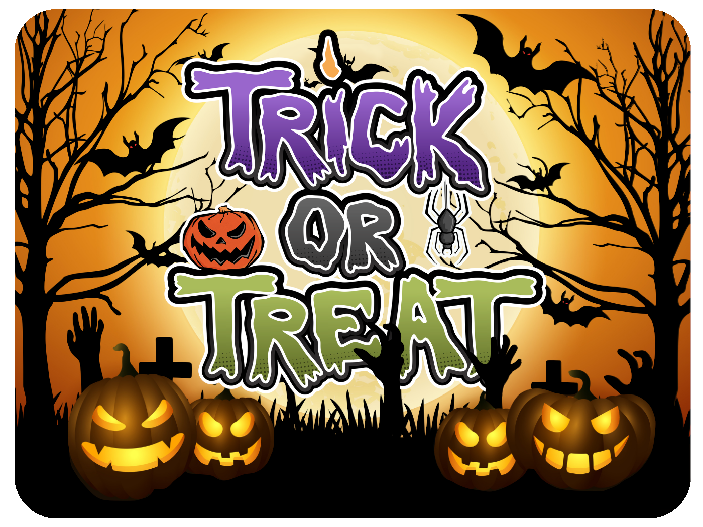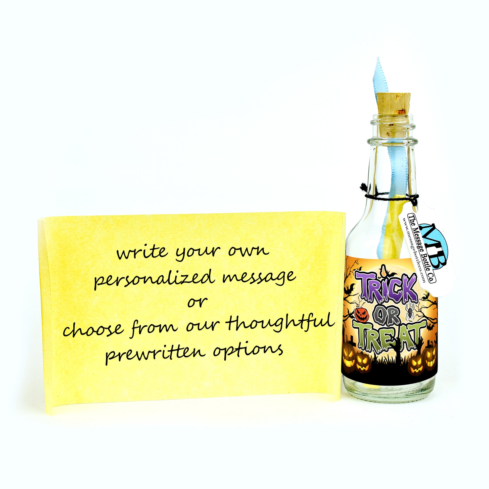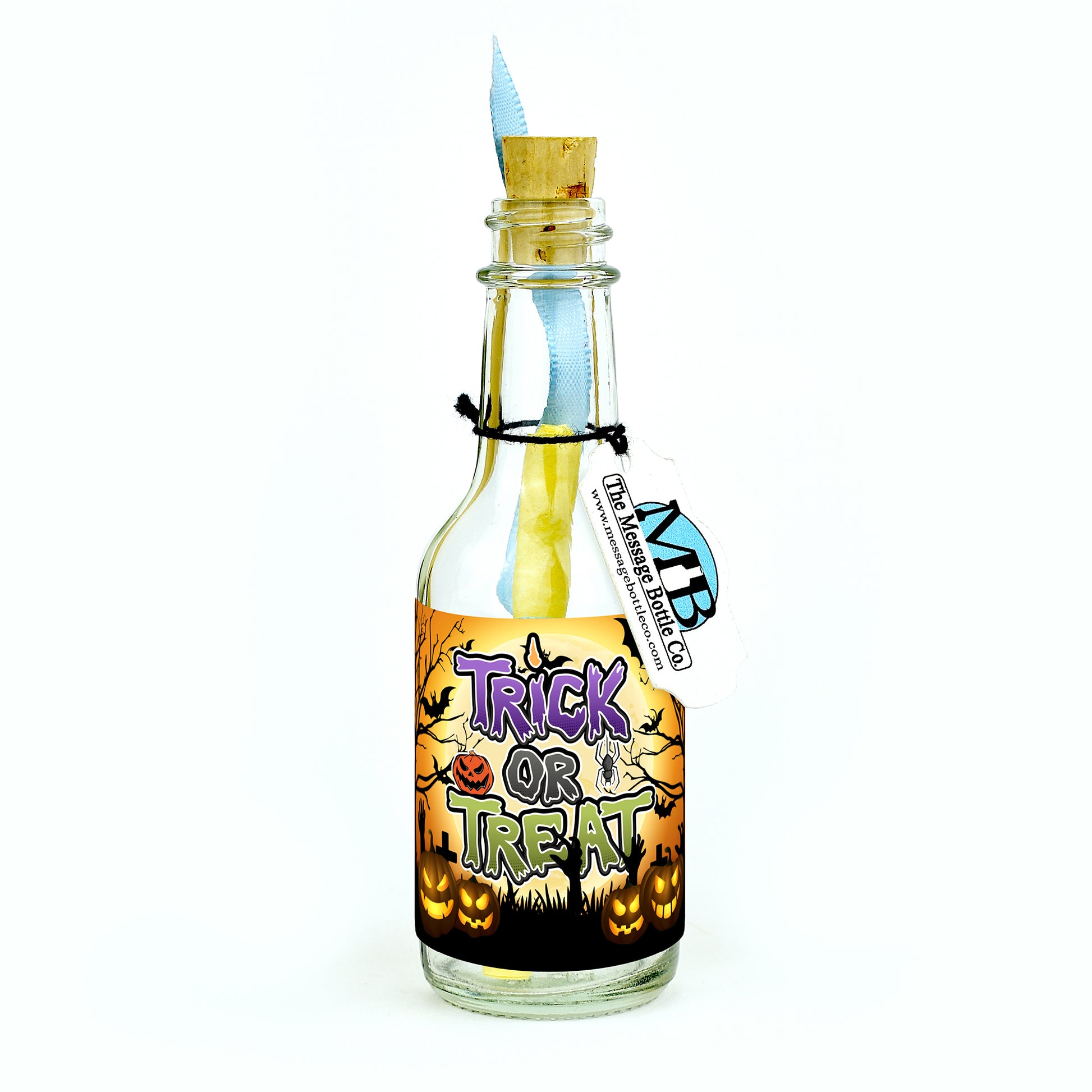 Set the scene for a spooky Halloween with our "Haunted Sunset" Message Bottle. This hauntingly fun design features a silhouette of headstones, zombie hands rising from the ground, eerie dead trees, and bats flying against an orange sunset backdrop. Dimly lit jack-o-lanterns glow in the foreground, adding an extra touch of Halloween fright. The bold "Trick or Treat" text completes the spooky vibe, perfect for sharing some seasonal chills and thrills.