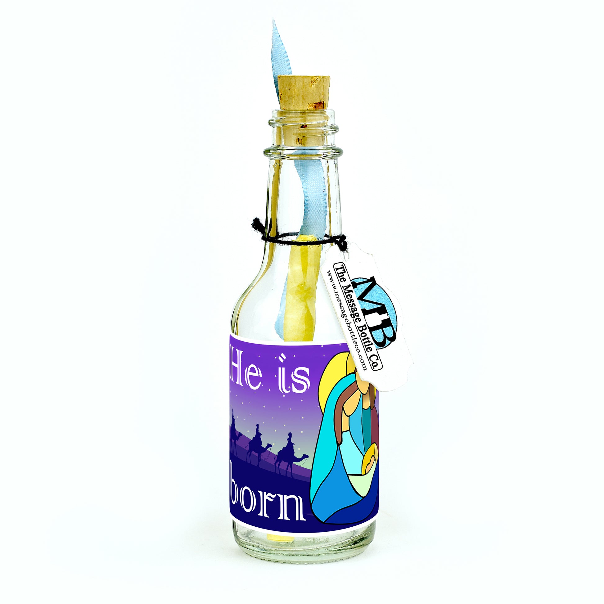 Experience the magic of the season with our exquisite Message Bottle, featuring a stunning portrayal of the Nativity scene. Against a backdrop that resembles the beauty of stained glass, Mary and Joseph cradle the newborn Jesus, while the silhouette of the Three Wise Men on camels traverses the desert. The label poignantly declares, "He is Born," celebrating the profound significance of the moment.
