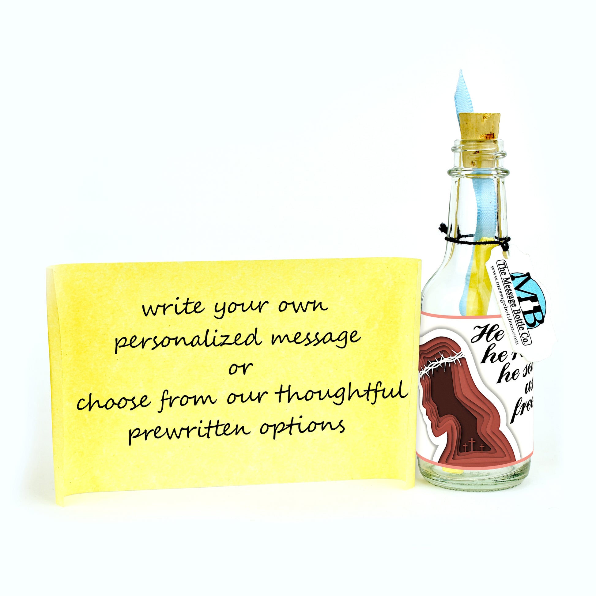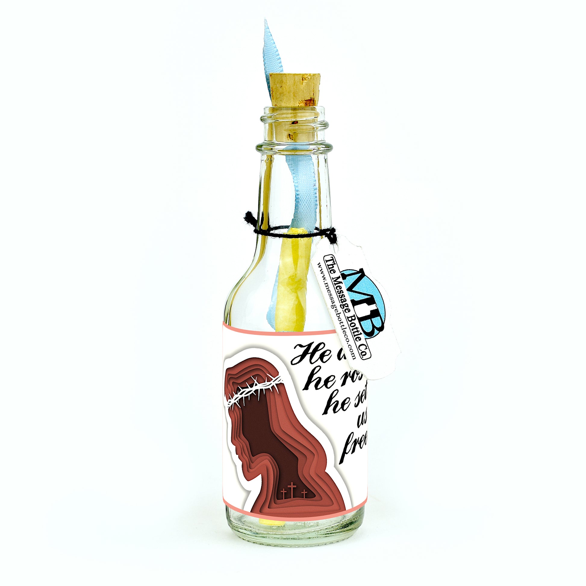 Commemorate the profound significance of Easter with our heartfelt Message Bottle featuring the poignant profile of Jesus, wearing the crown of thorns. The powerful message "He died, he rose, he set us free" encapsulates the transformative journey of Easter, from sacrifice to resurrection and the liberation it brings.