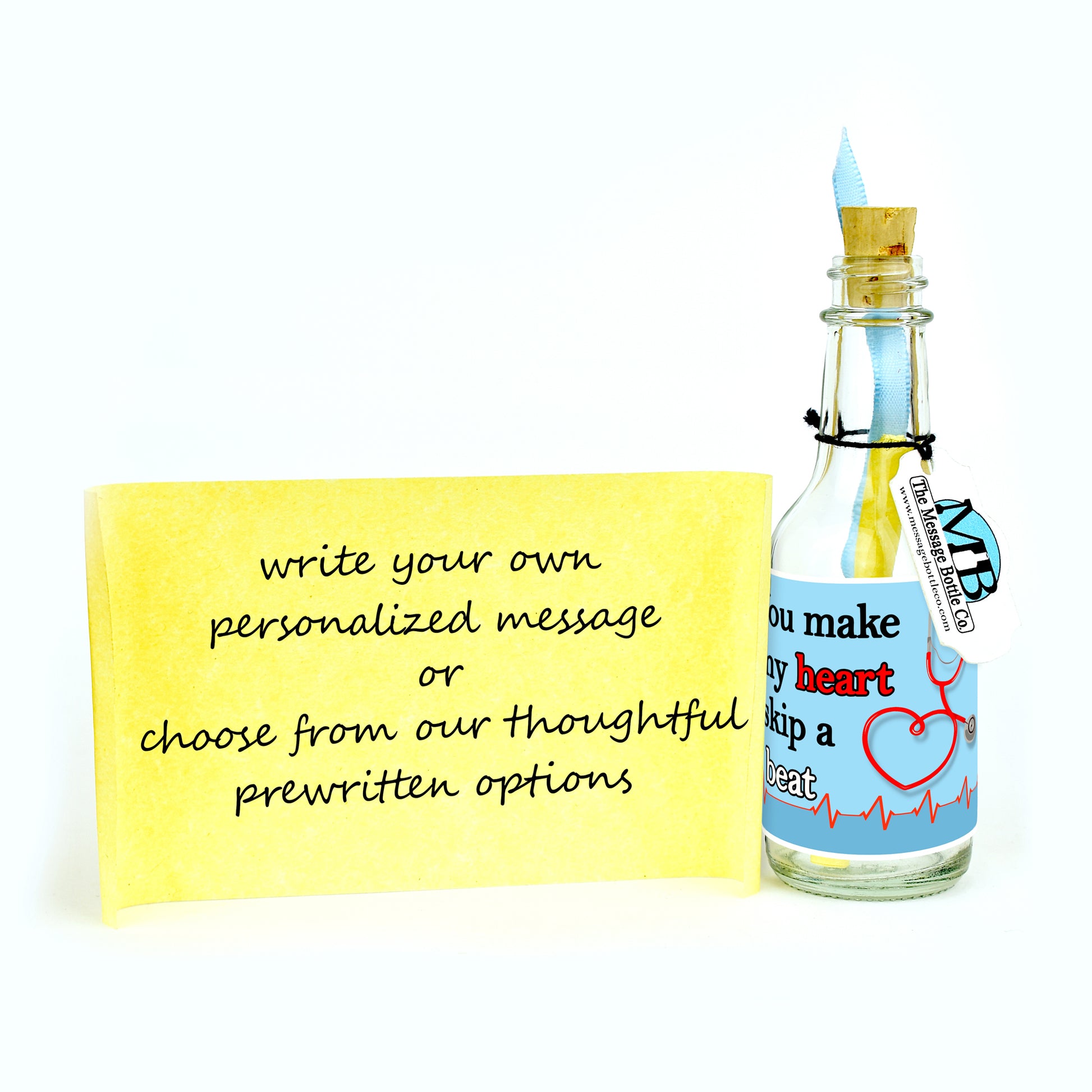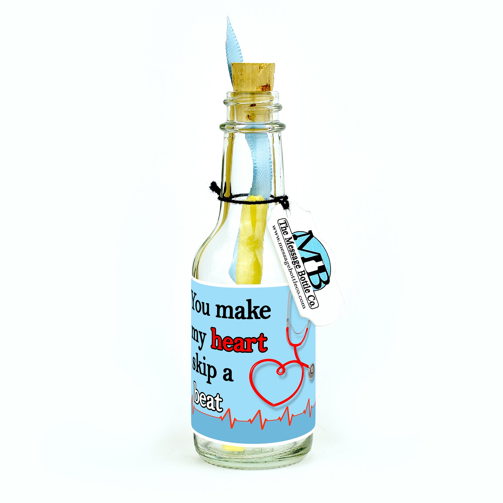 For our "Heart Skips a Beat" Bottle a stethoscope’s tubing elegantly forms the shape of a heart, setting the stage for this heartfelt Message Bottle. With a gentle yet impactful message, "You make my heart skip a beat," this design brings together the warmth of affection with the medical symbol that represents care and compassion. Whether you’re celebrating a special bond with a nurse or someone in the medical field, this bottle is a charming tribute.