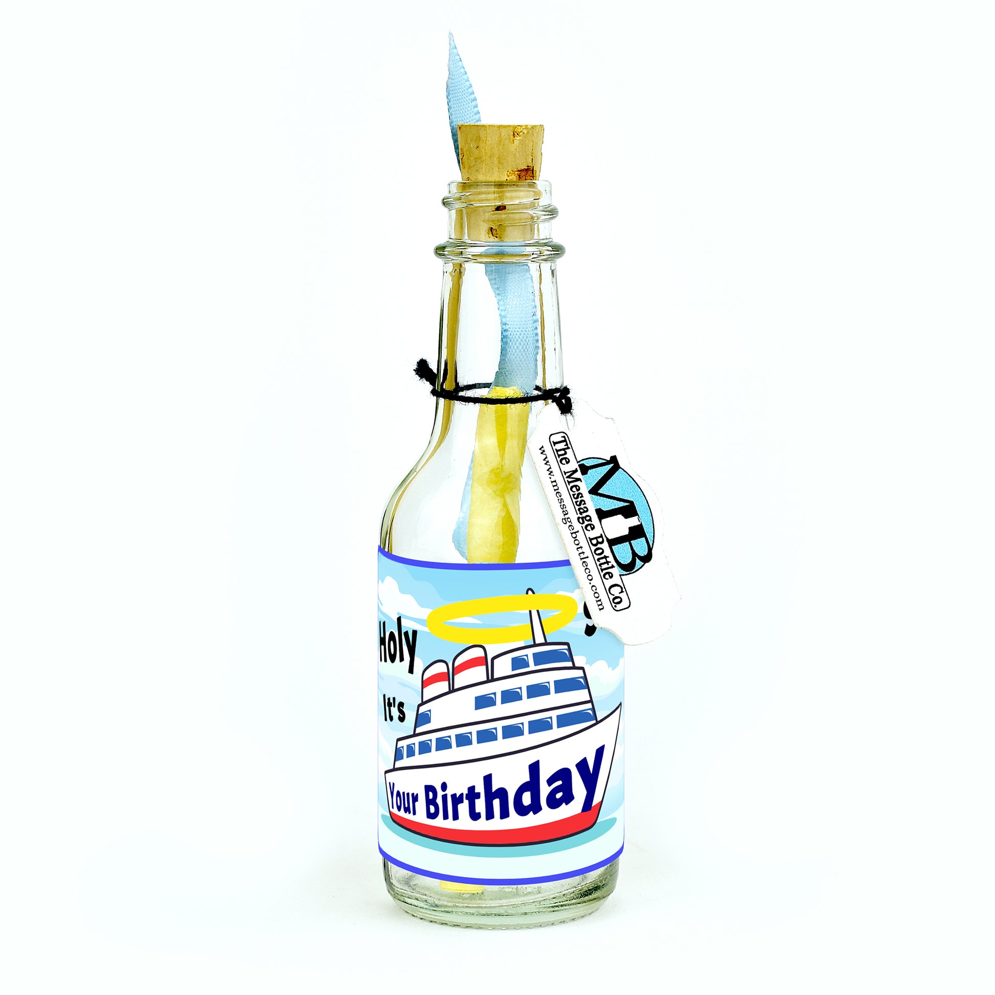 Celebrate their special day with a splash of nautical fun using our "Holy Ship Birthday" Message Bottle. Featuring a large ship adorned with a halo and "Your Birthday" written on its side, this label offers a playful and memorable twist on birthday wishes.