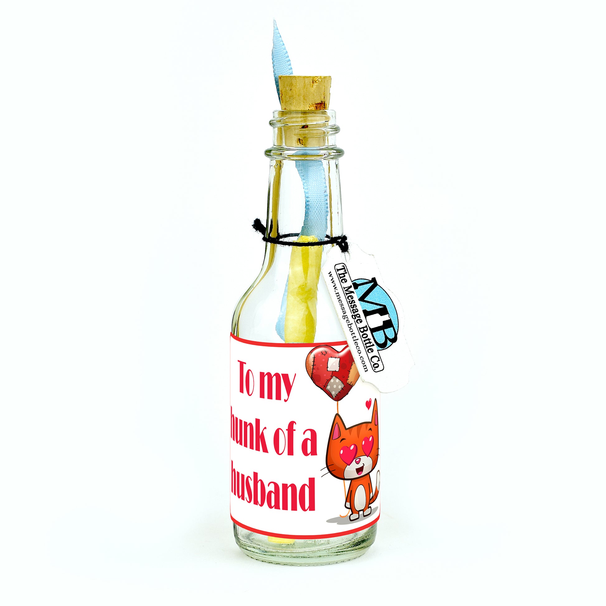 Celebrate the love and attraction you feel for your husband on Husband Appreciation Day with this playful and affectionate Message Bottle. Featuring a cartoon cat holding a heart-shaped balloon with love-filled eyes, the label reads "To my hunk of a husband," capturing the lighthearted yet genuine adoration you have for him.