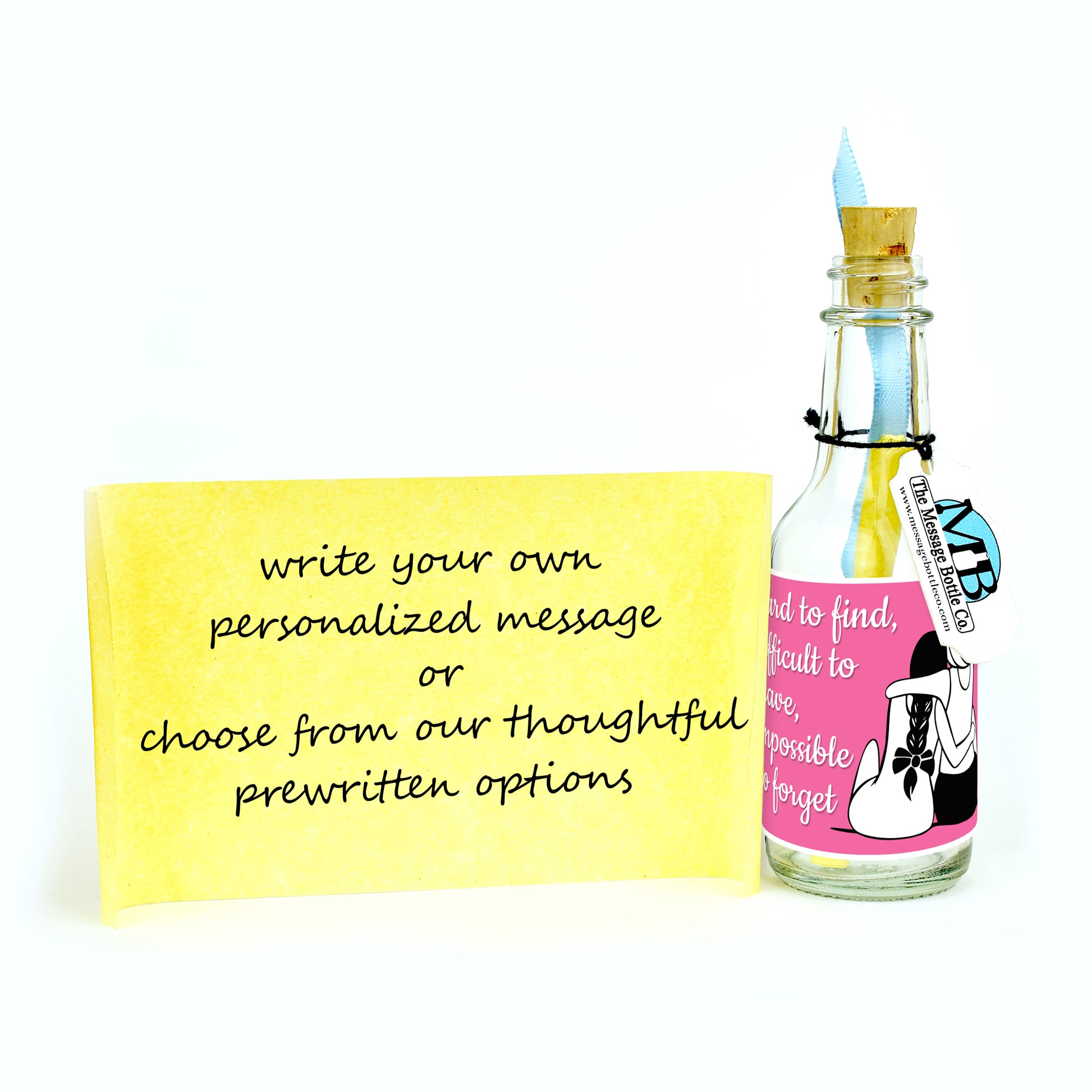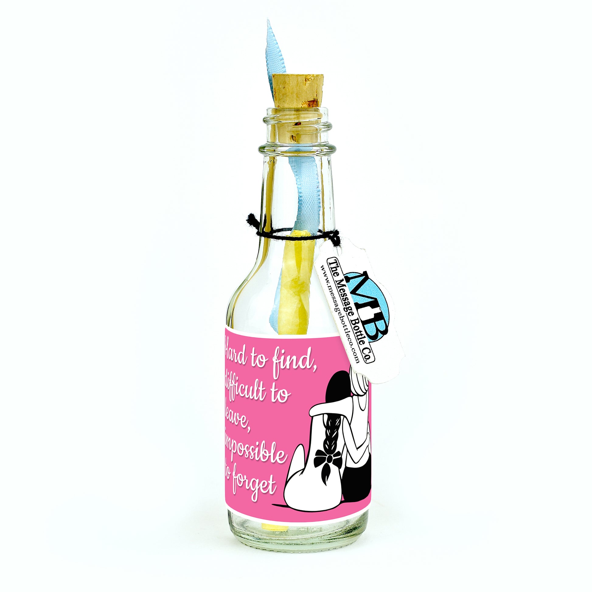 Celebrate your unforgettable connection with our "Impossible To Forget" Message Bottle. Featuring two women sitting closely, one with an arm wrapped around the other, it reads, "Hard to Find, Difficult to Leave, Impossible to Forget." A beautiful tribute to the kind of bond that only grows stronger with time.