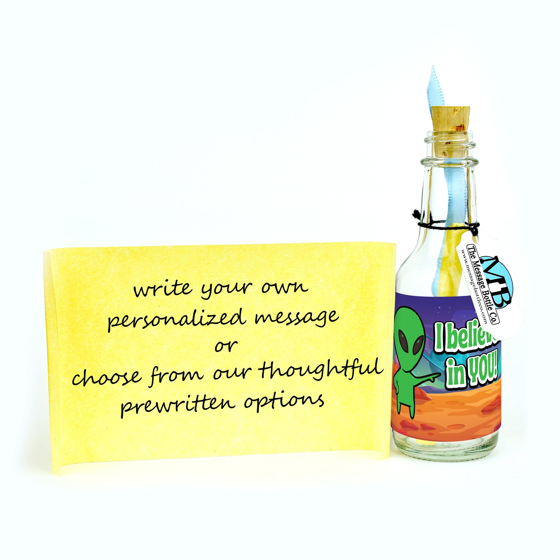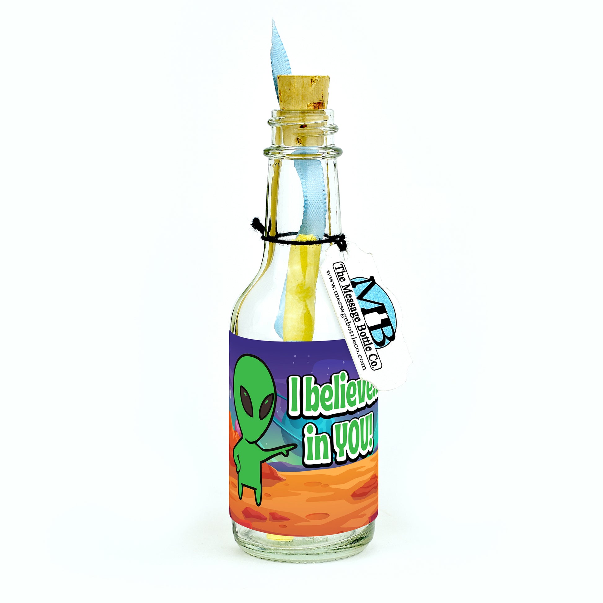 Send a stellar boost of encouragement with our "Interstellar Confidence" Message Bottle! Featuring a charming cartoon alien on a distant planet, this out-of-this-world design playfully points to the message, reminding them that belief in their dreams transcends the stars.