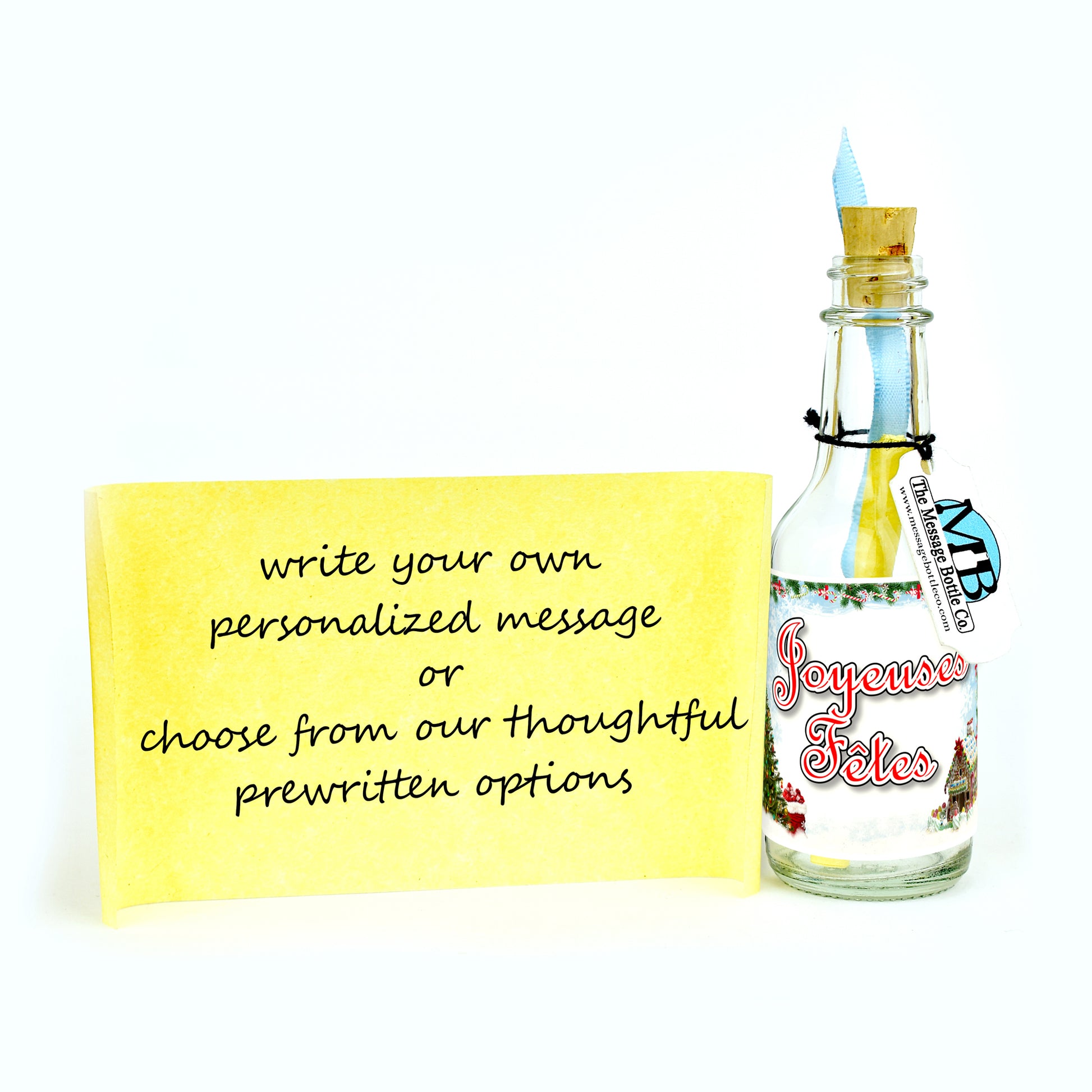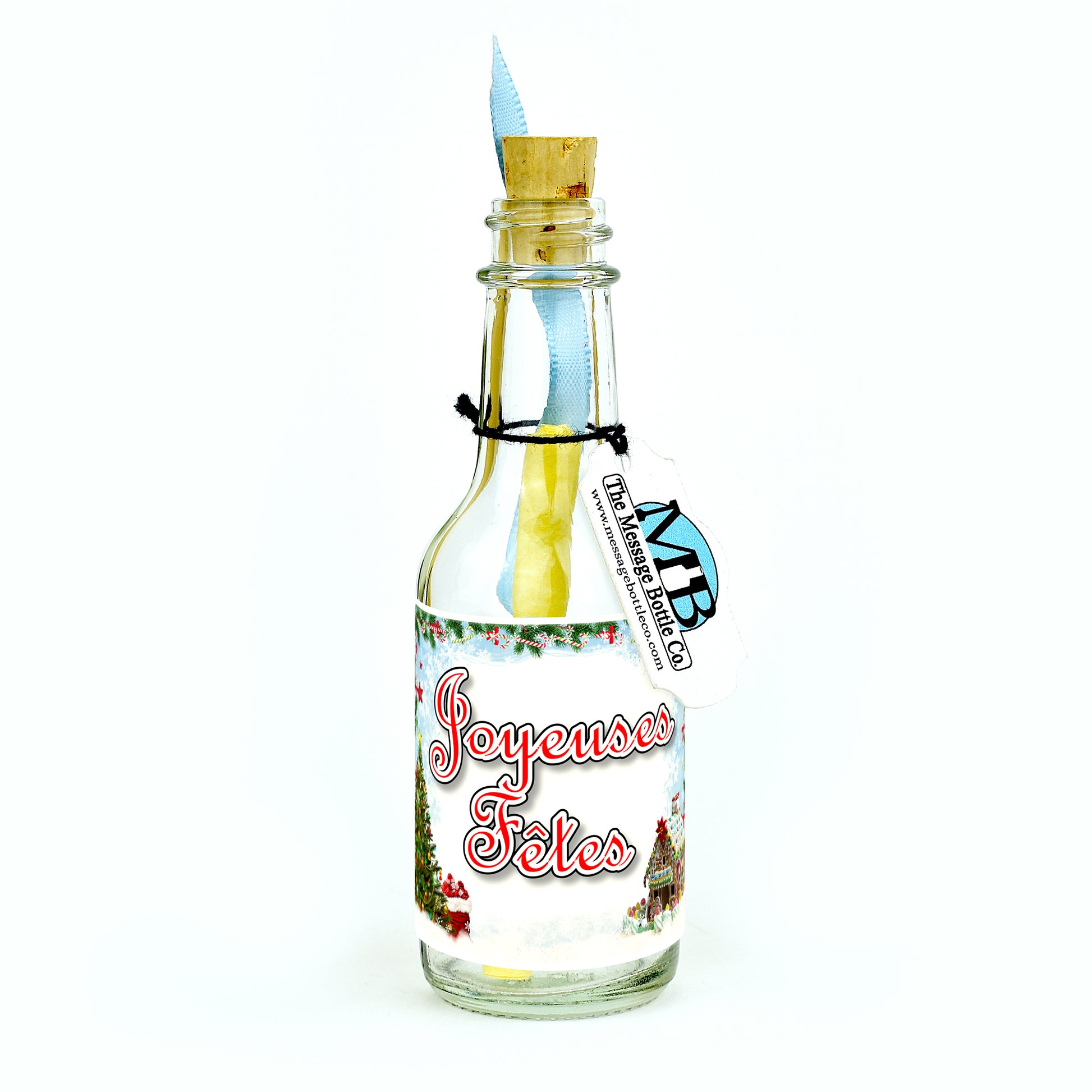 Capture the enchantment of the holiday season with our delightful Message Bottle, adorned with a picturesque snowy scene. Against the serene backdrop of a snow-covered landscape, a beautifully decorated Christmas tree and a charming gingerbread house stand as symbols of festive joy and togetherness. The label conveys the heartfelt message, "Joyeuses Fêtes," celebrating the spirit of celebration and merriment.