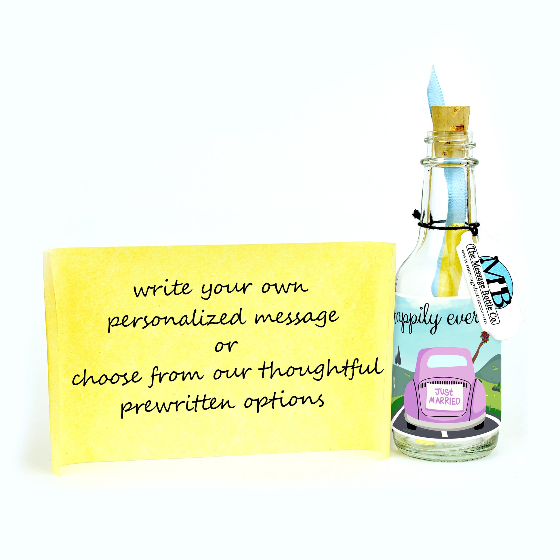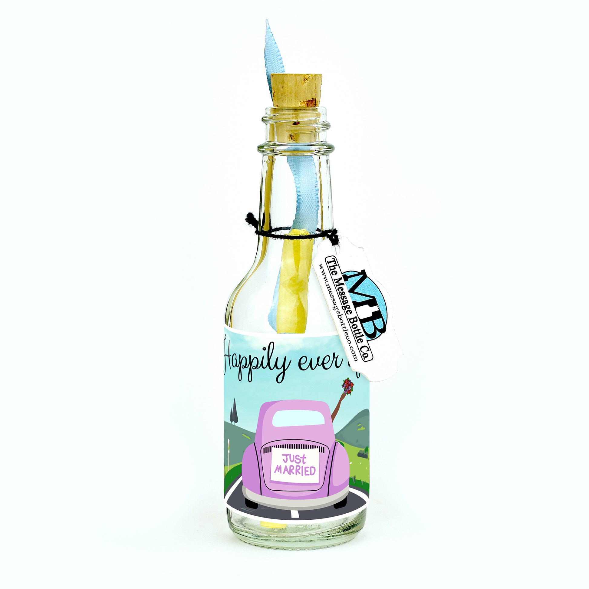 Celebrate the start of a new adventure with our "Just Married" Message Bottle. This design captures the joy of the newlyweds as they drive away in a charming car, heading down a scenic road toward a picturesque hilly landscape. A "Just Married" sign adorns the back of the car, while the bride, with her arm out the passenger window holding a bouquet, adds a touch of festive cheer. The bride's skin tone is available in white, brown, or black, allowing you to personalize your message with sensitivity and inclusivity.
