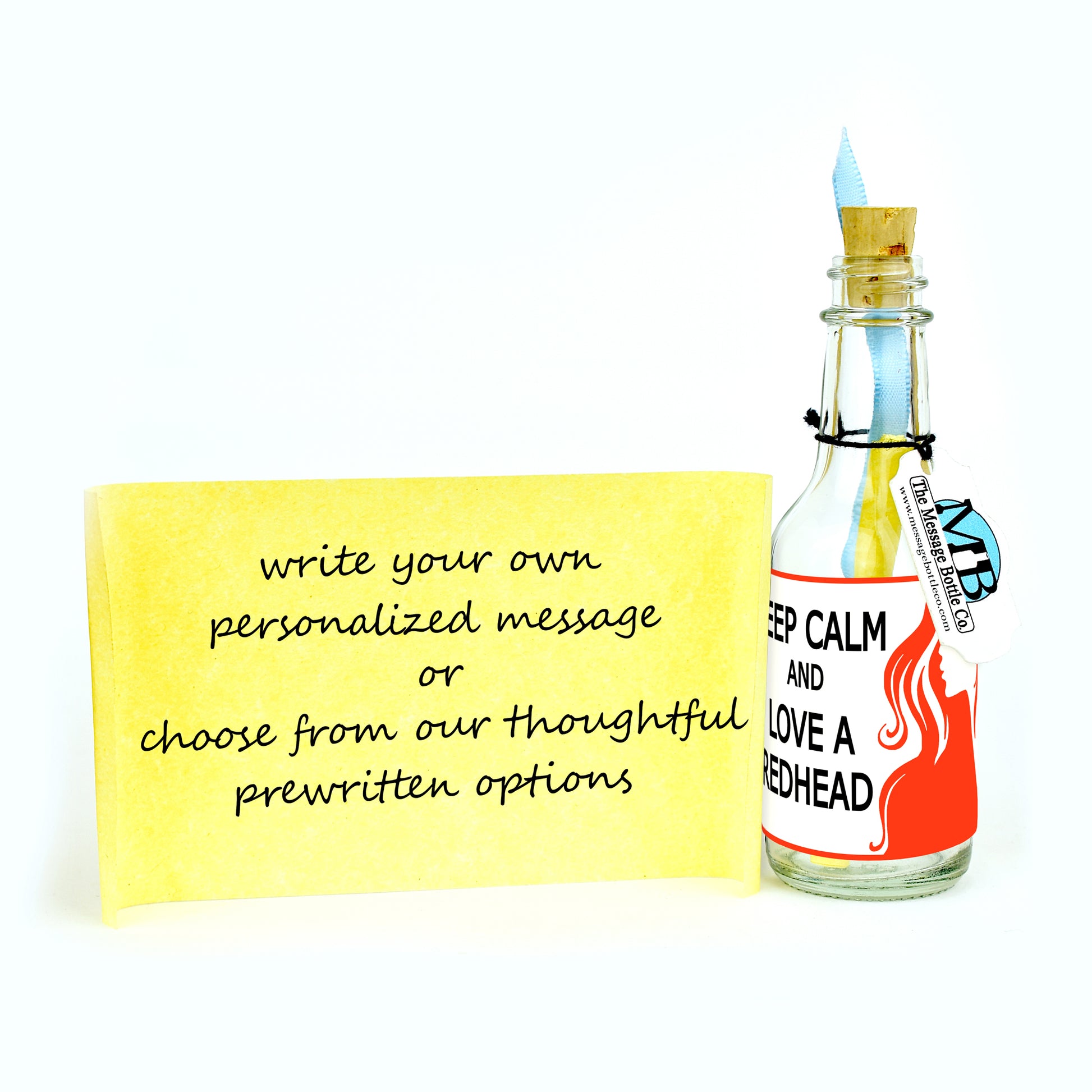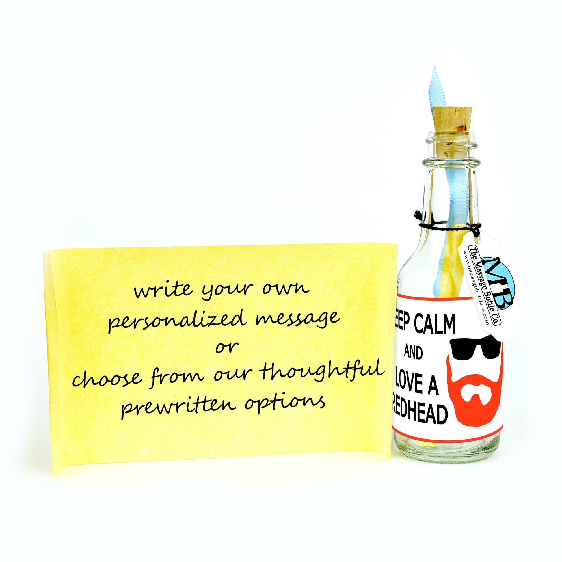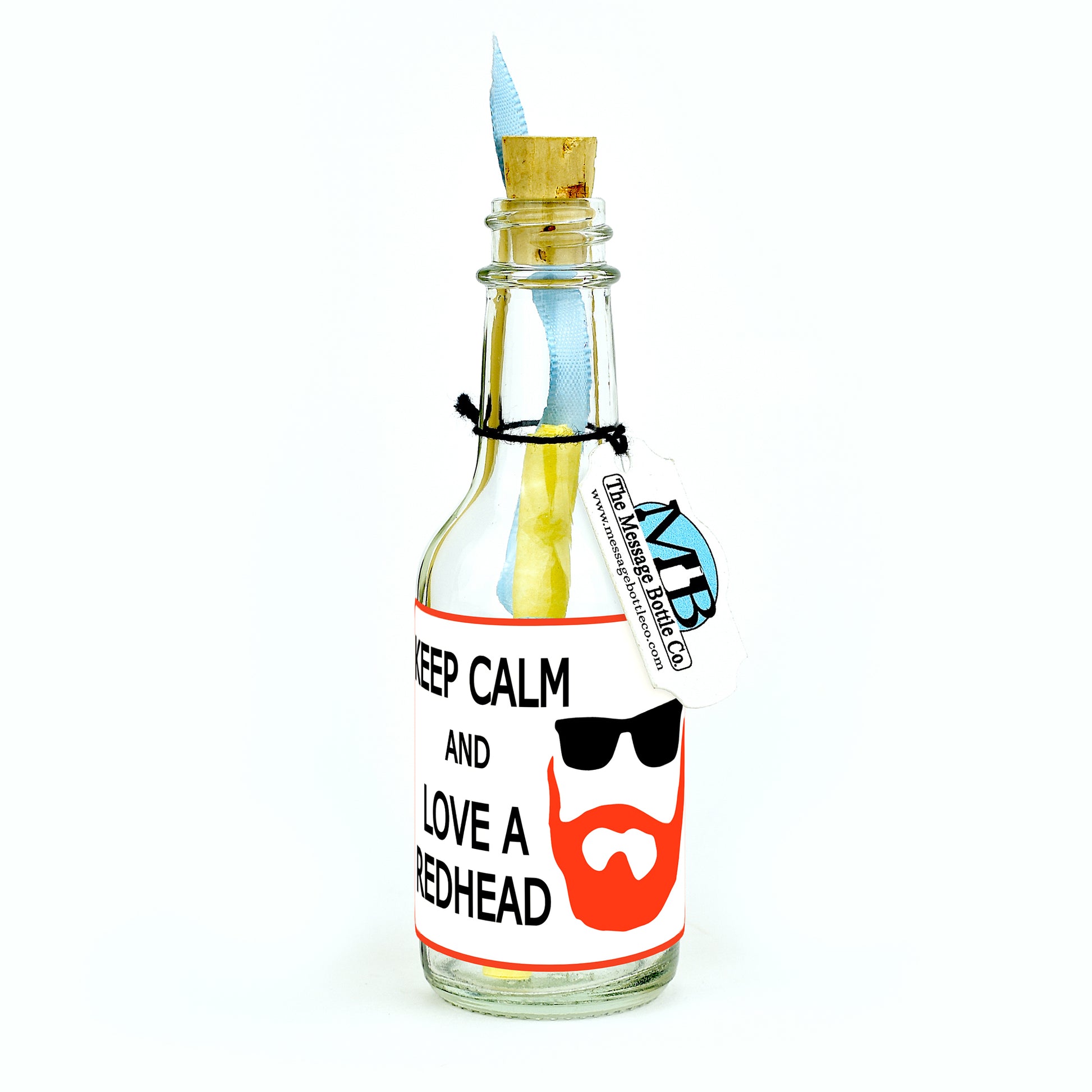 Embrace the spirit of Kiss a Ginger Day with this playful and catchy Message Bottle. Featuring the words "Keep Calm and Love a Redhead," and two variants: one with the red silhouette of a beard and the other with the silhouette of a woman's flowing red hair, this label captures the essence of appreciation for red-haired individuals.