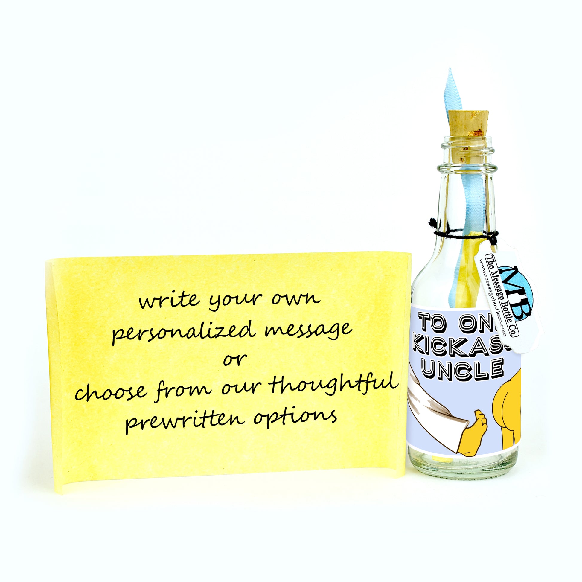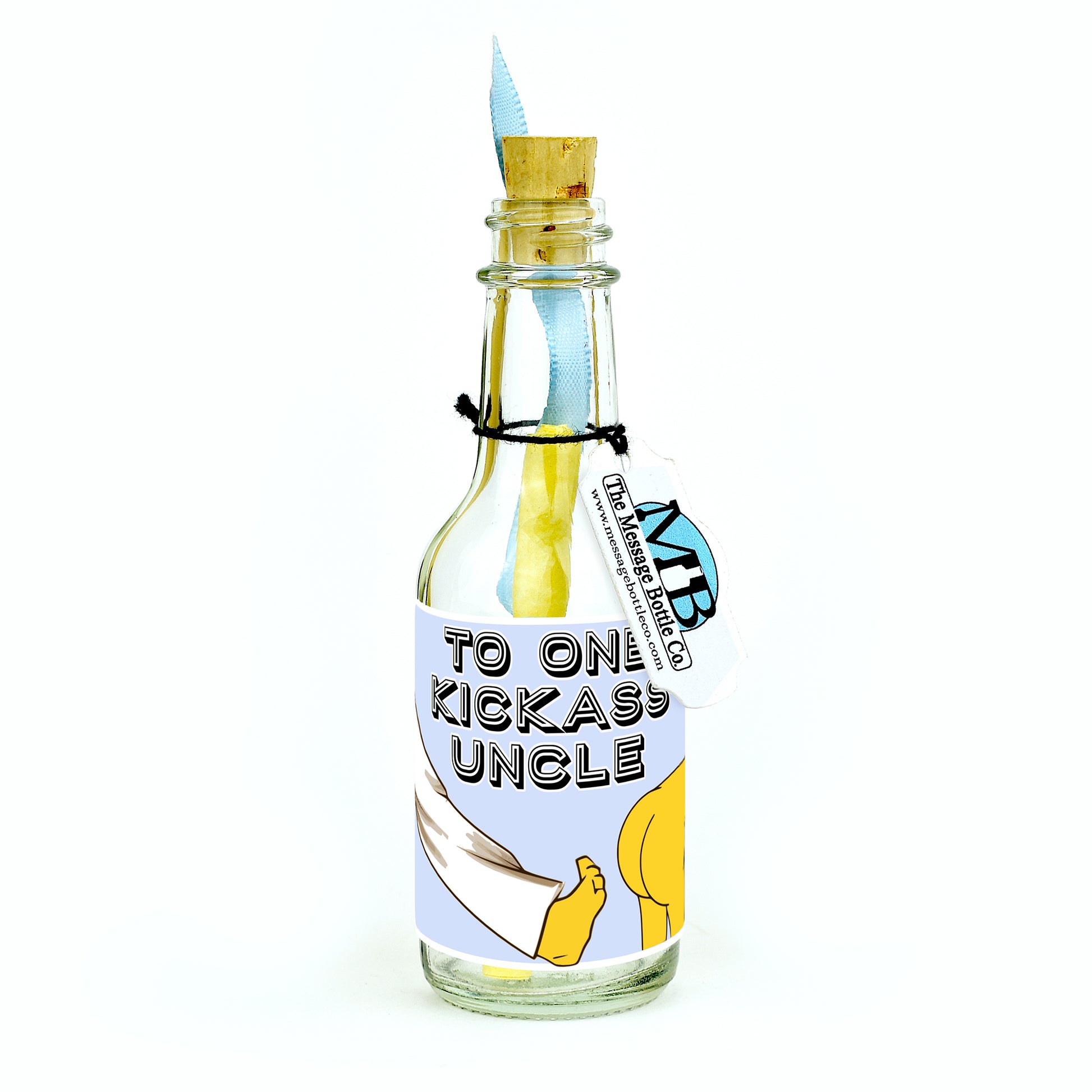 Celebrate Aunt's & Uncle's Day with a burst of energy and fun through this dynamic Message Bottle. Featuring the silhouette of a man karate kicking at a cartoon butt, the label proudly reads "To a kickass Uncle," acknowledging the unique and exciting presence of your uncle in your life.