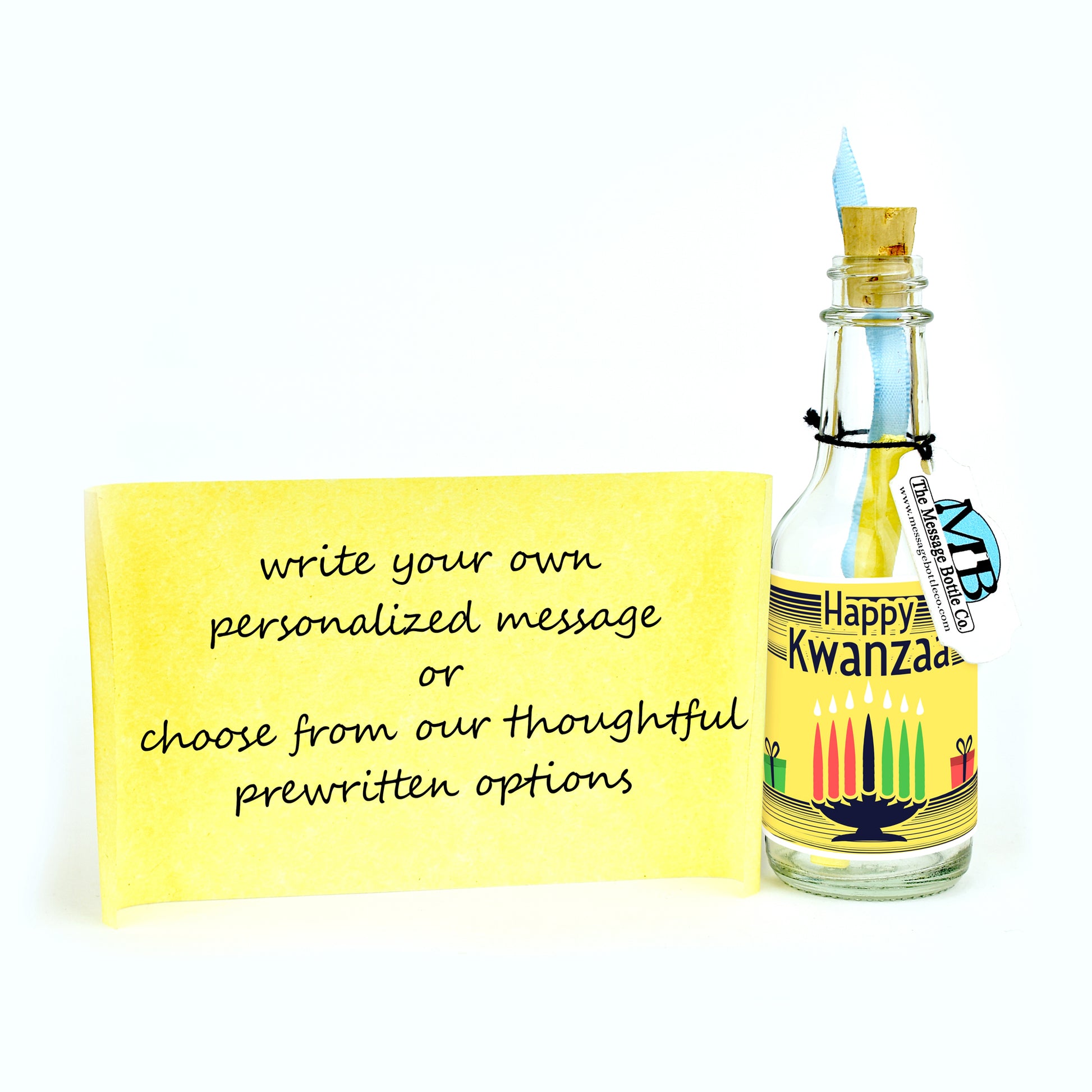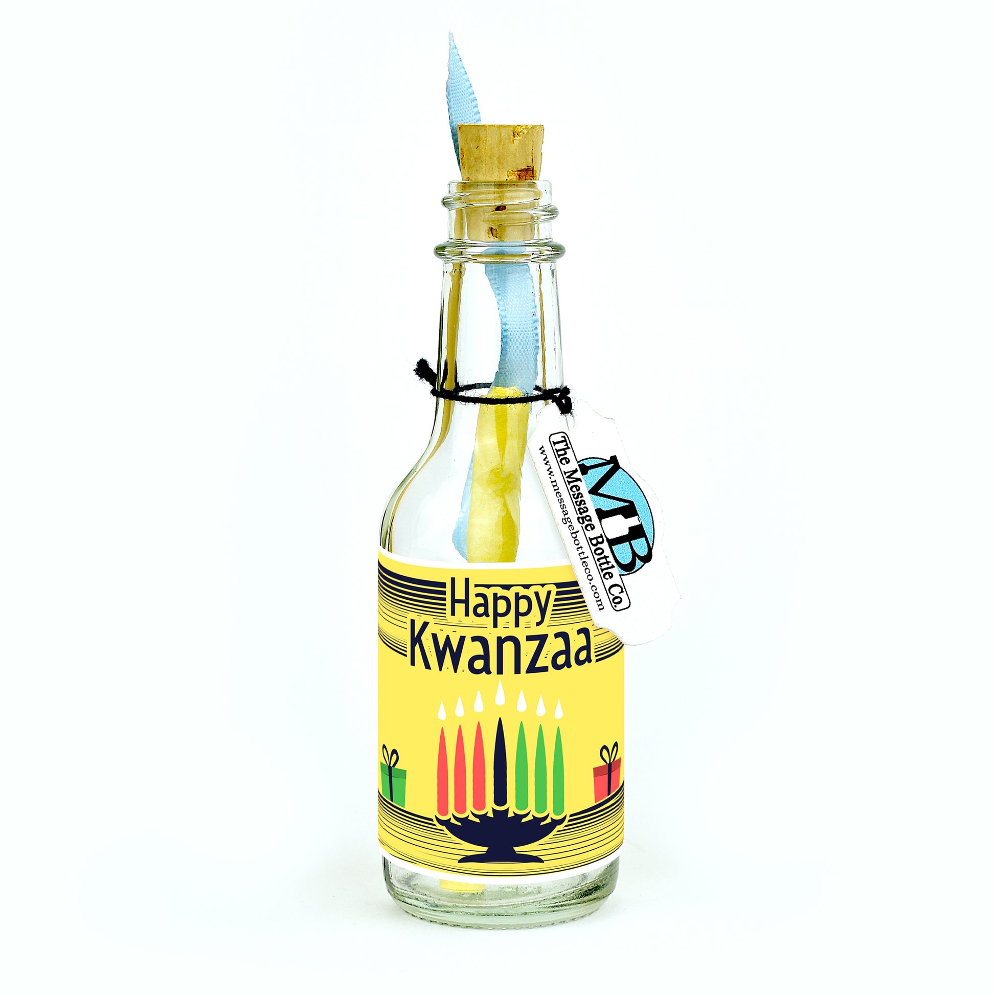 Elevate the joy of Kwanzaa with our radiant Message Bottle, featuring a captivating illustration of a lit Kwanzaa menorah set against a vibrant yellow backdrop. Adorned with gifts on either side, the label heartwarmingly reads, "Happy Kwanzaa," encapsulating the essence of this festive holiday and the spirit of togetherness it symbolizes.