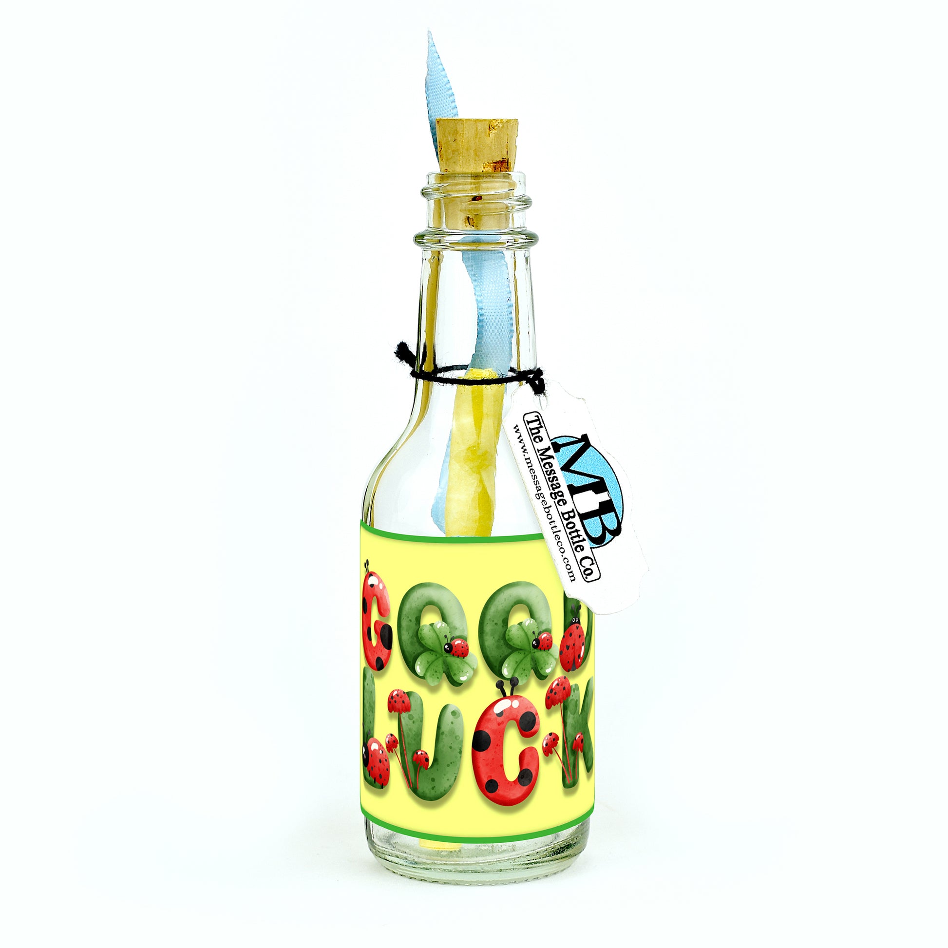 Bring a touch of charm and good fortune with our "Lady Luck" Message Bottle! The design features the phrase "Good Luck" in vibrant, illustrated letters, each adorned with a delightful ladybug theme. From the playful colors to the subtle ladybug accents, every letter carries a touch of whimsy and luck.