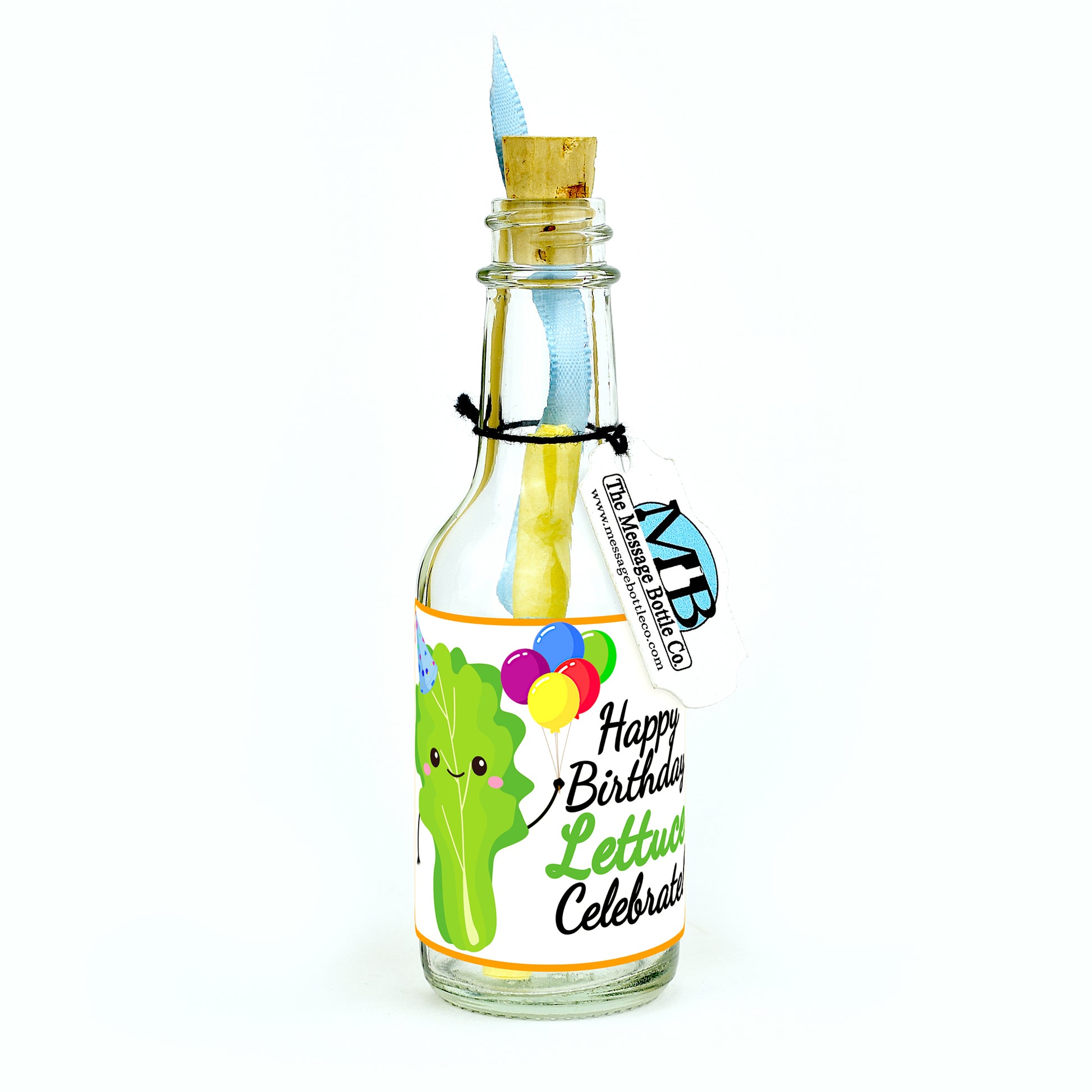 Celebrate their special day with a fresh twist using our "Lettuce Celebrate" Birthday Message Bottle. Featuring a charming cartoon lettuce wearing a party hat and holding balloons, this label reads, "Happy Birthday Lettuce Celebrate," adding a fun and pun-filled touch to their birthday wishes.