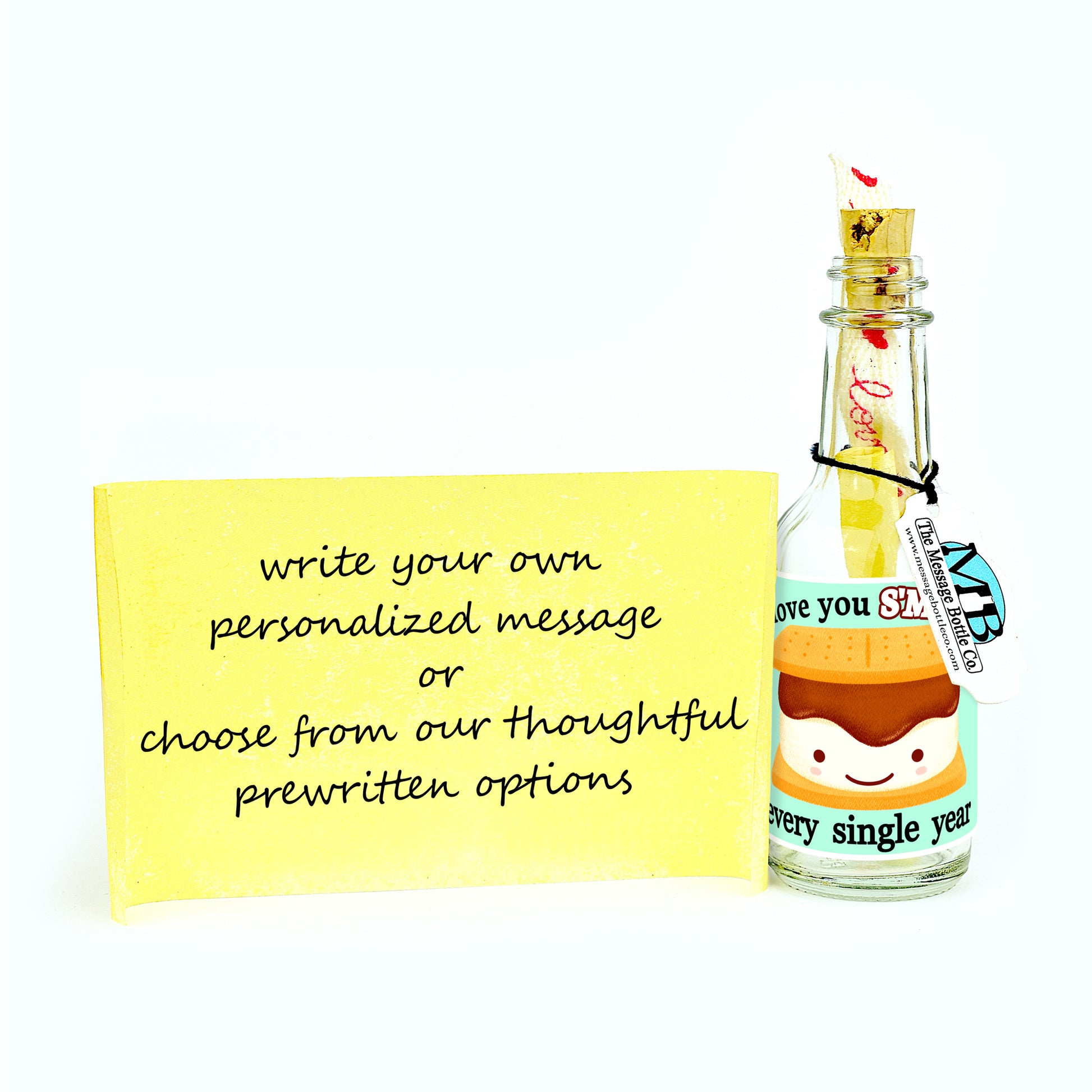 Celebrate your sweet love with our adorable "Love You S'more" Anniversary Message Bottle. Featuring a cute cartoon s'more and the playful message, "I love you s'more every single year," this label captures the warmth and joy of your ever growing relationship.