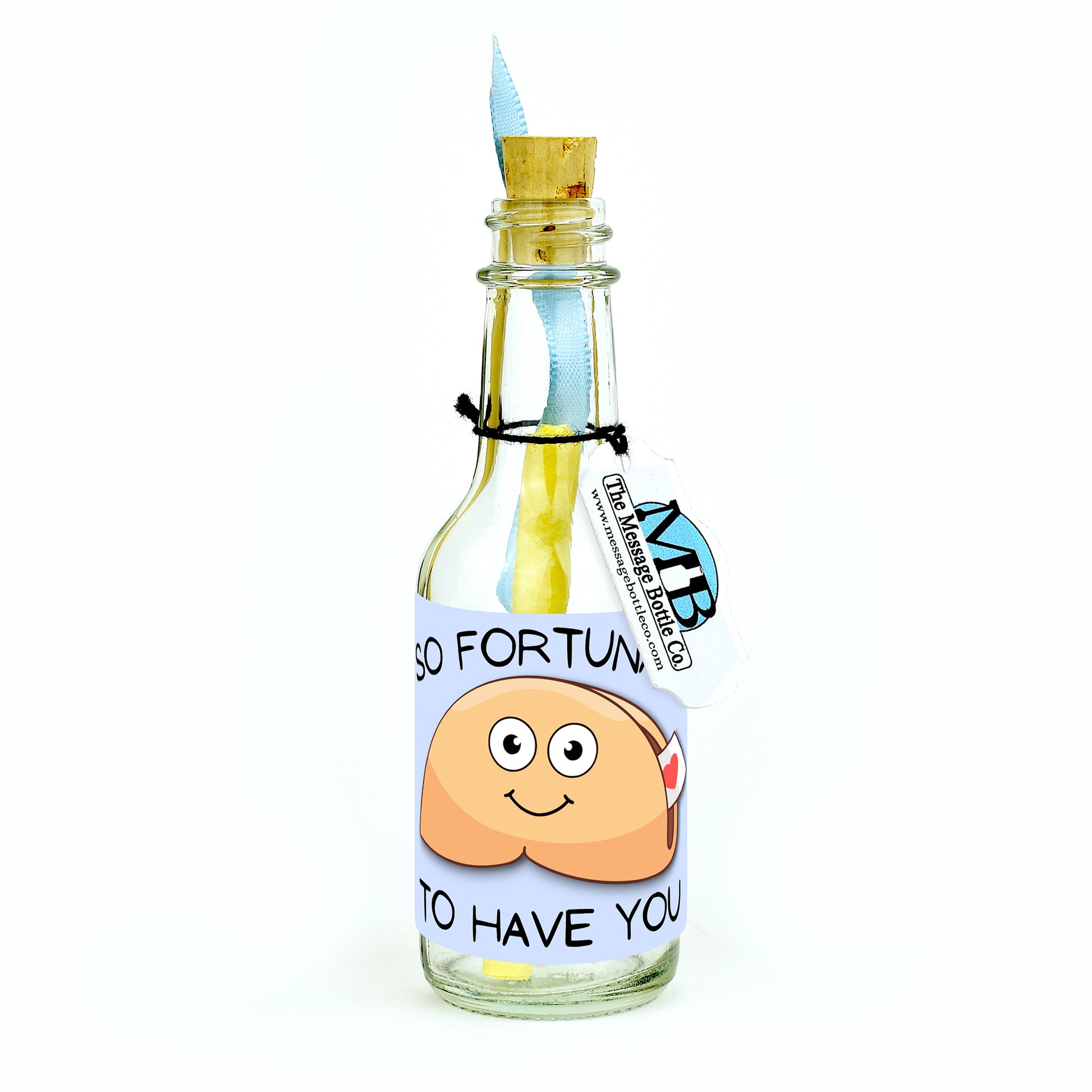 This smiling fortune cookie radiates charm, with soft lines and a playful expression that says it all. With “so fortunate to have you” front and center, this Message Bottle is a lighthearted way to show appreciation for someone who truly matters.