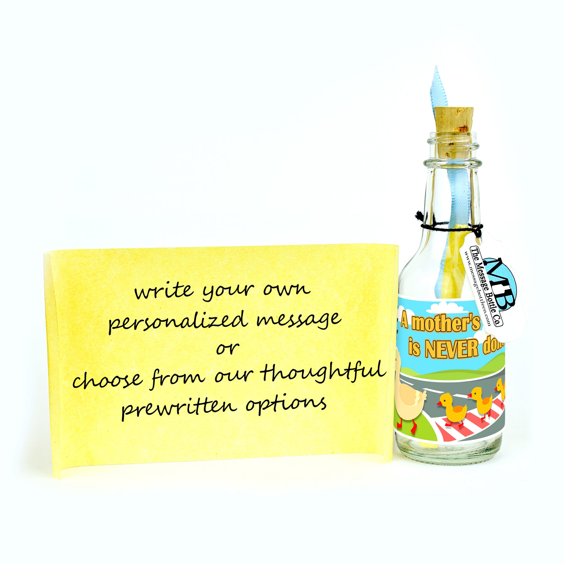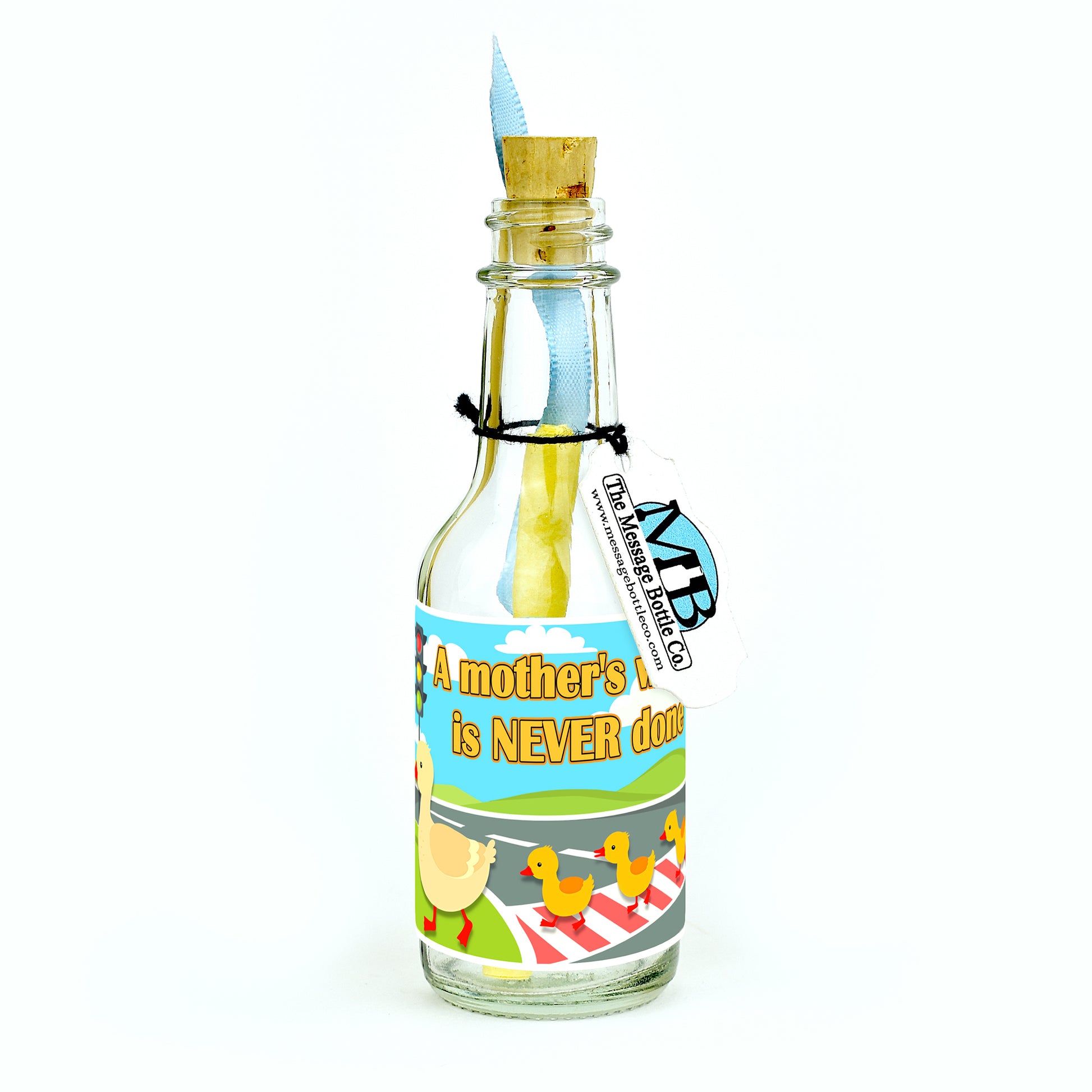 Celebrate Mom's dedication with this our "Mom's Never Done" Message Bottle greeting. Illustrated with this adorable scene of a duck and her ducklings crossing a street, this label captures the timeless essence of a mother's unwavering dedication.