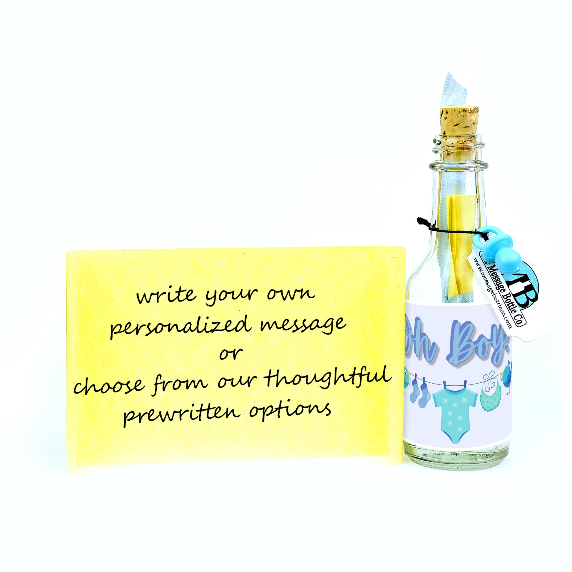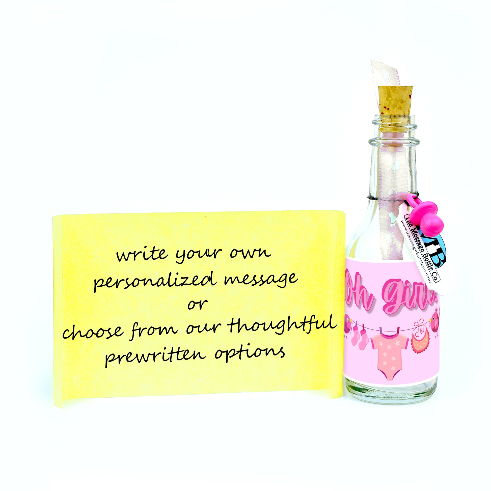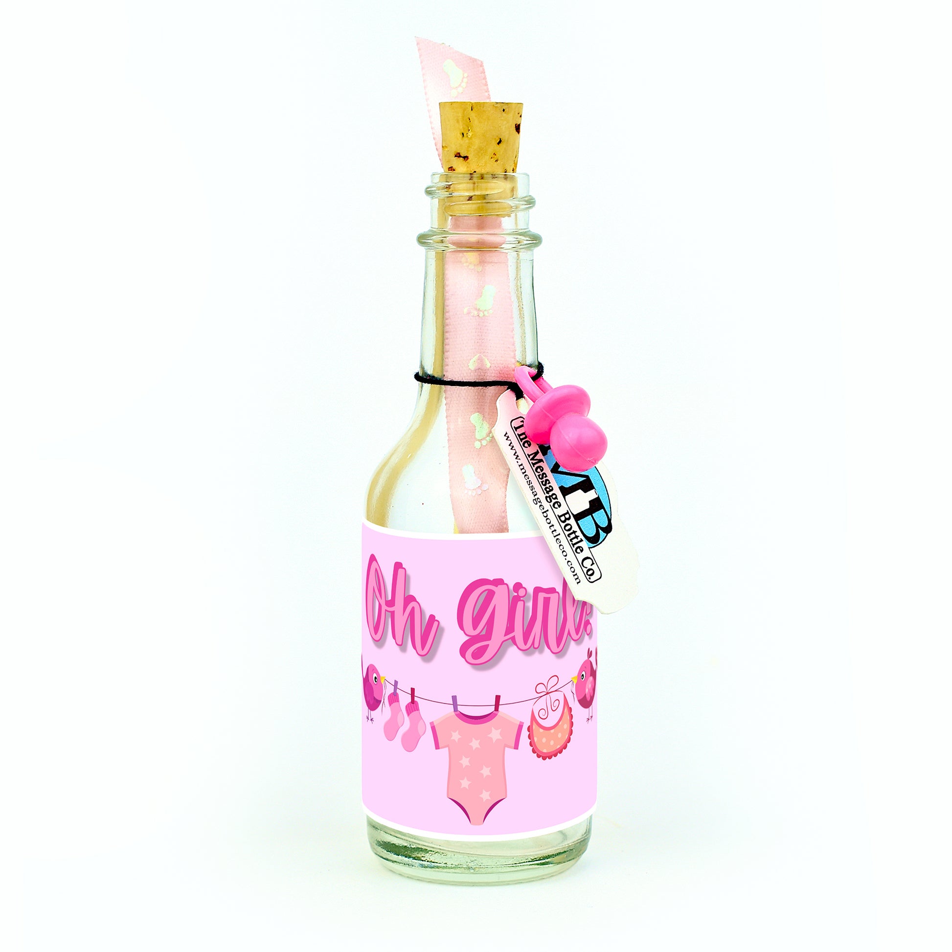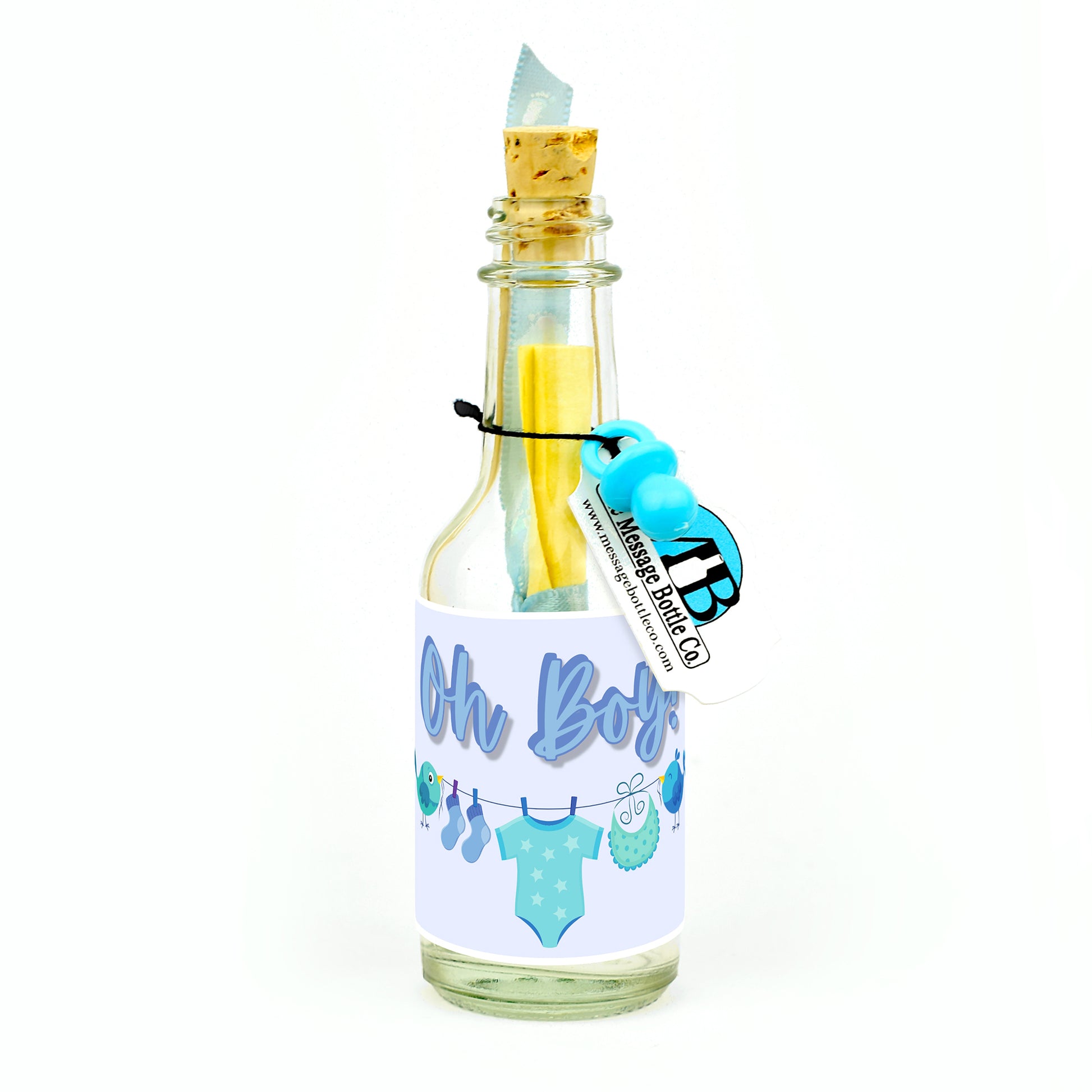 Celebrate the arrival of a new baby with our charming "Oh Baby!" Message Bottle! Available in both boy and girl variants, this design features an adorable illustration of baby clothes hanging from a clothesline, cheerfully held up by two little birds. The boy’s version sports a blue theme with tiny blue clothes, while the girl’s version is dressed in pretty pink attire.