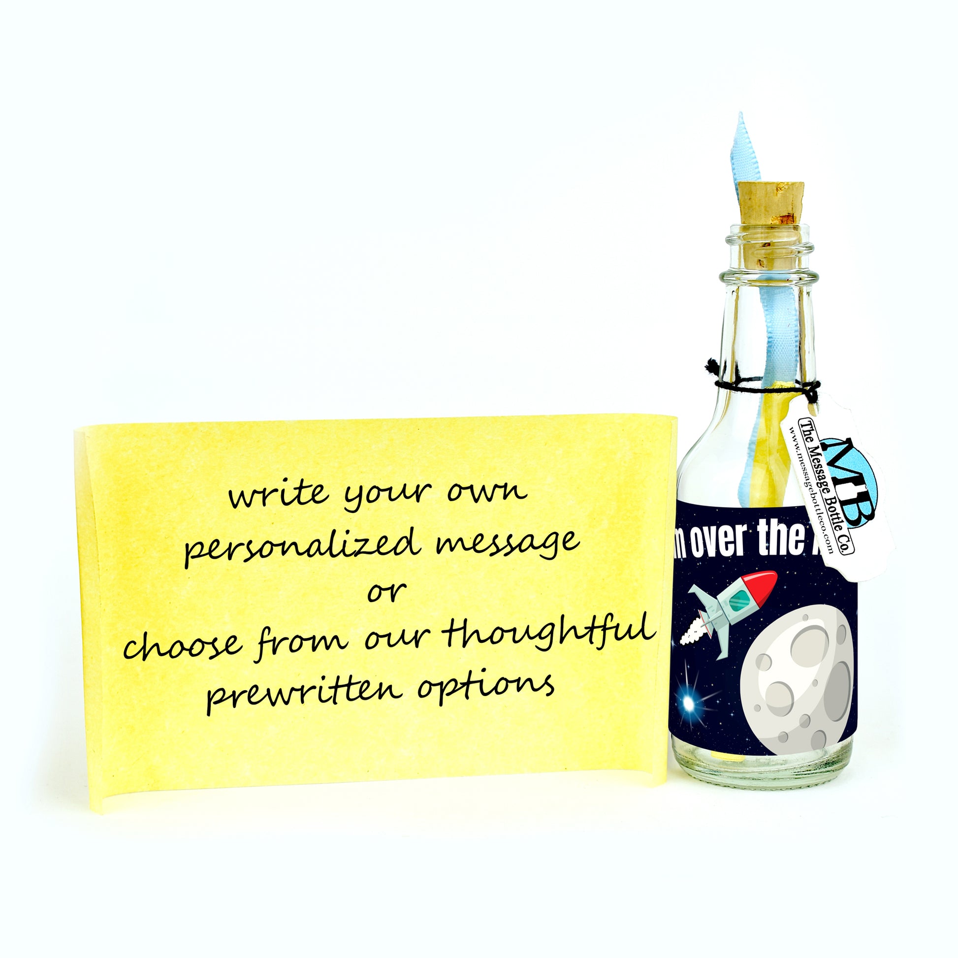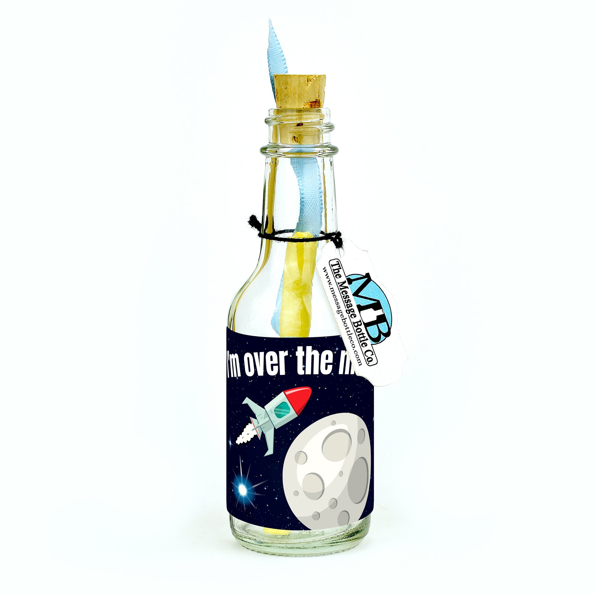 Celebrate their out-of-this-world achievement with our "Over the Moon" Congratulations Message Bottle. Featuring a rocket soaring high above the moon, this playful design perfectly captures the excitement and joy that comes with reaching new heights. It’s the ideal way to show how thrilled you are for someone’s success, whether they’ve just landed a new job, accomplished a major milestone, or reached a long-awaited goal.