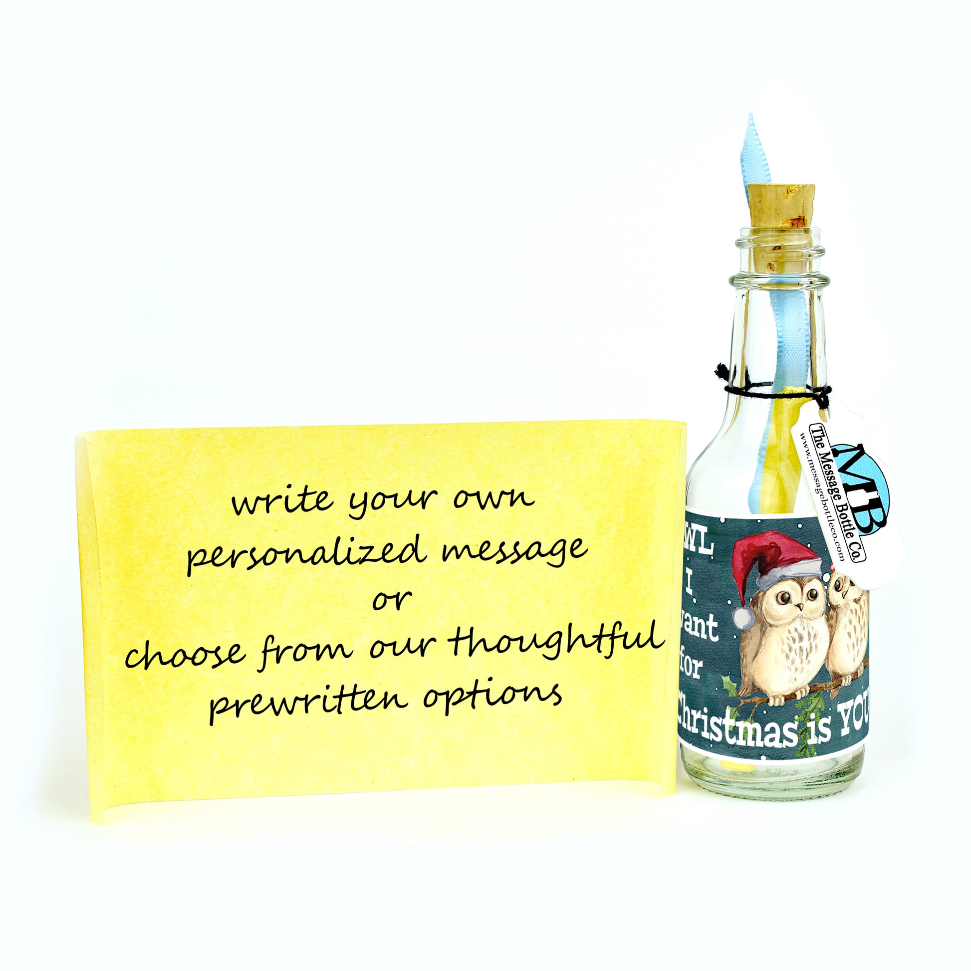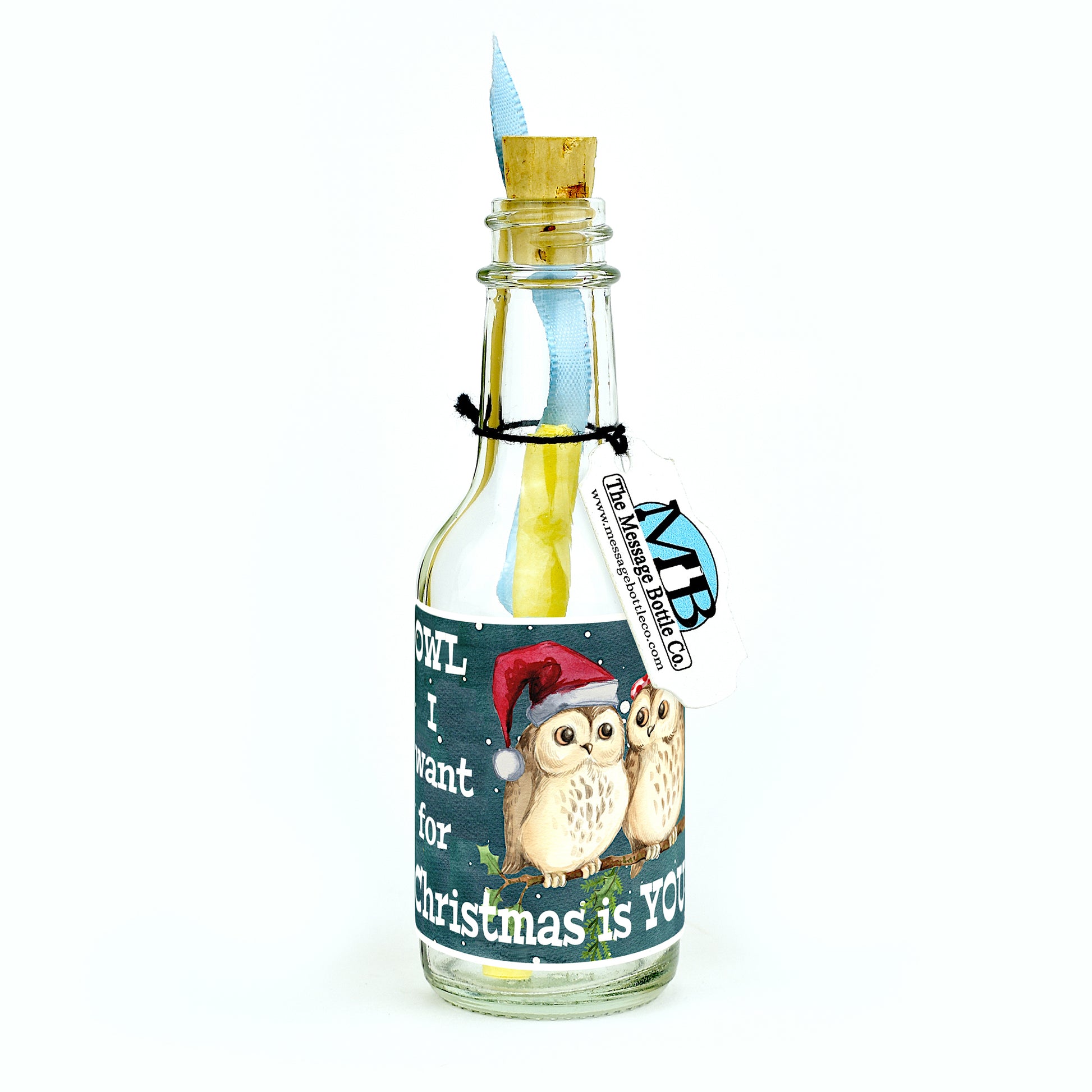 Ā Embrace the whimsical spirit of the holidays with our charming Message Bottle featuring a heartwarming illustration. Against a backdrop of a starry night sky, two festively dressed owls cuddle affectionately on a cozy branch. The endearing label reads, "OWL I Want for Christmas is YOU," expressing your affection and creating a delightful connection between the festive season and the cherished bonds you share.