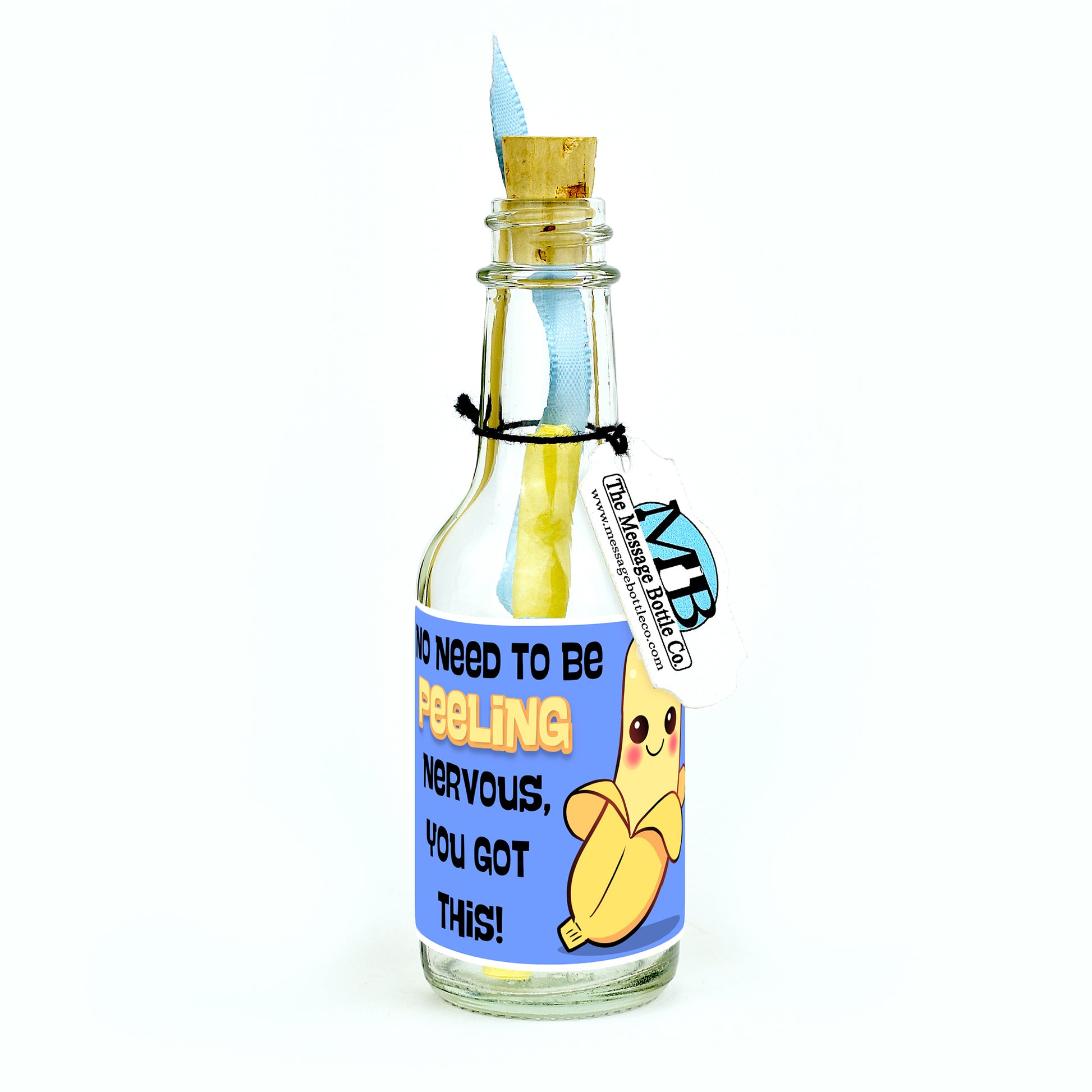 Brighten someone’s day and ease their nerves with our charming "No Need to Be Peeling Nervous" Message Bottle! Featuring an adorable half-peeled banana, this delightful design is as cute as it is comforting. The playful text, "No need to be peeling nervous, you got this!" adds a touch of humor and encouragement, making it a fun and uplifting gift.