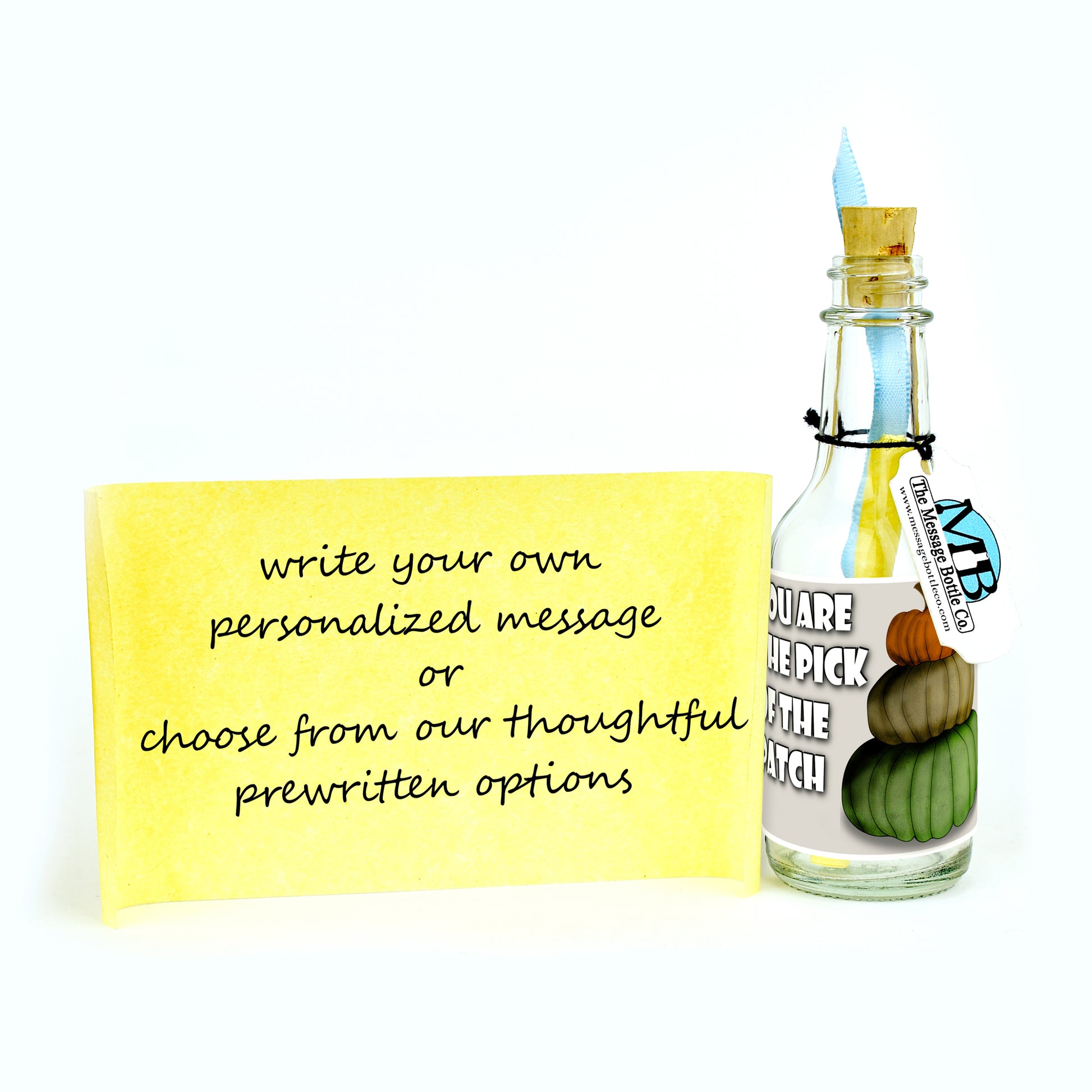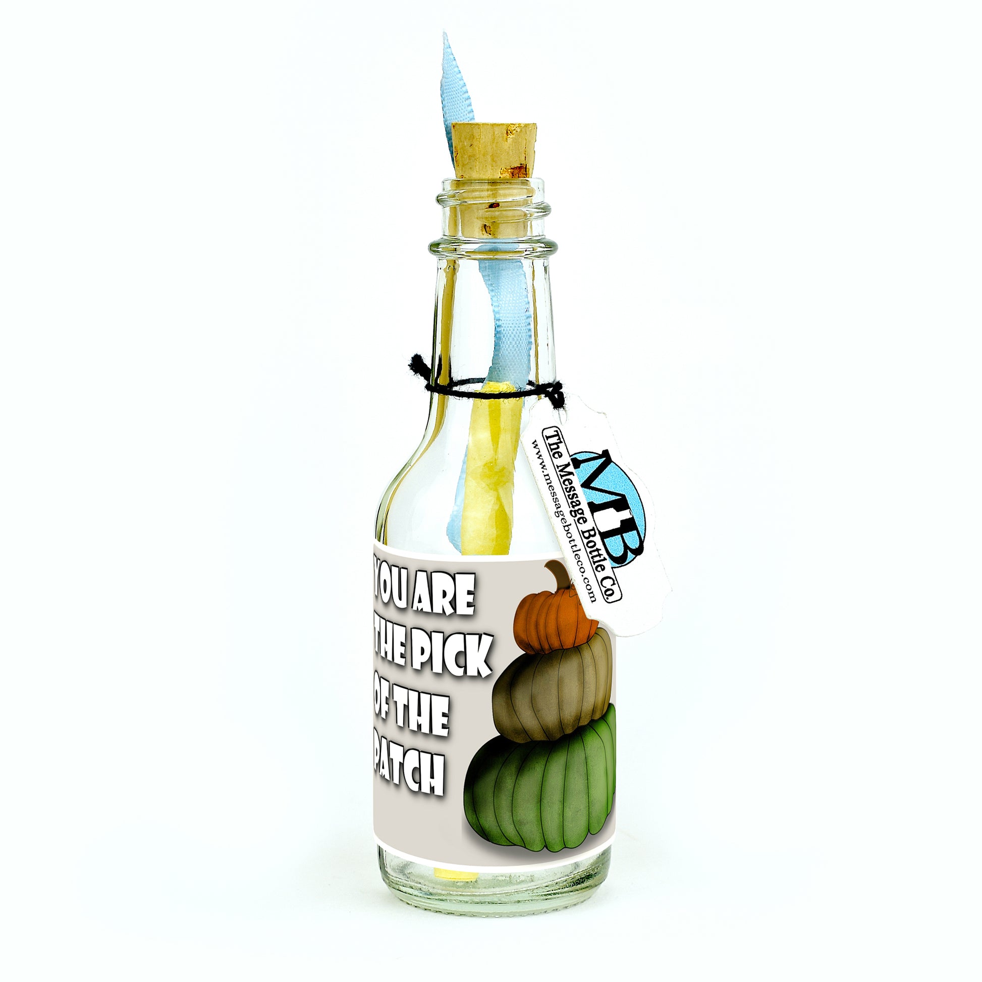 Celebrate the pumpkin-spiced charm of Halloween with our delightful Message Bottle featuring three pumpkins stacked on top of one another. The label heartwarmingly reads "You are the pick of the patch," expressing your affection in a festive and playful way.