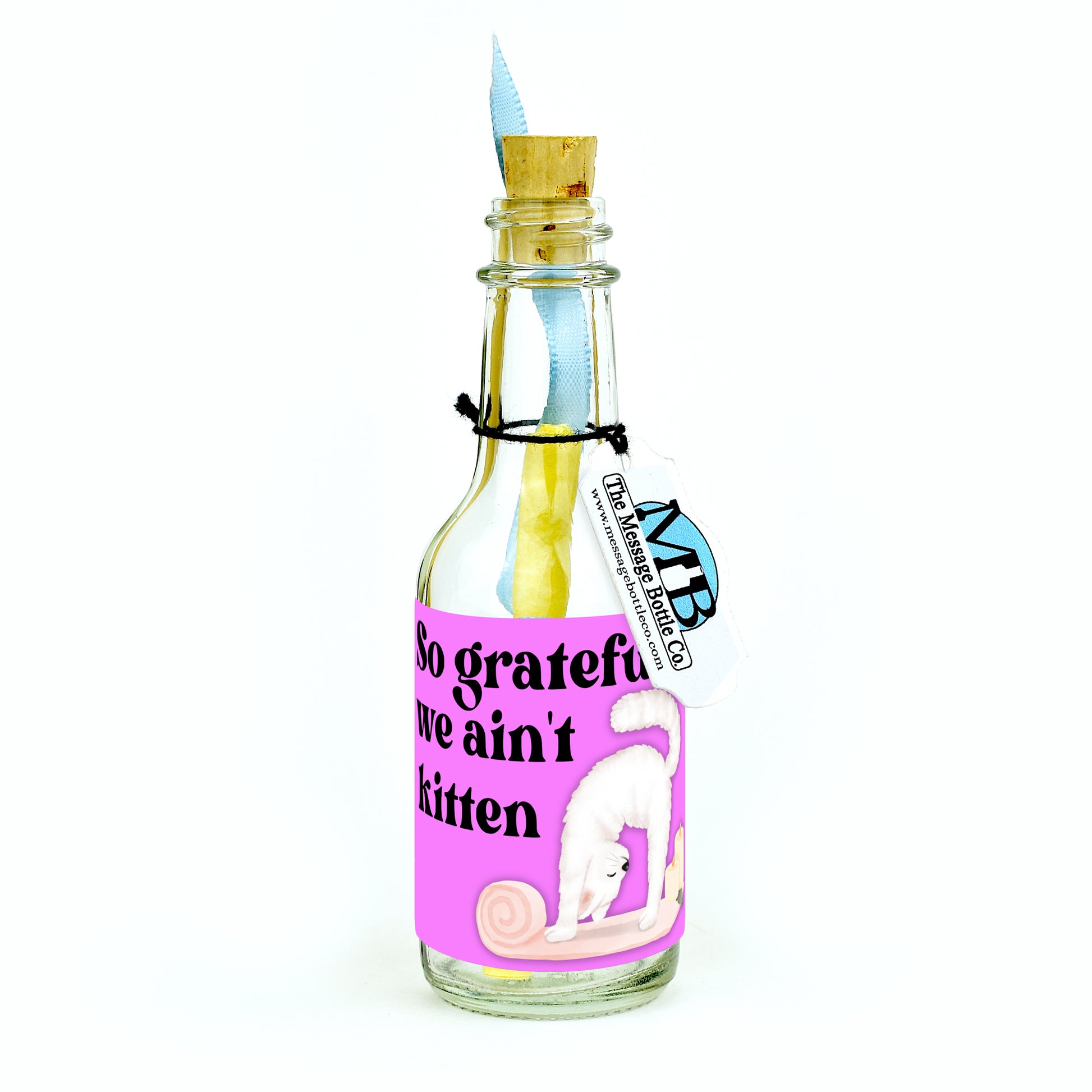 A playful nod to strength and camaraderie, the “Purr-fectly Grateful” Message Bottle pairs charm with motivation. A cute cartoon cat stretches in a yoga-like pose on a mat, radiating energy and gratitude, while the highlighted “Thank You” captures the spirit of encouragement and appreciation.