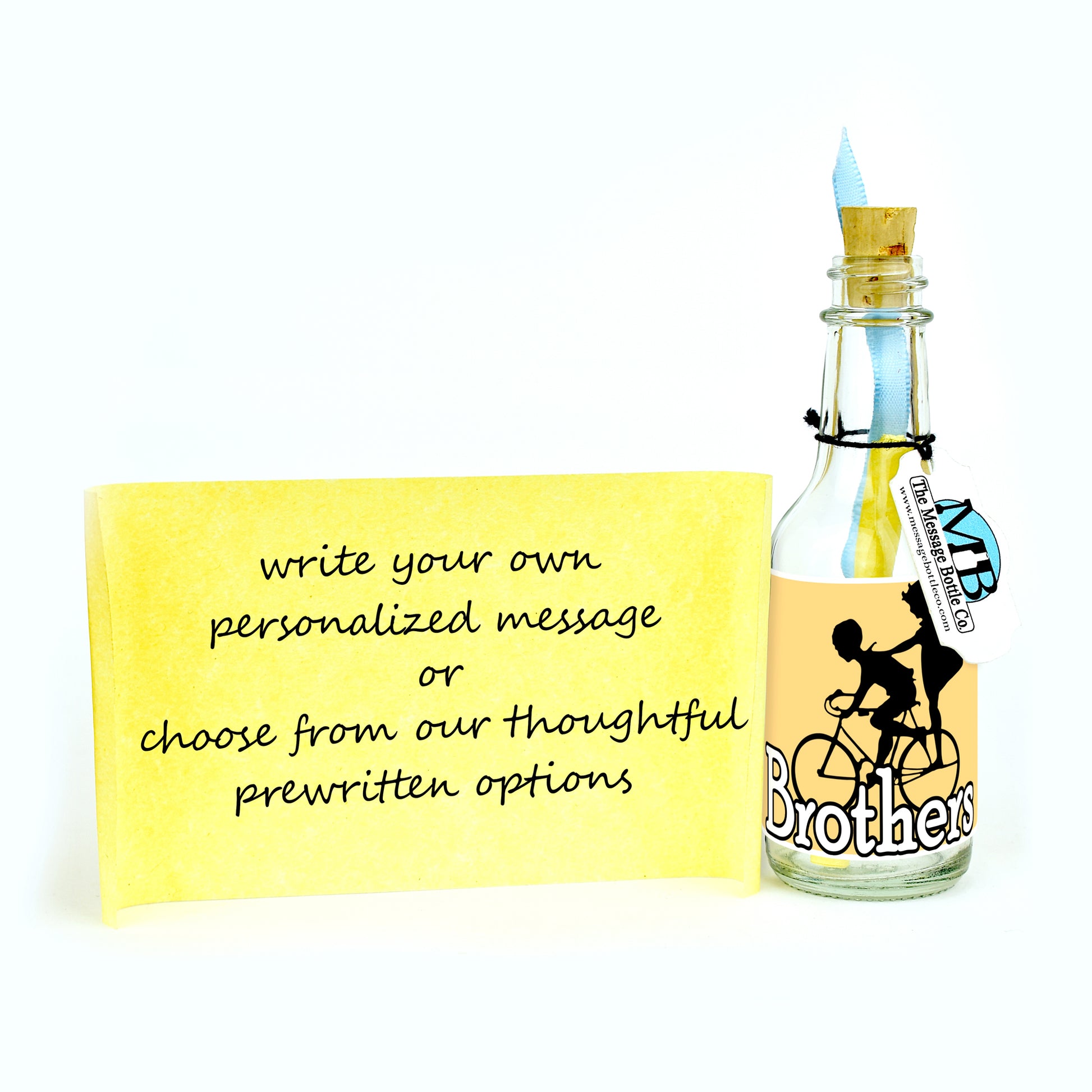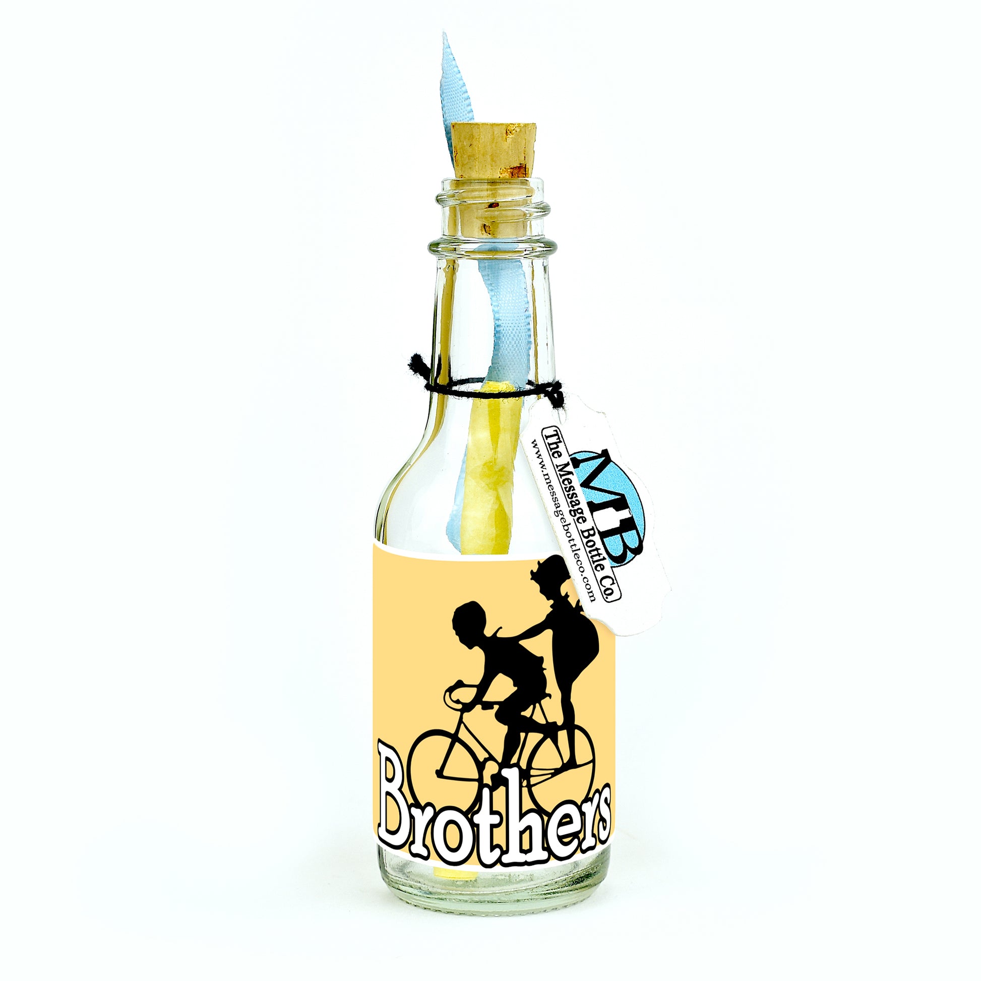 Celebrate the special bond between siblings on Sibling's Day with this heartwarming Message Bottle. Featuring the silhouette of a little boy riding a bike with his sister on the back pegs, the label conveys the sentiment "Brothers," capturing the shared adventures and support.
