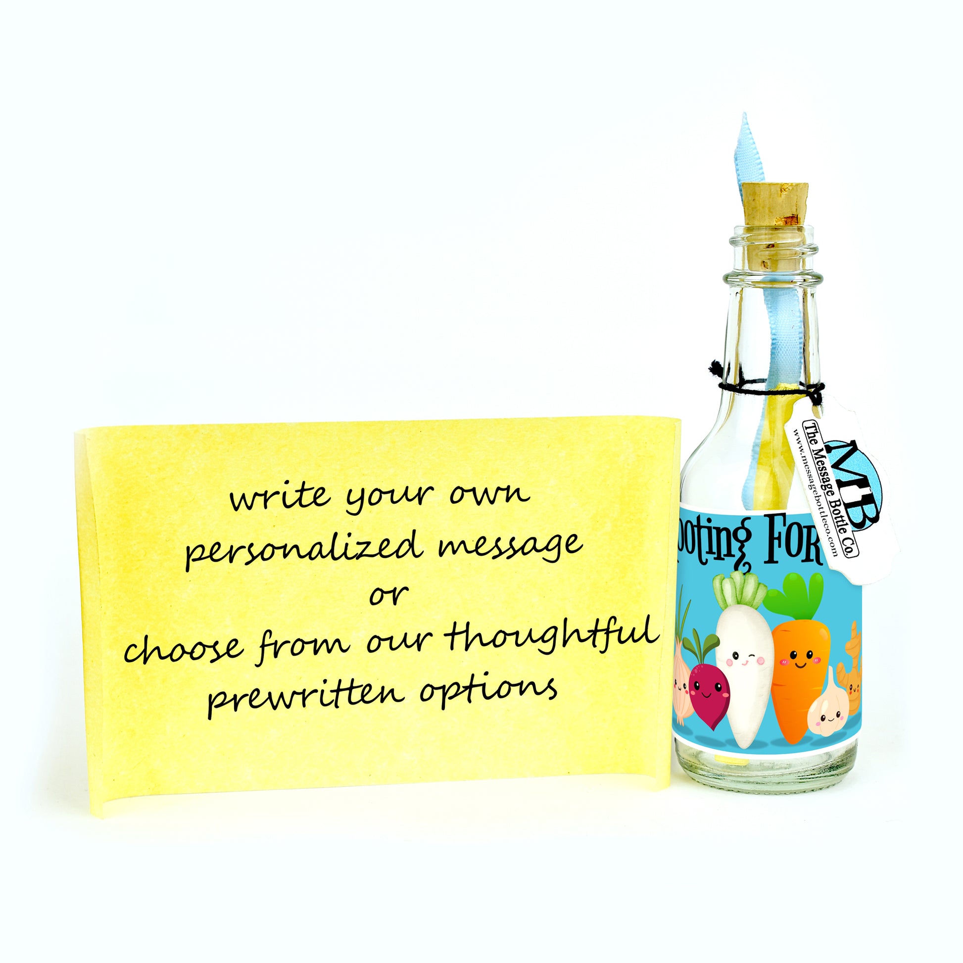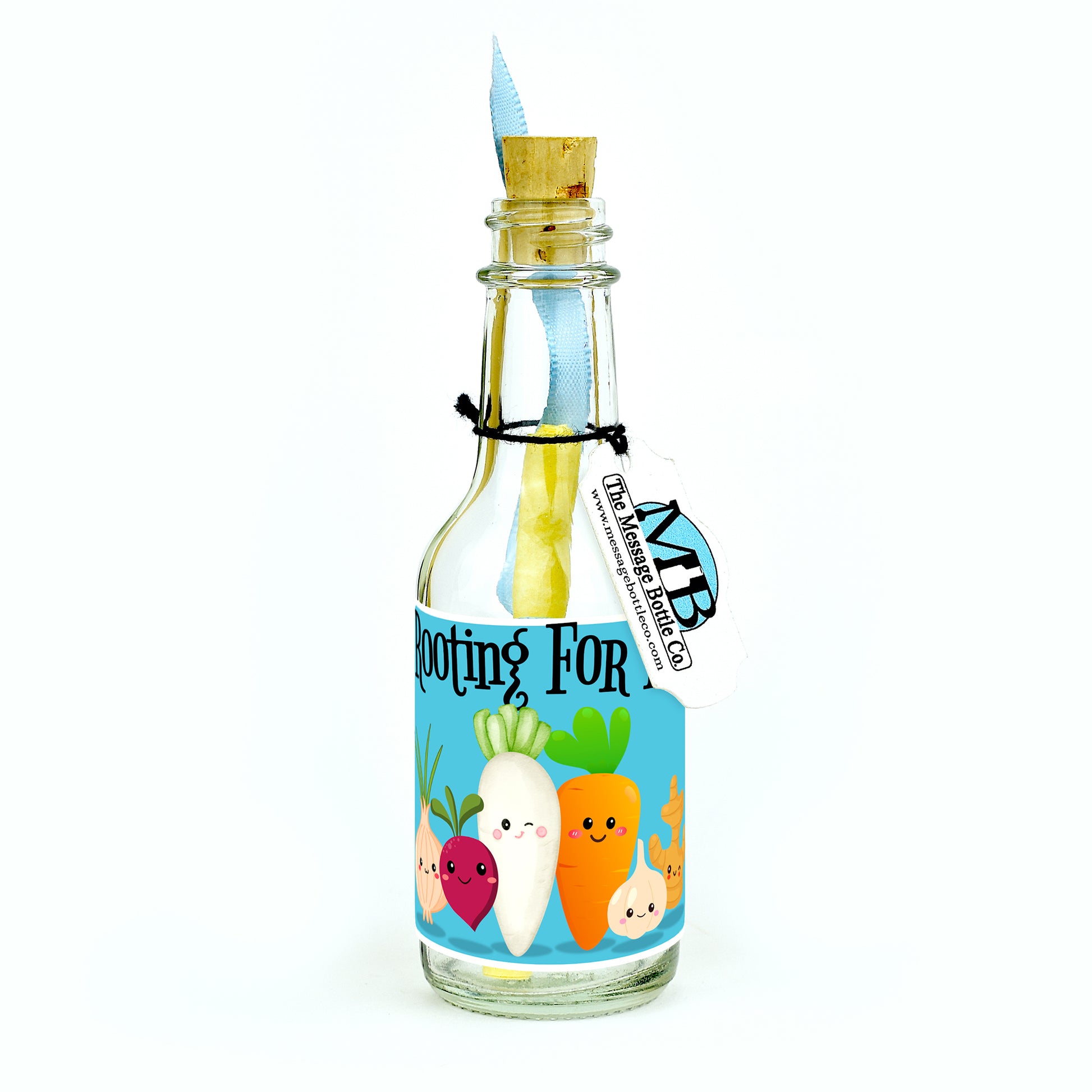Cheer them on in the most delightful way with our "Rooting for You" Message Bottle! This charming design features a group of smiling cartoon root vegetables - a carrot, beet, white radish, ginger and more - each sporting a big, encouraging grin. The playful text, "Rooting for You," adds a fun twist to your heartfelt support.