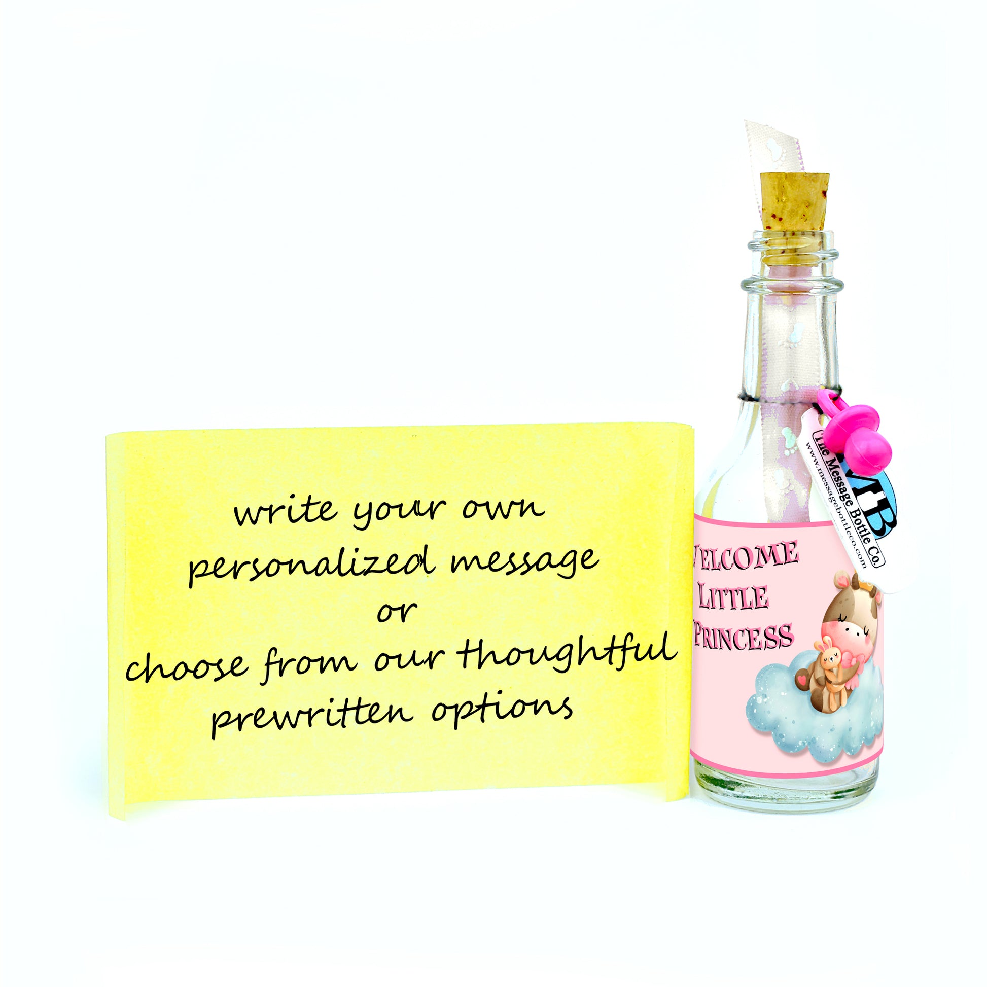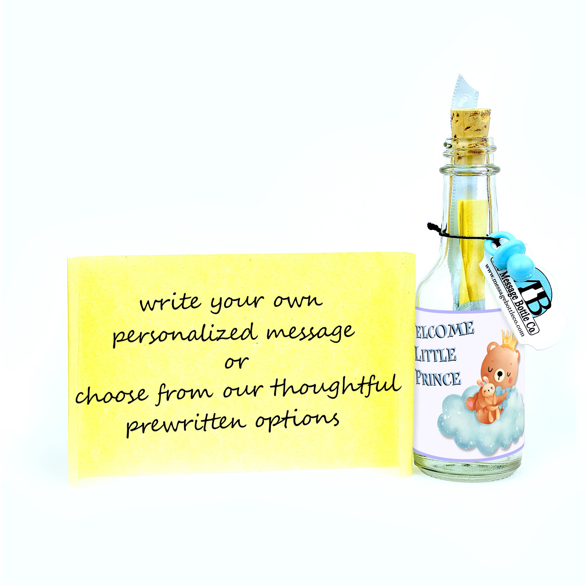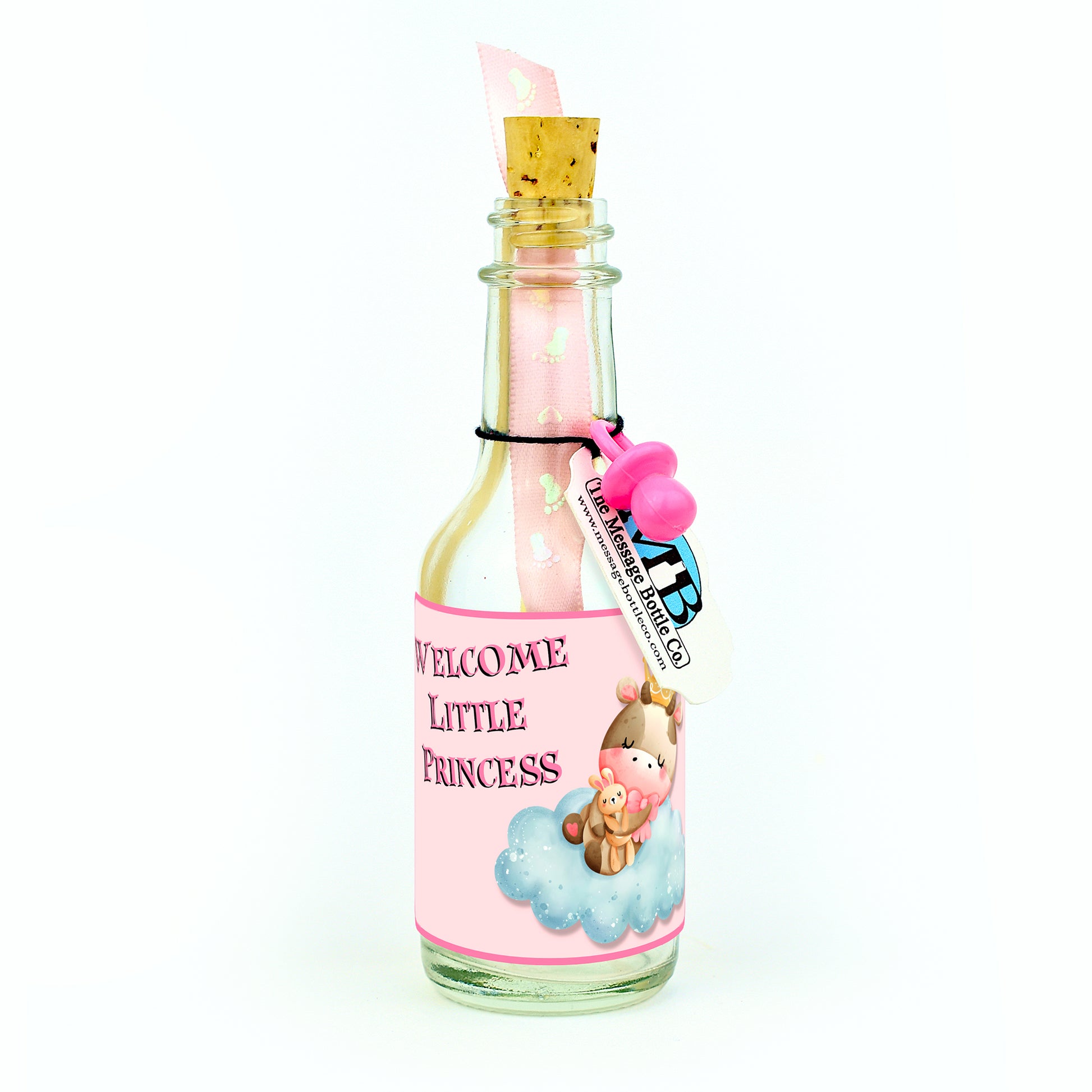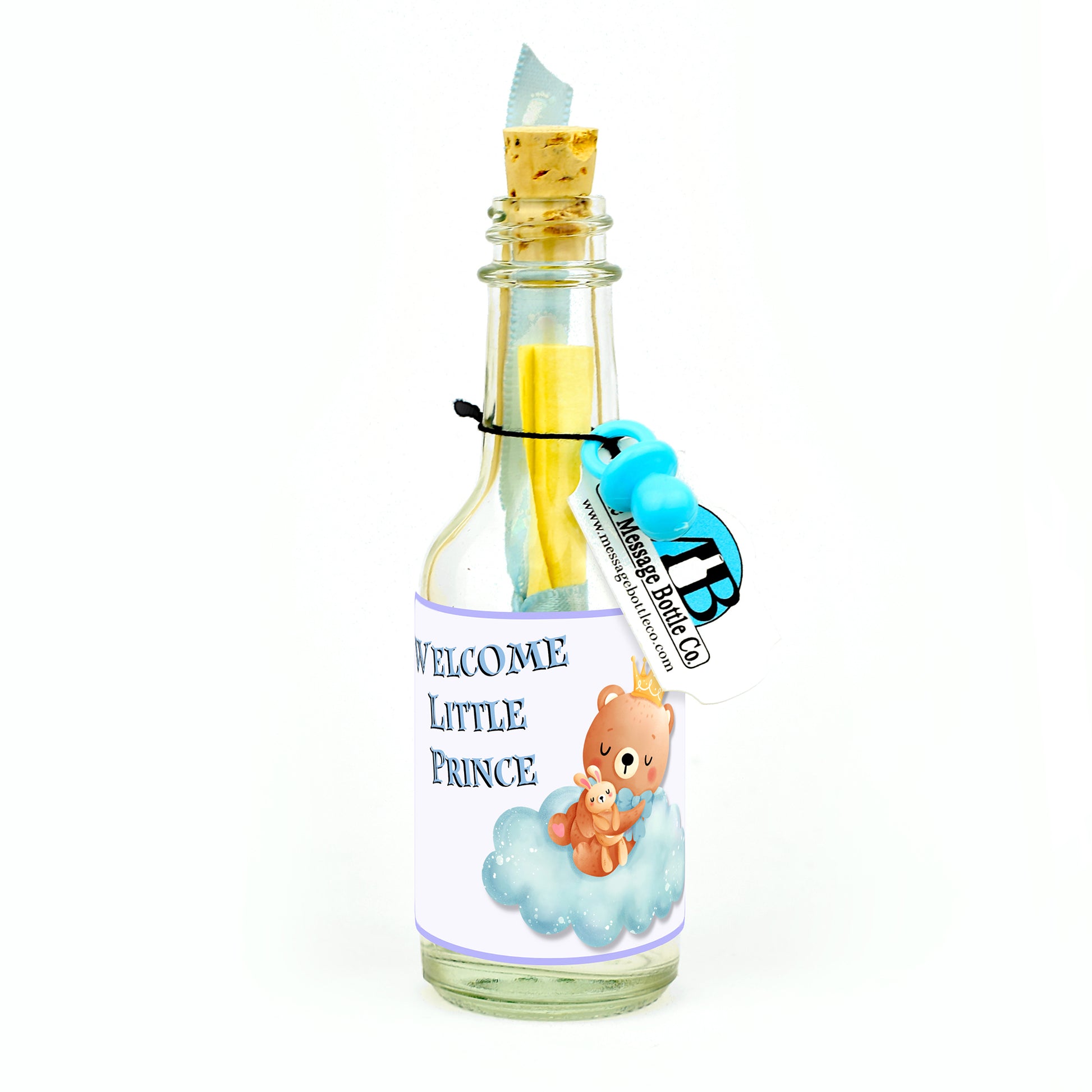 Celebrate the arrival of a new baby with our charming Message Bottles, available in two delightful variants. The "Welcome Little Prince" version features an adorable cartoon bear, crowned and seated on a fluffy cloud, making a regal and heartwarming statement for a baby boy. Meanwhile, the "Welcome Little Princess" version showcases a sweet cartoon cow, also crowned and perched on a cloud, perfect for welcoming a baby girl with a touch of royalty.