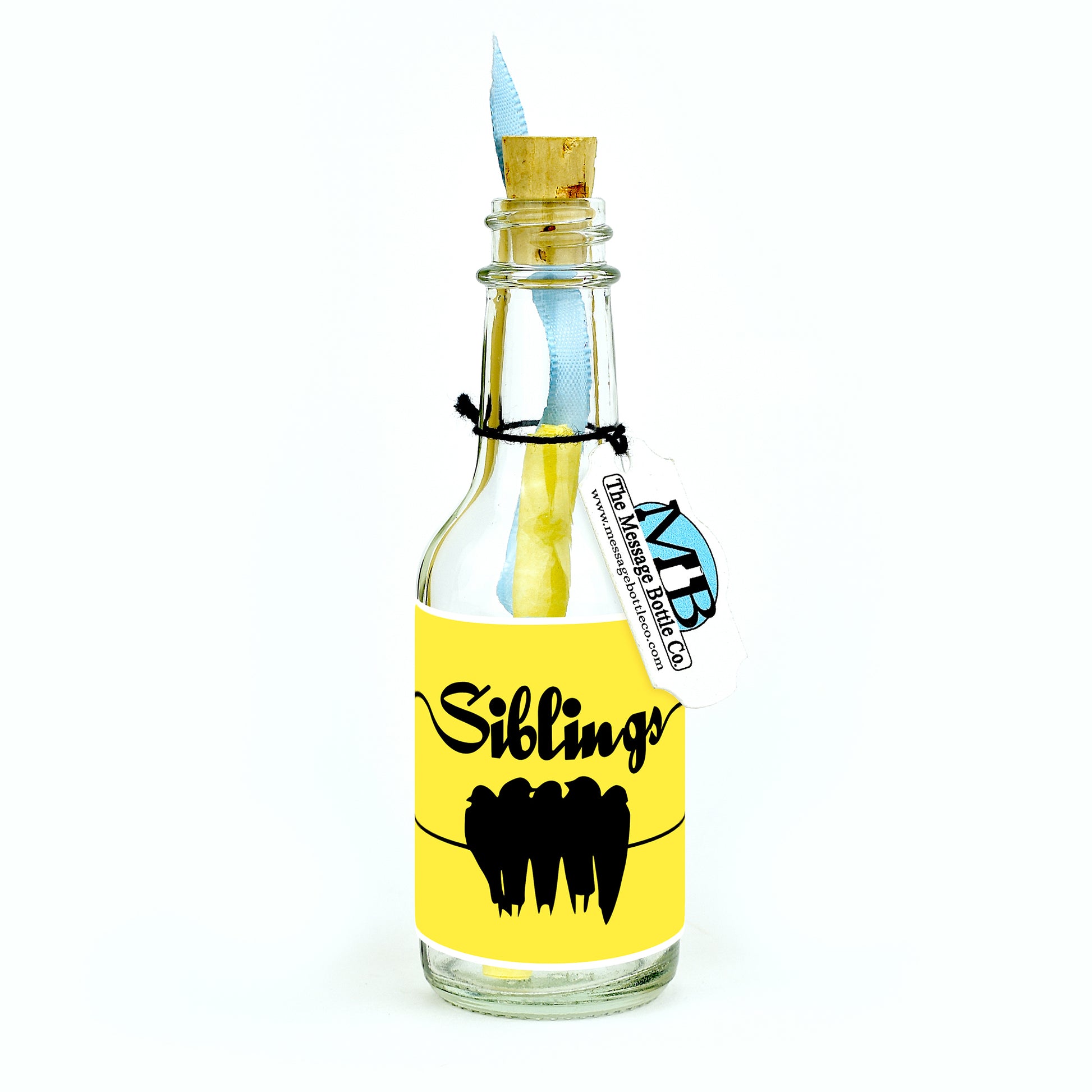Celebrate the unique connection and unity of siblings on Sibling's Day with this symbolic Message Bottle. Featuring the silhouette of birds huddled together on a power line, the label conveys the simple word "Siblings" above them, capturing the togetherness and harmony that siblings bring into each other's lives.