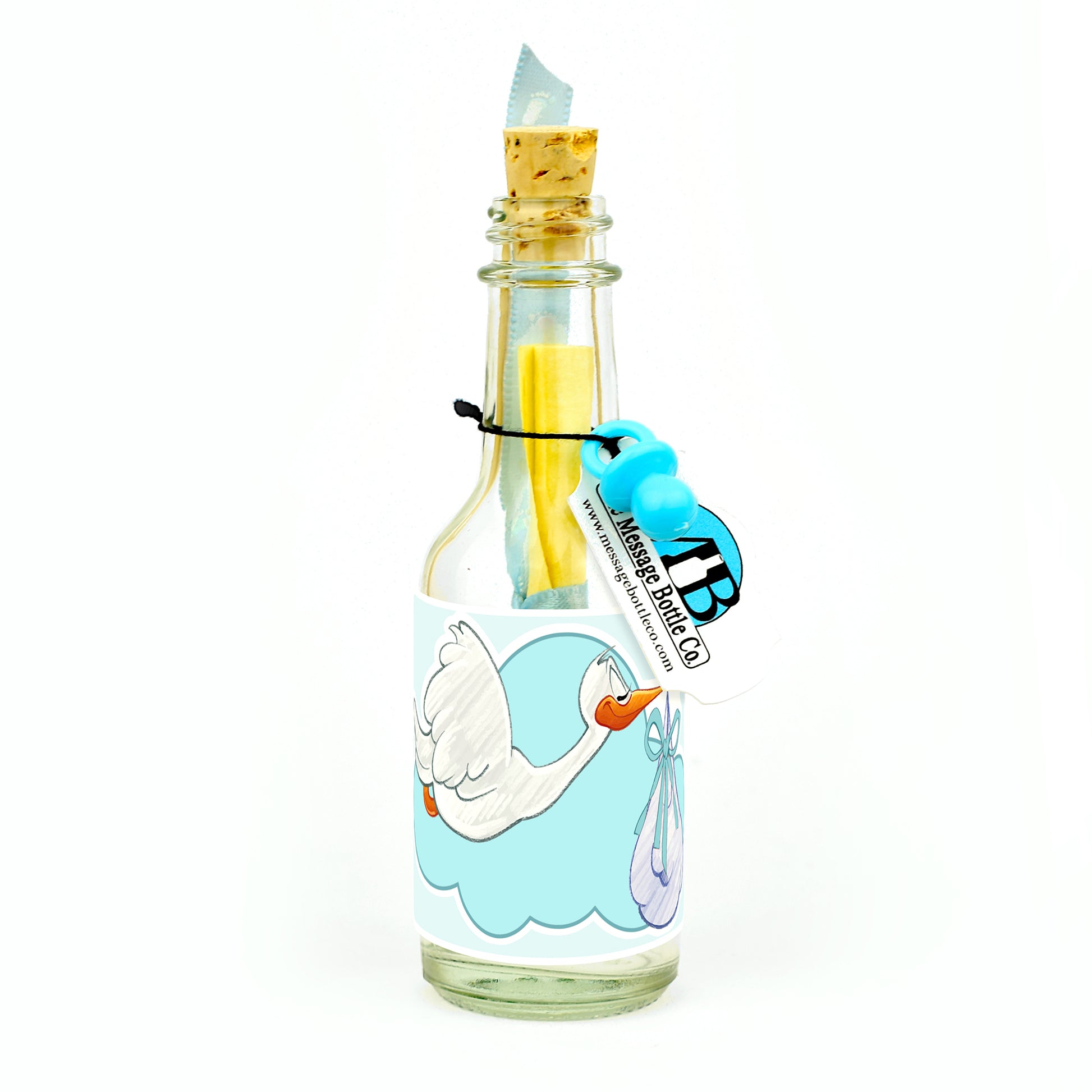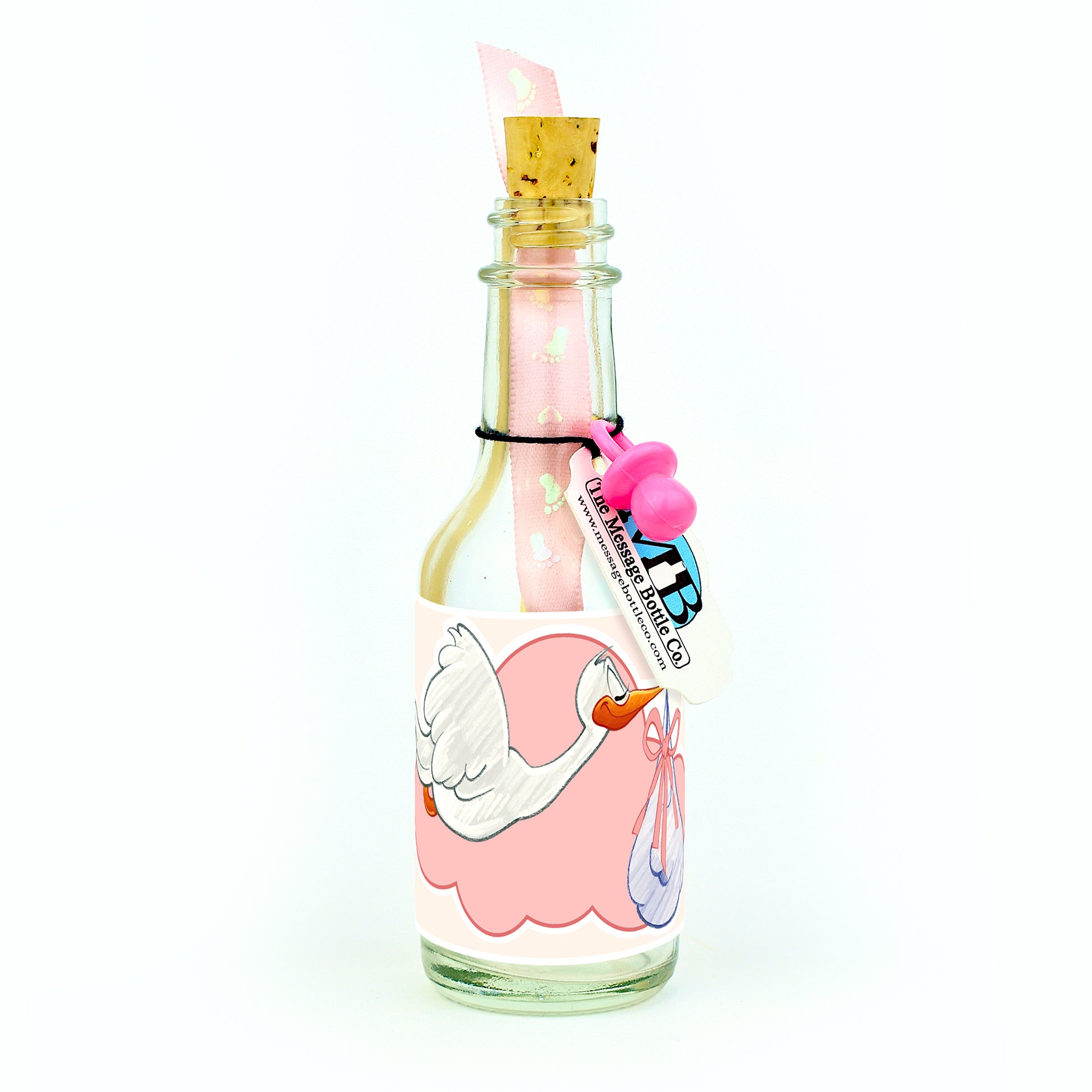 Celebrate the arrival of a new bundle of joy with our "Special Delivery" Message Bottle. Featuring a charming stork in flight carrying a precious bundle, this design captures the excitement and joy of welcoming a new baby. Available in two delightful variants: one with a blue stork for baby boys and one with a pink stork for baby girls.