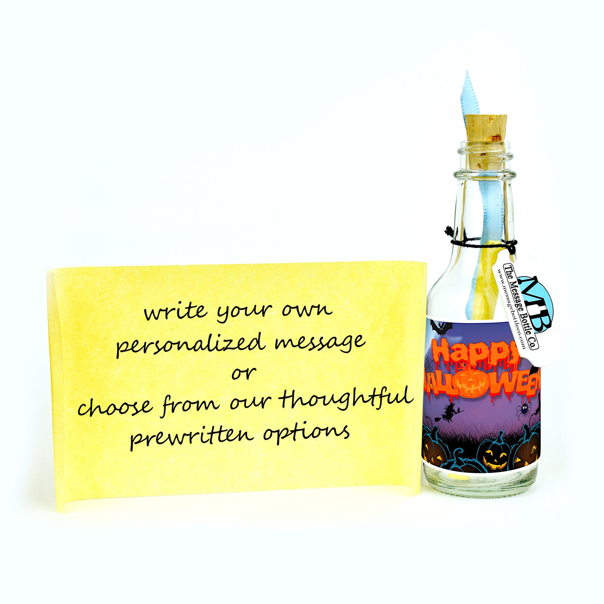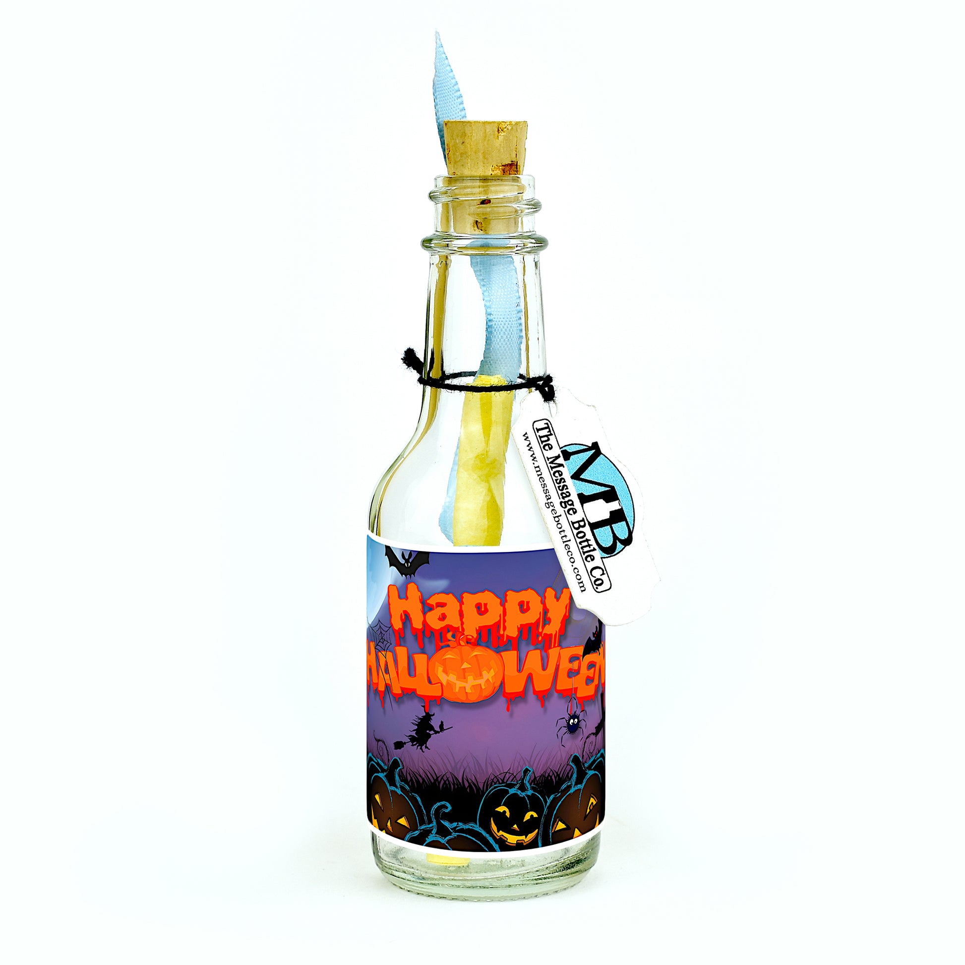 Step into the enchanting world of Halloween with our captivating Message Bottle featuring a spooky pumpkin patch adorned with jack-o-lanterns, spiders, bats, and the silhouette of a flying witch. The label gleefully reads "Happy Halloween," capturing the eerie excitement of the season.